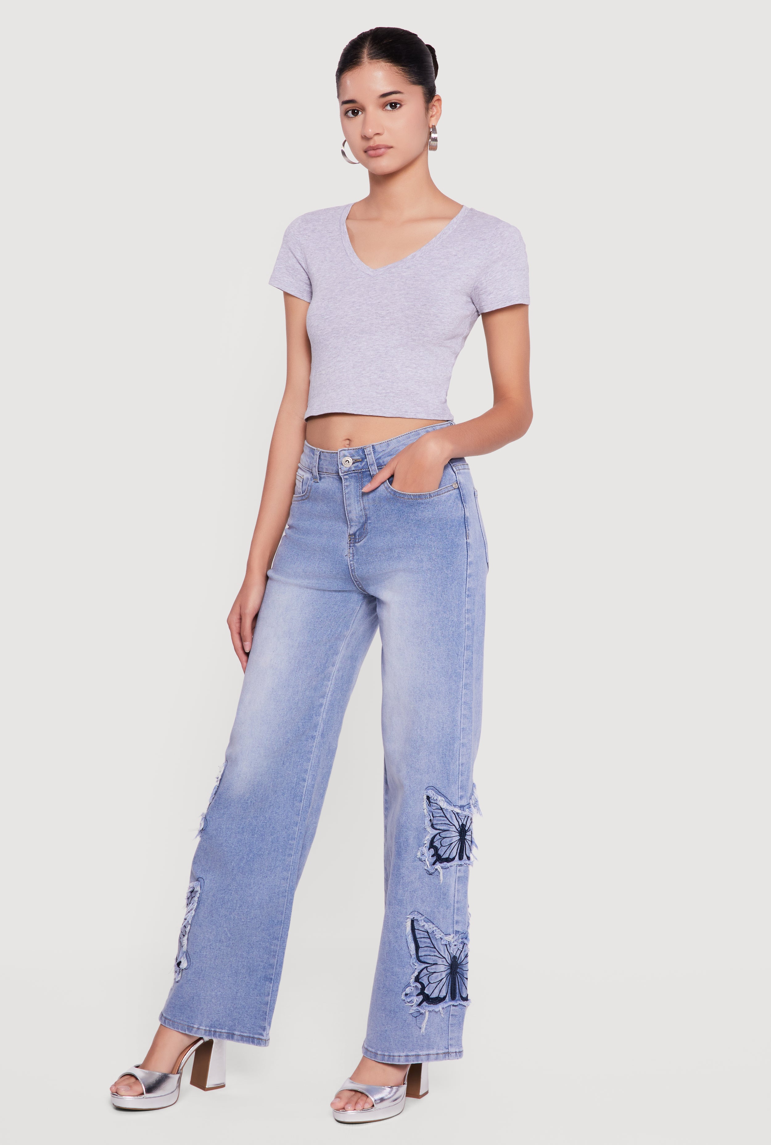 Embroidered Butterfly Graphic Frayed Wide Leg Jeans