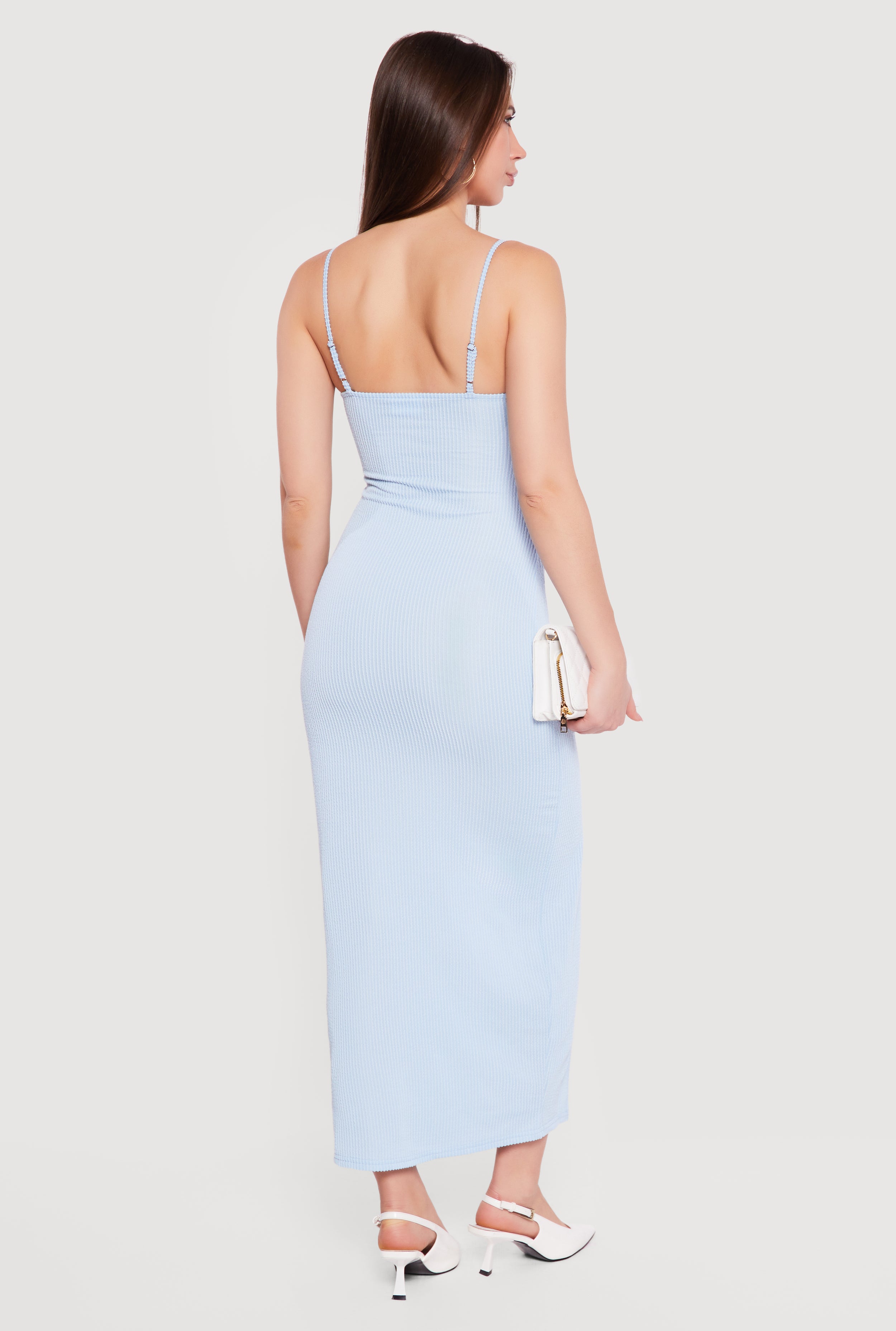 This mid-length dress features a classic scoop neckline and adjustable spaghetti straps for a personalized fit. Crafted from ribbed knit fabric, it offers a timeless silhouette with a front slit that adds a subtle edge to casual styling.