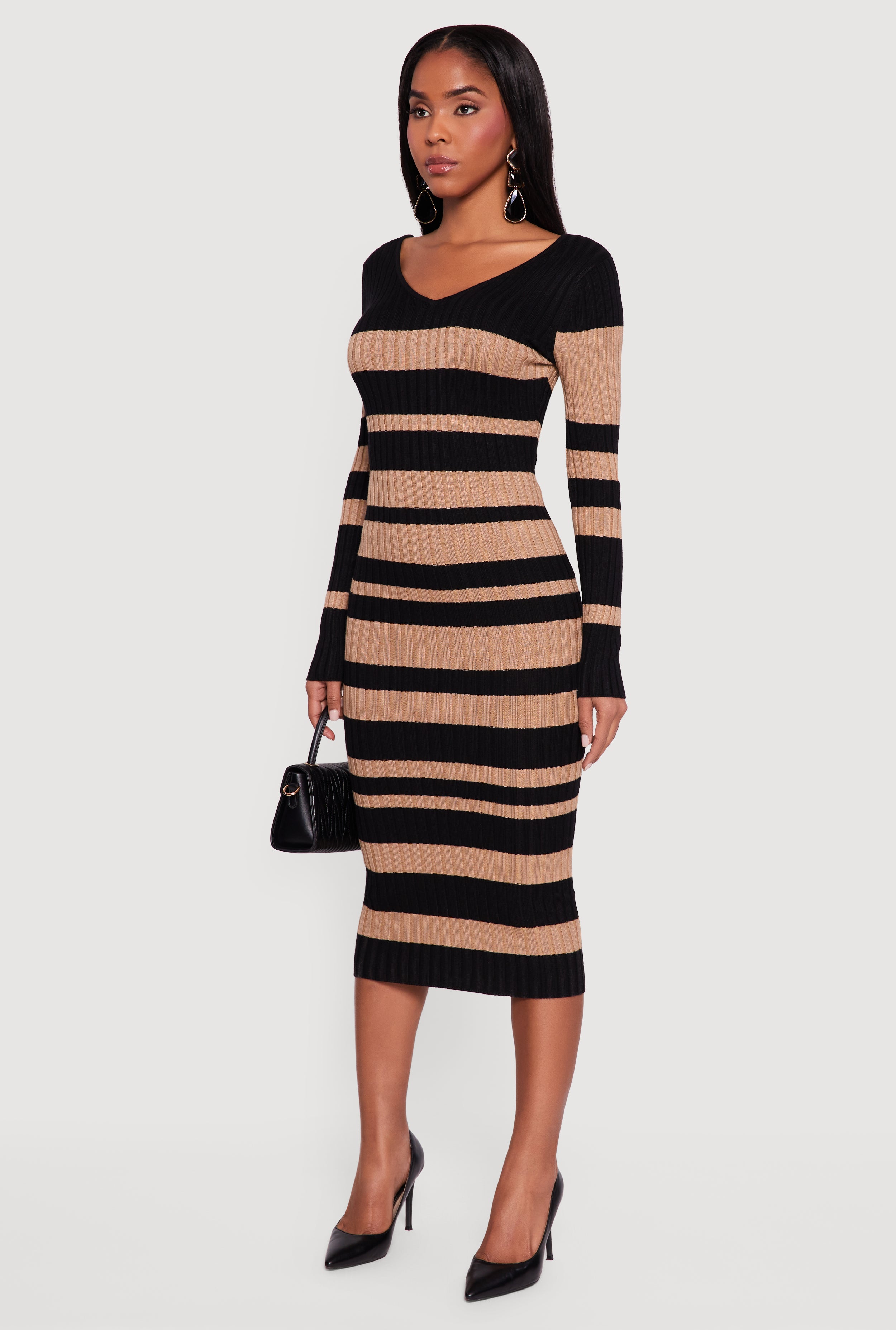 Step out in style with this Striped Rib Knit Long Sleeve V-Neck Sweater Dress designed to hug your curves and turn heads. Perfect for a night out or a party, its mid-length cut and open back add just the right amount of flirty charm. The ribbed knit fabric offers cozy comfort while the classic striped pattern keeps your look fresh and trendy. Whether you're dancing the night away or catching up with friends, this dress is your go-to for effortless chic.