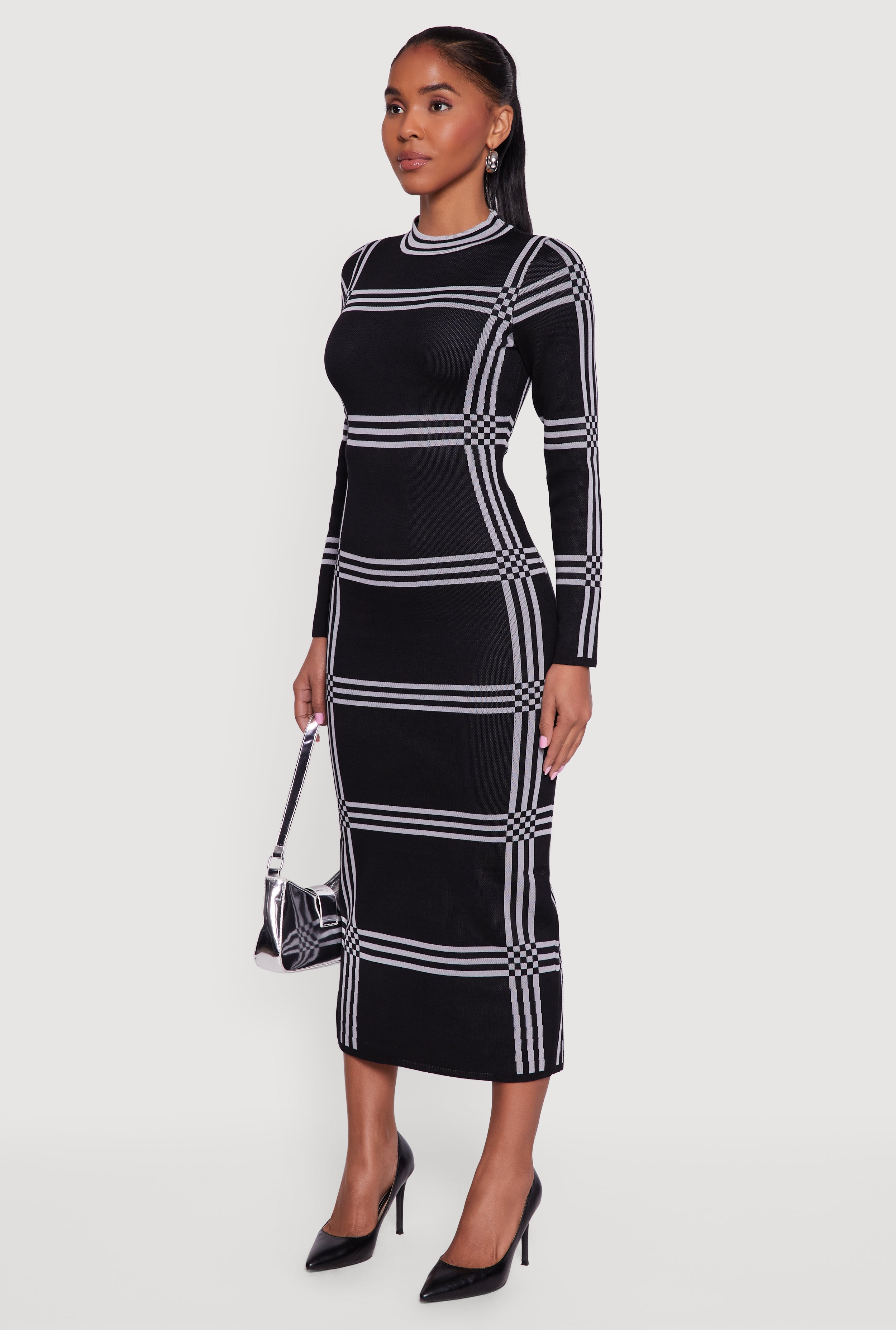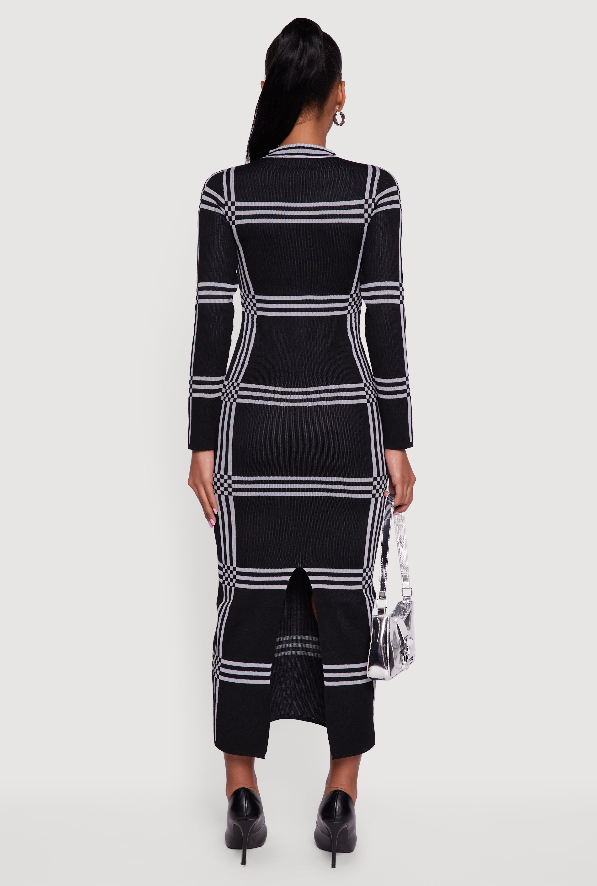 Step up your style game with this Long Sleeve Windowpane Plaid Back Slit Sweater Dress featuring a chic back slit. Designed to hug your curves with a shaped silhouette, this mid-length dress blends cozy sweater vibes with a trendy plaid pattern. Perfect for casual days or officewear, it keeps you looking effortlessly polished without sacrificing comfort.