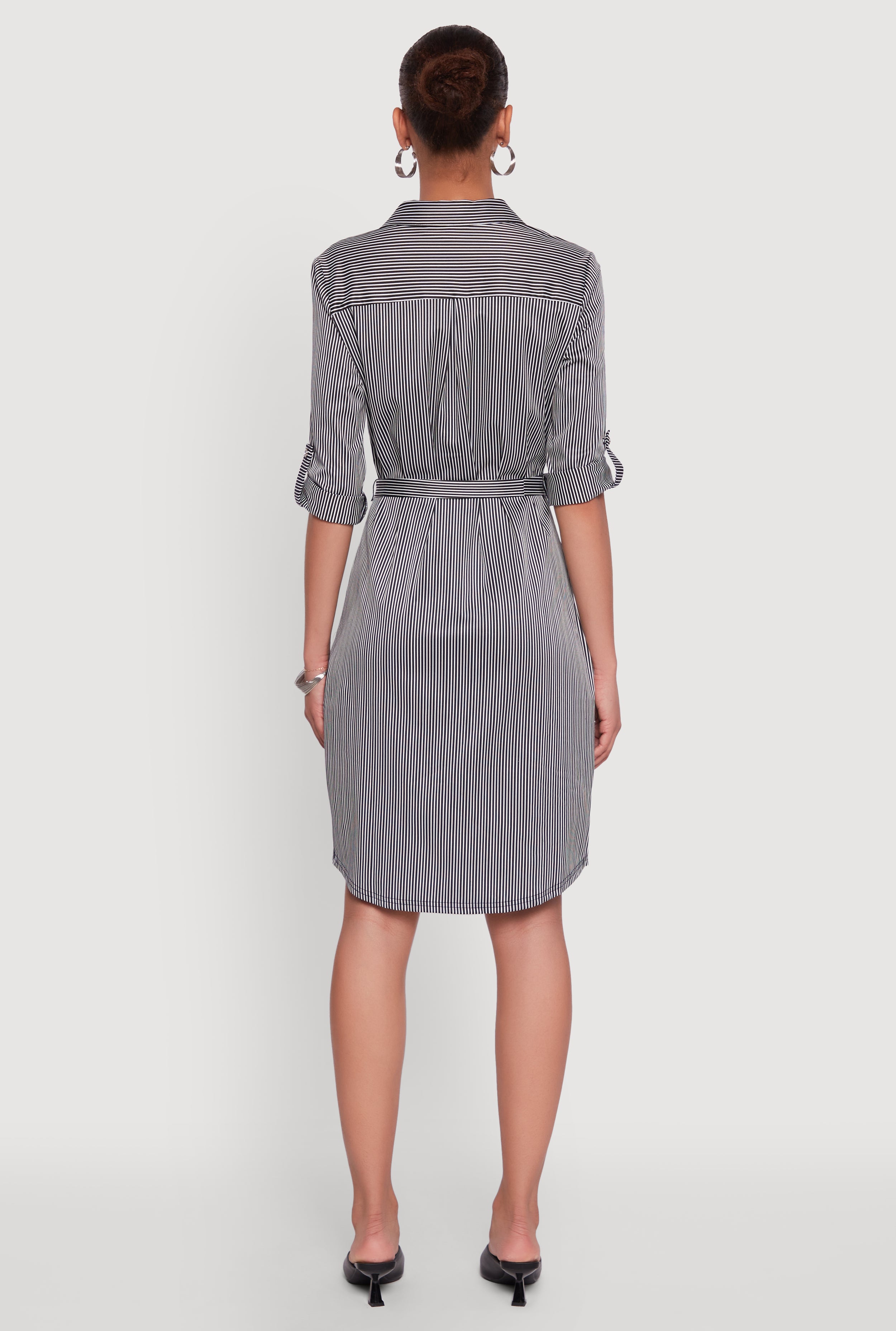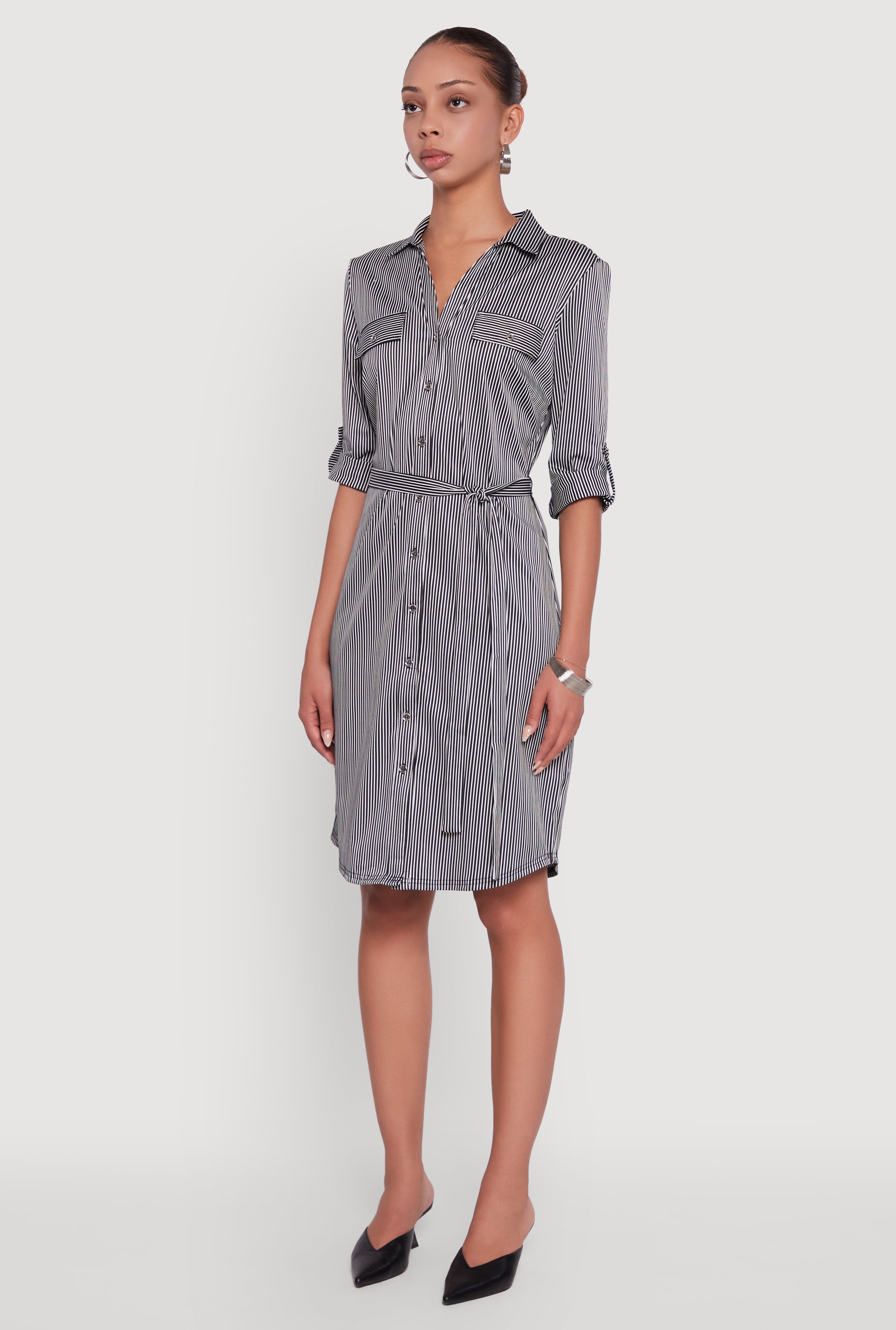 Step into effortless style with this Striped Button Front Shirt Dress featuring a chic tie waist belt that cinches your silhouette just right. Its classic fit and mid length make it the perfect pick for both office days and dressy occasions. The 3/4 sleeves with tab details and flap pockets add a cool, functional twist to this timeless striped dress. Ready to turn heads and keep you comfy all day long? This is your new go-to.