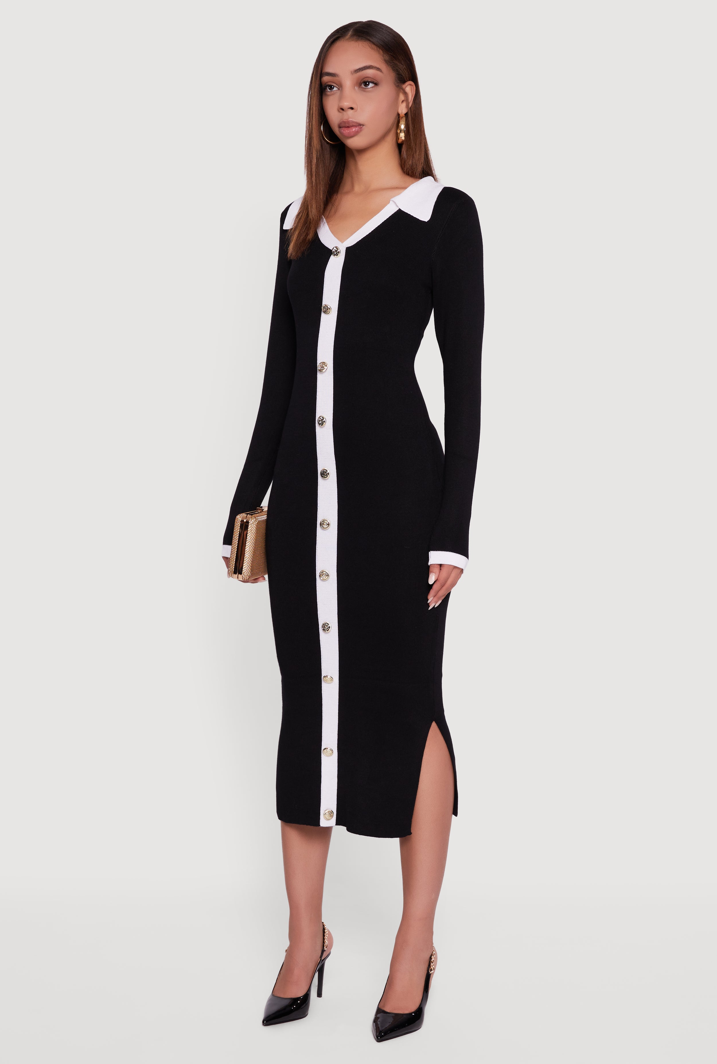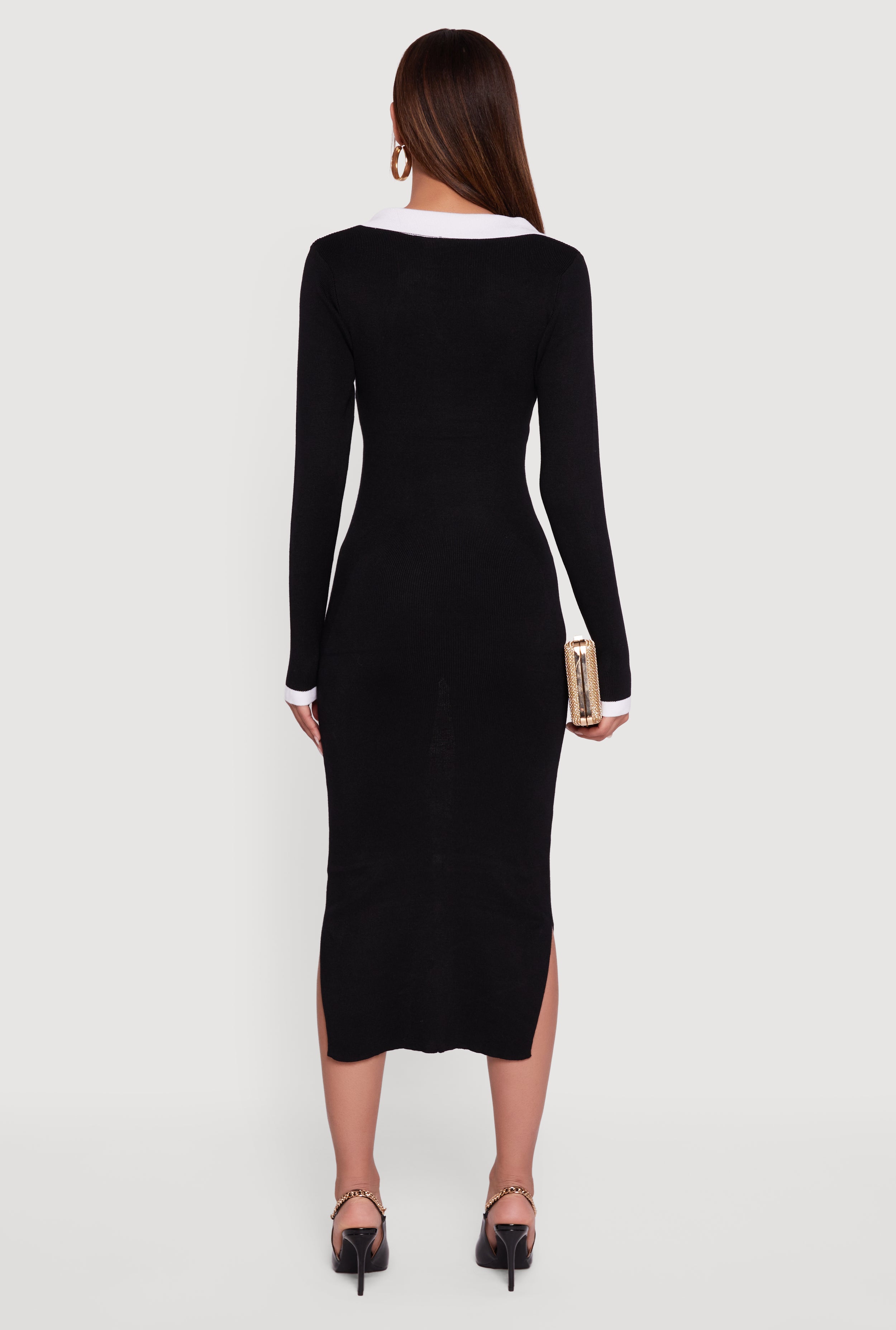 Step up your style game with this Contrast Trim Side Slit Long Sleeve Polo Sweater Dress. Designed to hug your curves in all the right places, this mid-length dress combines cozy sweater vibes with a chic polo collar for a fresh, sporty twist. The playful side slits add movement and flair, making it perfect for a night out or a party where you want to look effortlessly cool and confident.