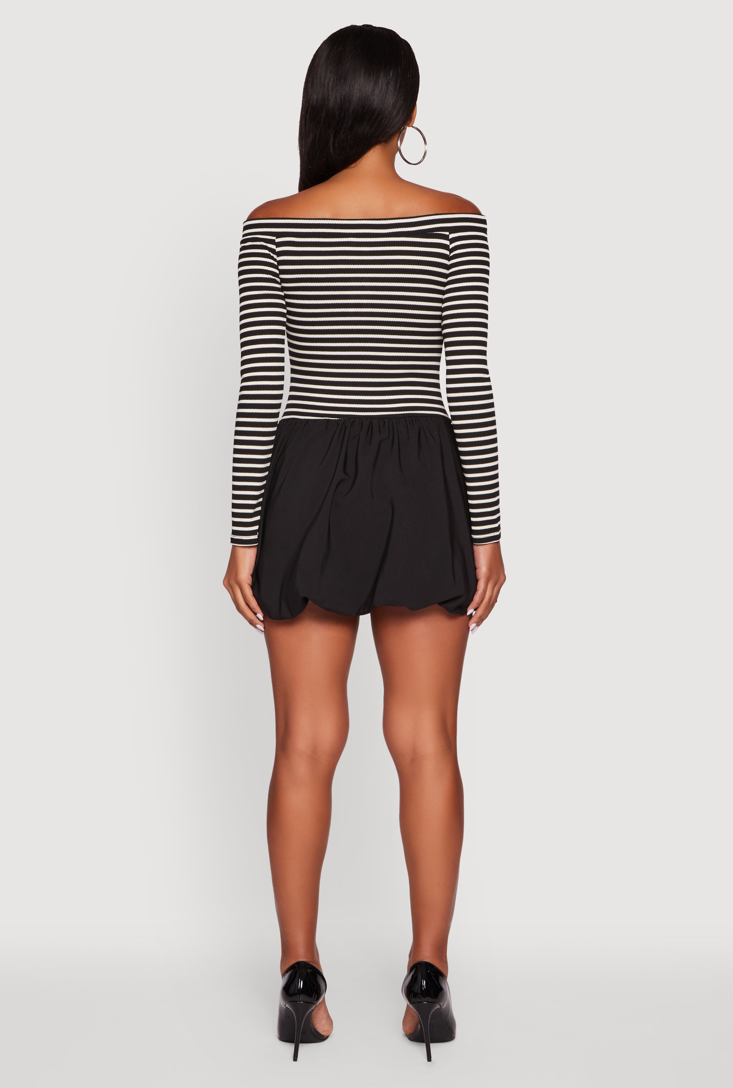Step out in style with the Striped Off The Shoulder Long Sleeve Bubble Hem Dress. This curve-hugging, ribbed knit dress perfectly blends casual vibes with a flirty edge. The off the shoulder neckline and off the shoulder design show off just the right amount of skin, while the bubble hem adds a playful twist to your look. Whether you鈥檙e heading out for a night with friends, a party, or keeping it casual, this dress is your new go-to for effortless cool.