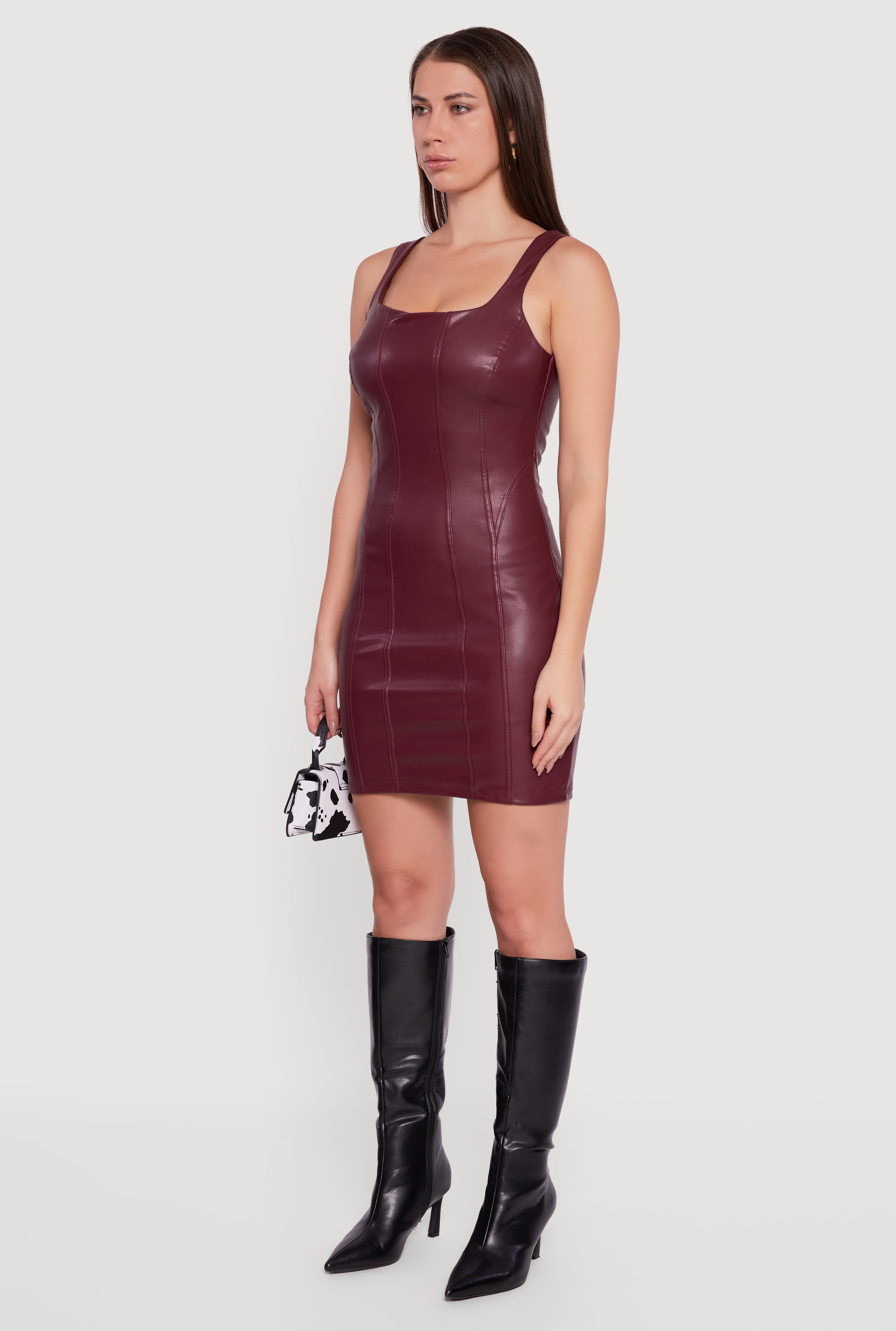 Step into the spotlight with the Faux Leather Square Neck Corset Tank Dress, your new go-to for turning heads on any night out. This curve-hugging bodycon dress features a sleek square neckline and an edgy open back, blending bold style with a flattering fit. Crafted from smooth faux leather with a cozy fleece lining, it offers comfort without compromising on attitude. The zip-back closure makes it easy to slip on and off, while the short length keeps things flirty and fun. Perfect for parties or any occasion when you want to make a statement.