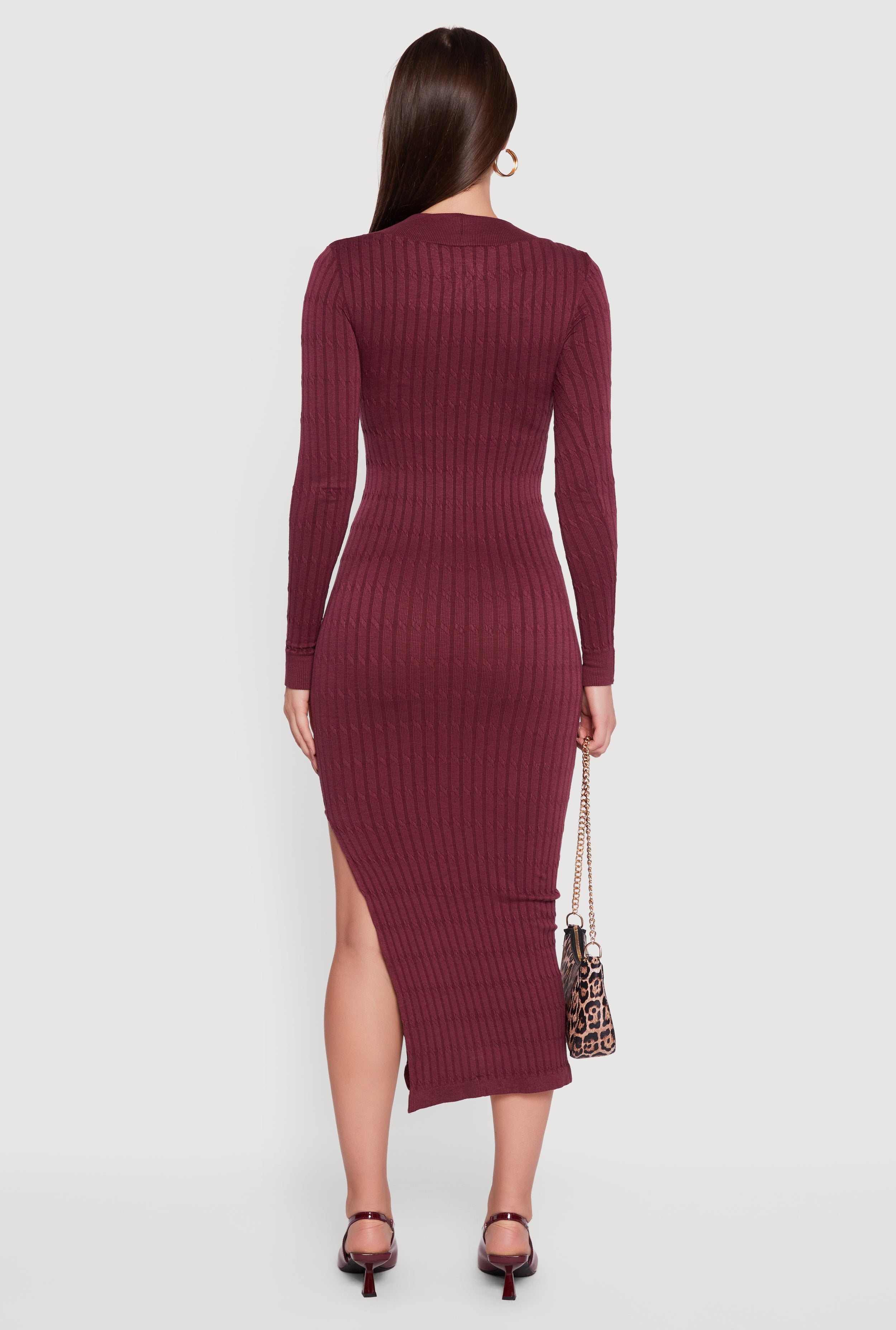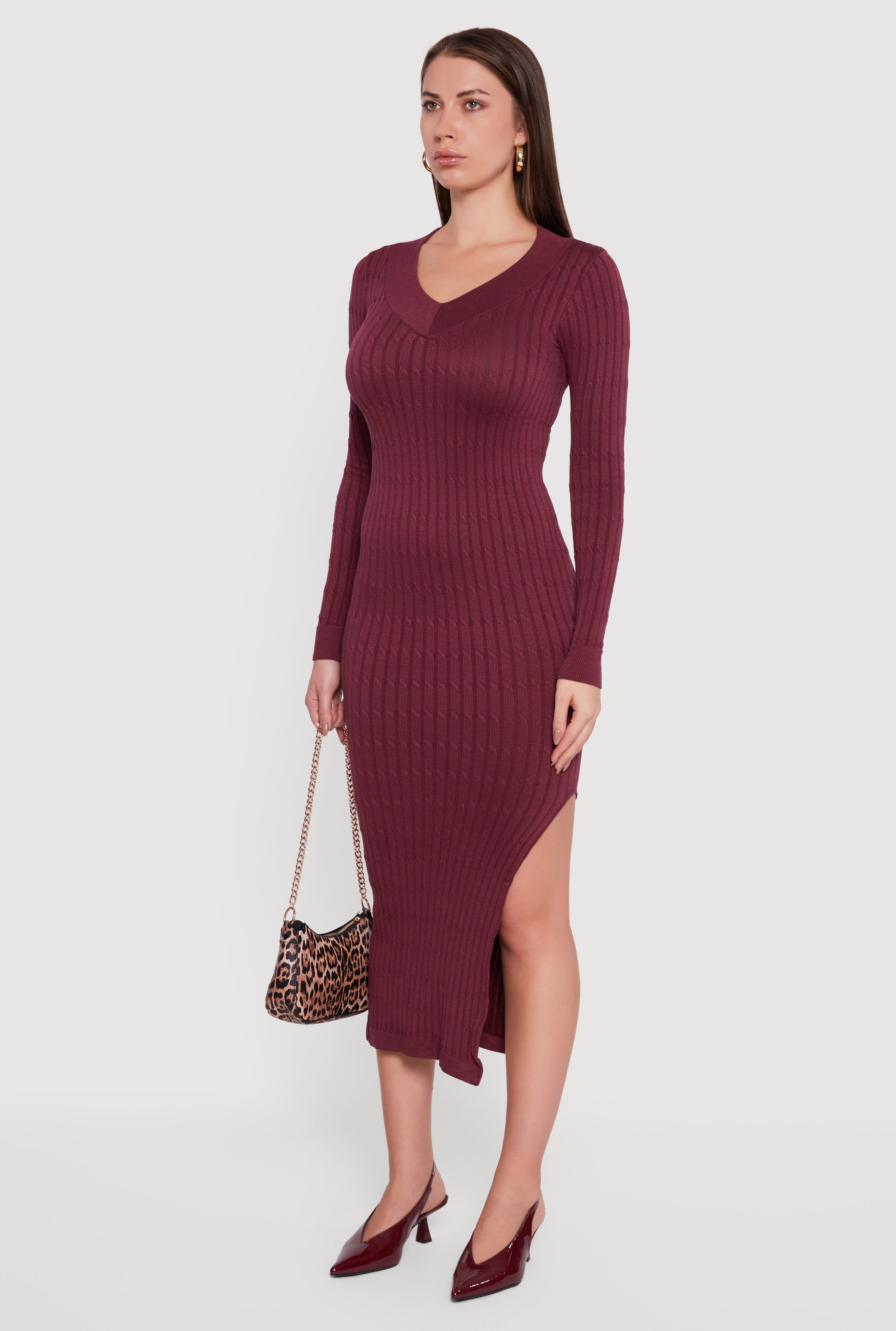 Step into cozy chic with this Long Sleeve V Neck Side Slit Sweater Dress. Designed to hug your curves while keeping things effortlessly stylish, this dress is perfect for casual days or office vibes. The flattering V-neckline and side slit add just the right amount of flair, making it a versatile must-have for your wardrobe.