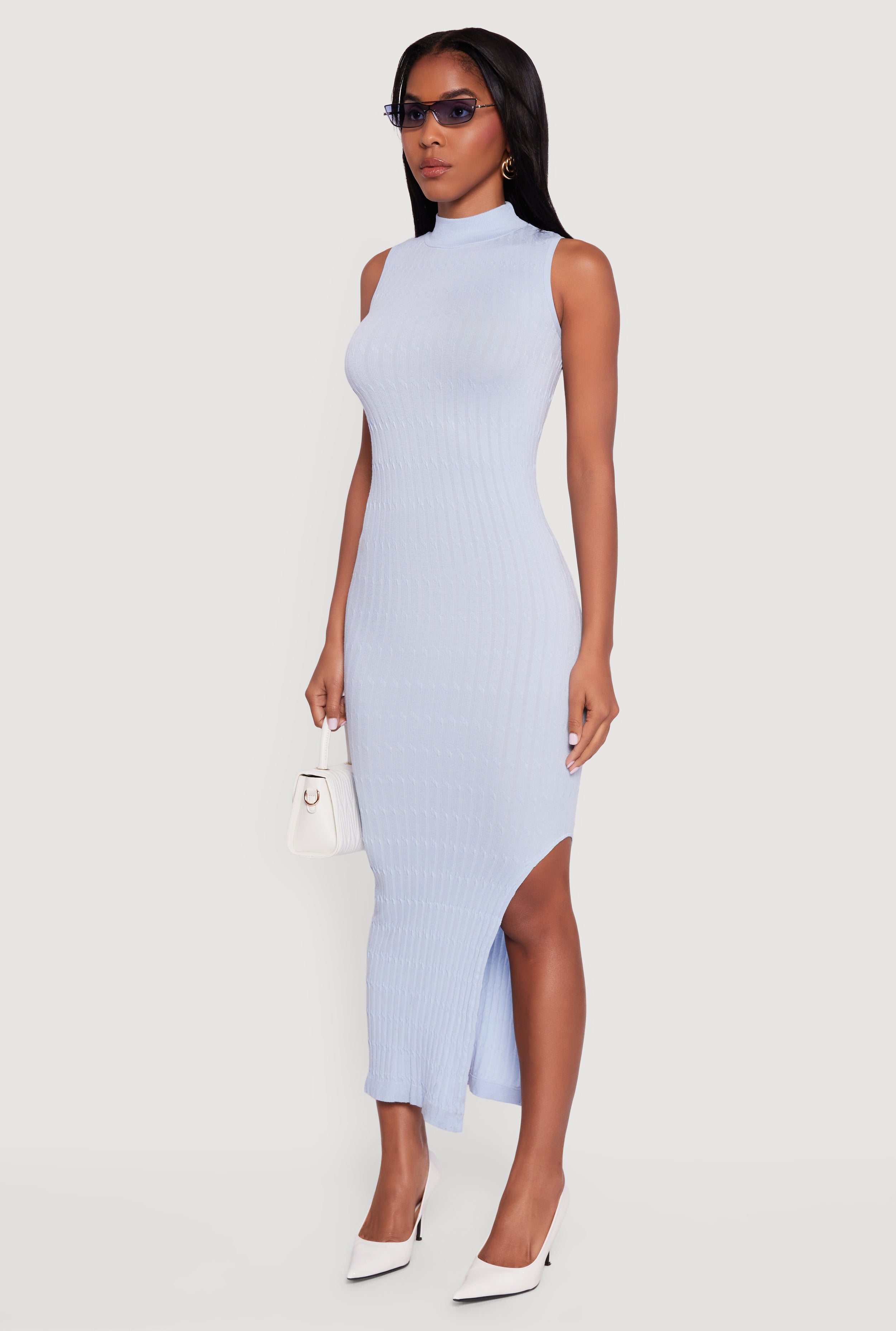 Step into cozy sophistication with this Side Slit Sleeveless Mock Neck Sweater Dress. Crafted from soft cable knit, this long-length bodycon dress hugs your curves in all the right places while the side slit adds a flirty touch. Perfect for casual days or a night out, its sleeveless design and mock neck blend comfort with style effortlessly. Elevate your wardrobe with a versatile piece that transitions from officewear to weekend vibes without missing a beat.