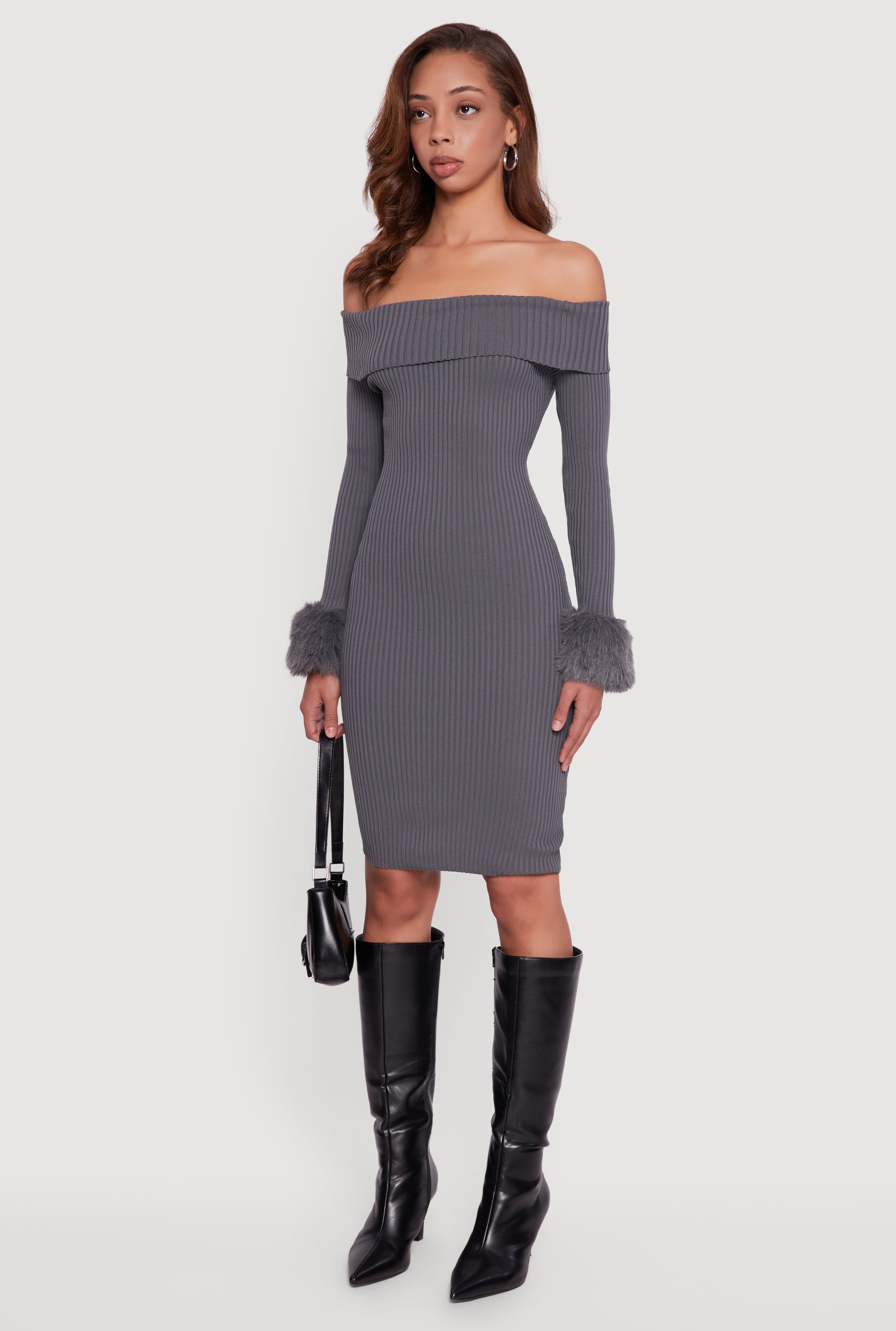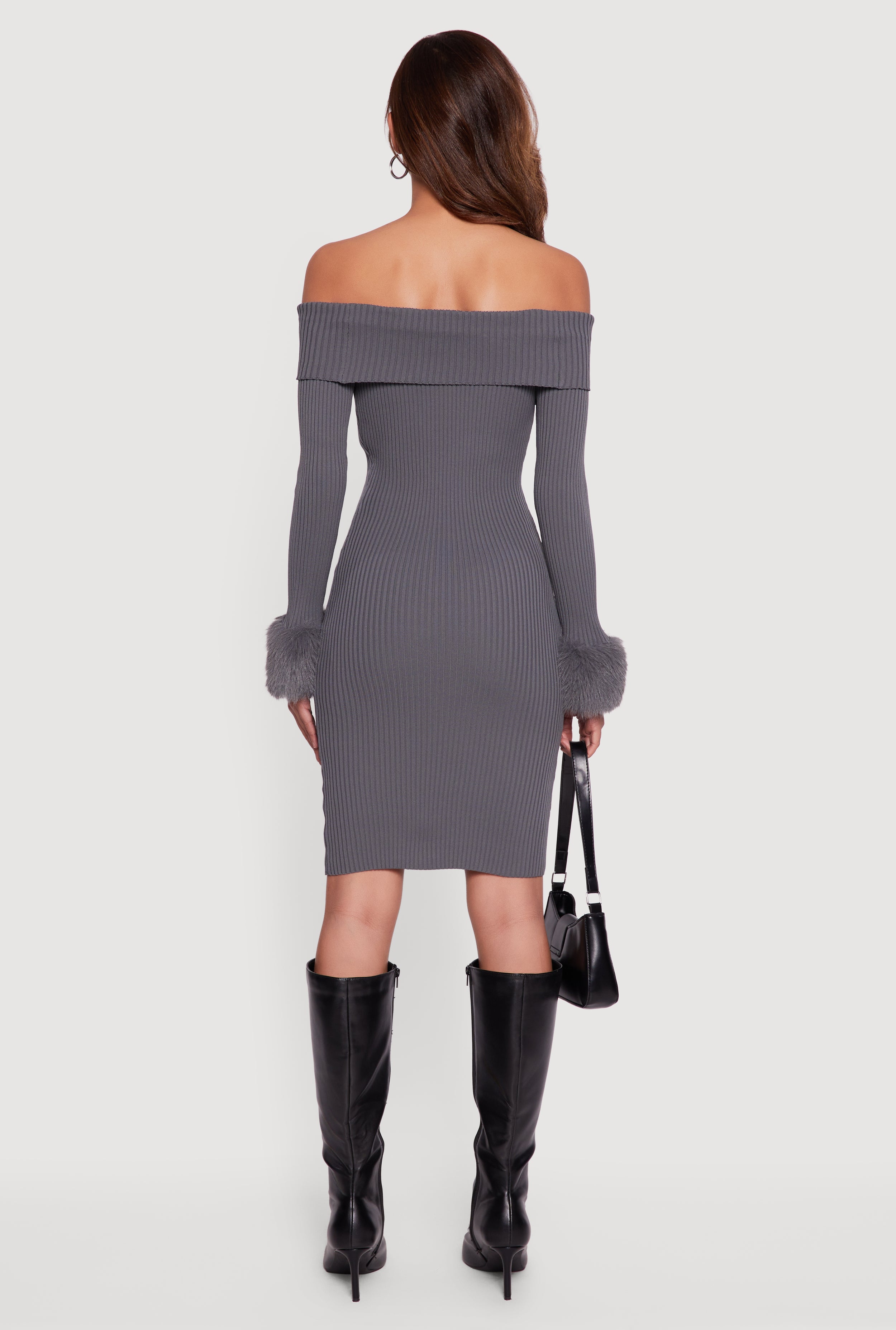 Faux Fur Cuff Fold Over Off the Shoulder Sweater Dress