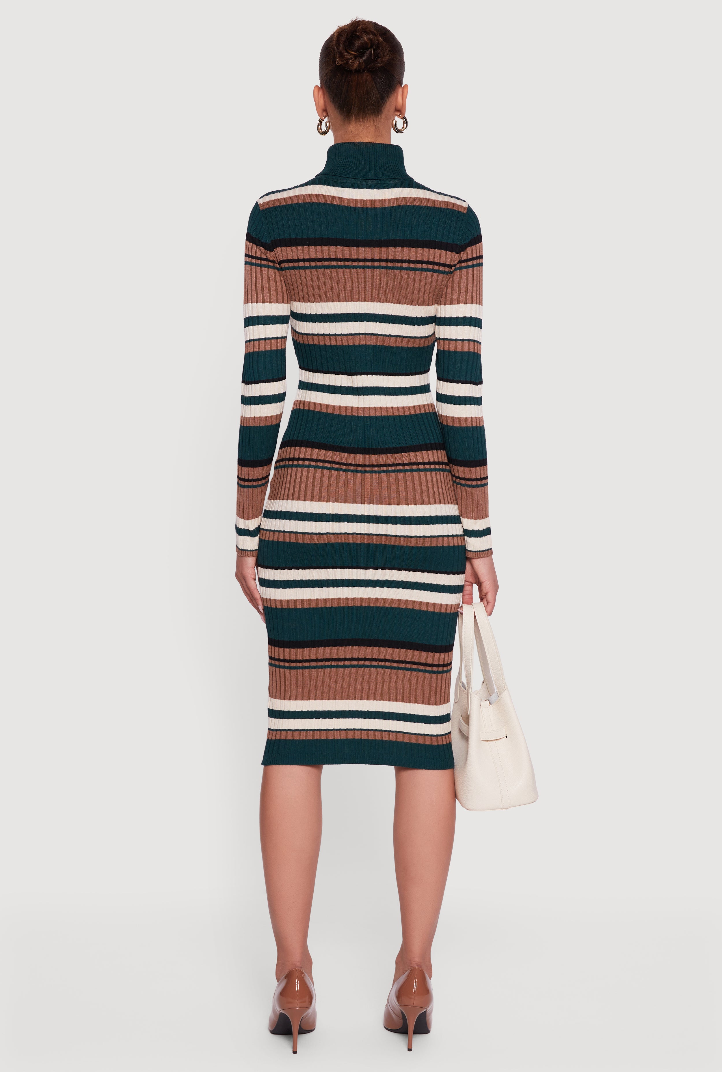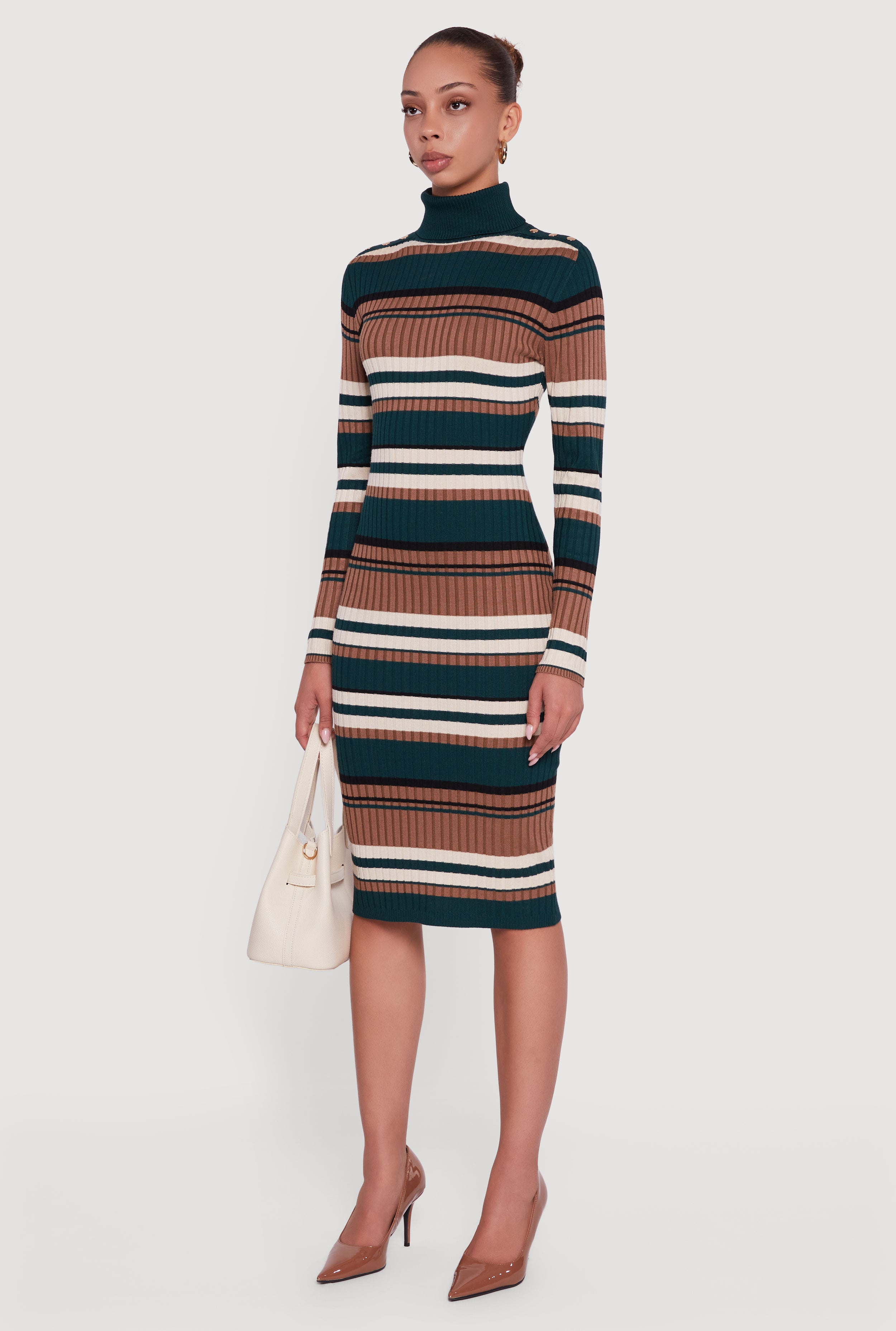 Step out in style with the Almost Famous Striped Turtleneck Sweater Dress. This mid-length, curve-hugging sweater dress features a cozy ribbed knit fabric and a chic turtleneck design that鈥檚 perfect for cooler nights out or party vibes. The subtle striped pattern and faux button details add just the right amount of edge to keep your look fresh and trendy. Whether you鈥檙e hitting the town or just want to feel effortlessly put-together, this dress combines comfort and style in one flattering silhouette.