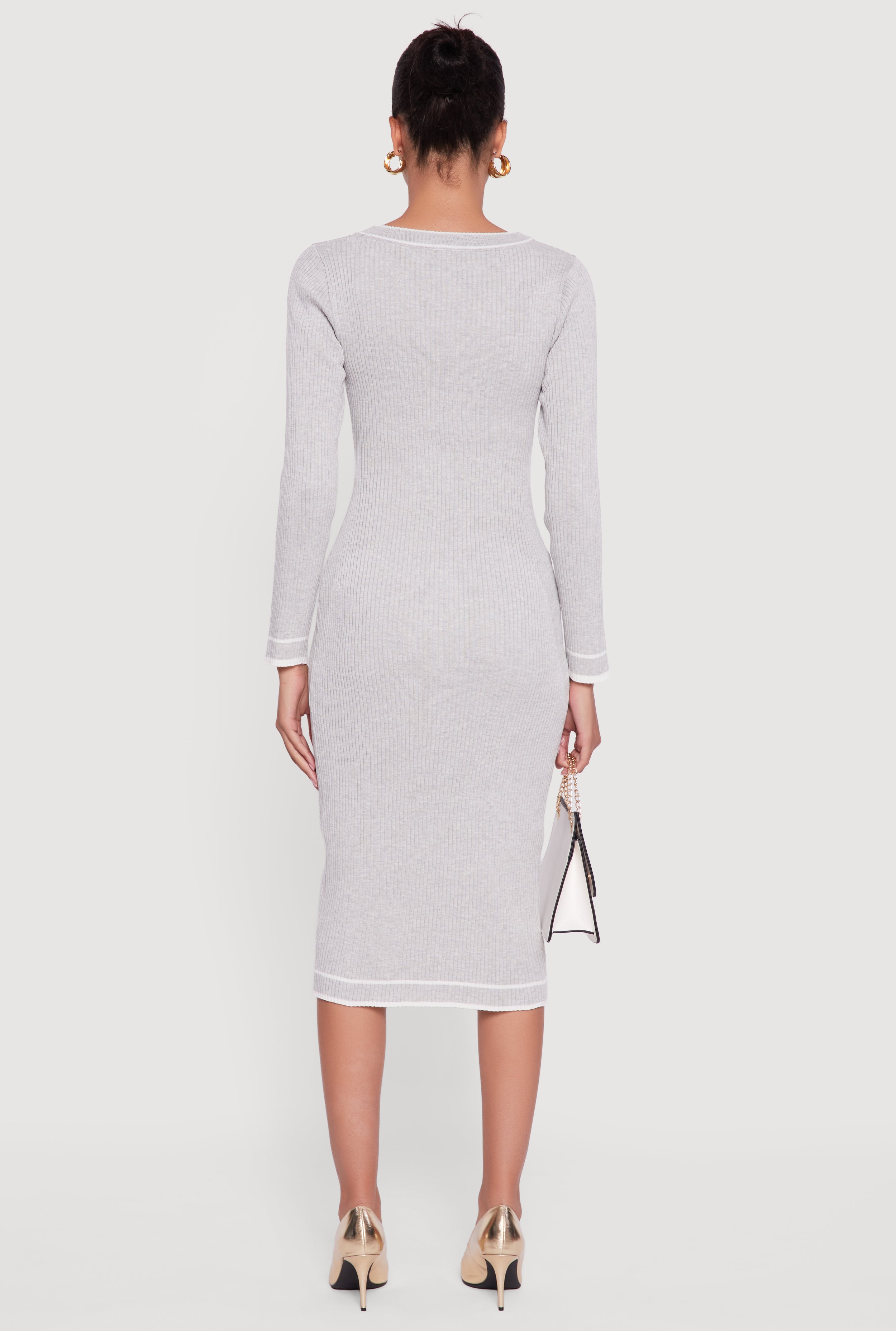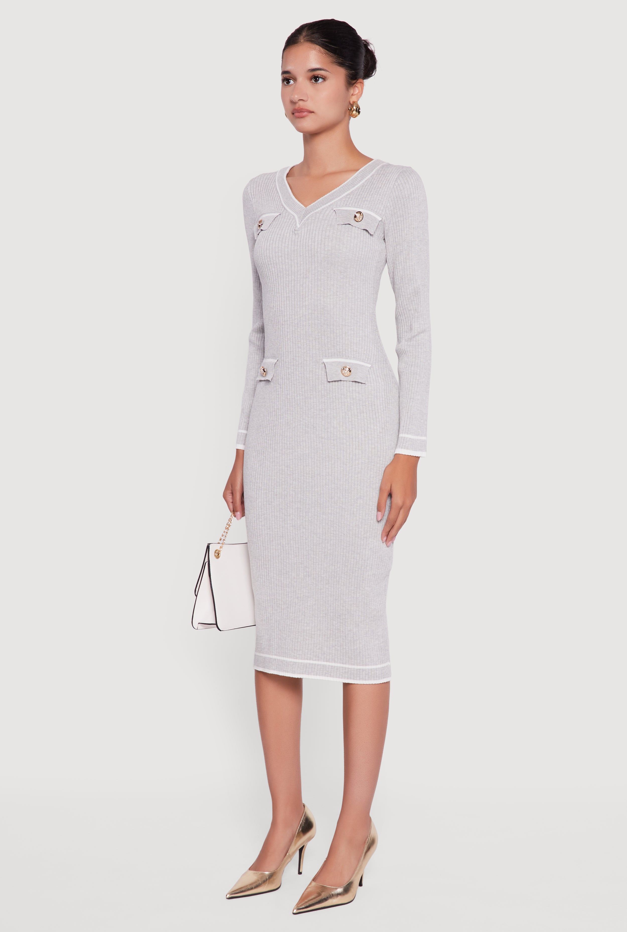 Step out in style with the Contrast Trim Pocket Detail Long Sleeve Sweater Dress by Daisy. This curve-hugging, mid-length bodycon dress is made from cozy ribbed knit fabric that keeps you comfy while turning heads. The chic V-neck and contrast trim add just the right amount of sparkle for your night out or party vibes. Faux pockets bring playful detail without the bulk, making this dress your new go-to for effortless glam.