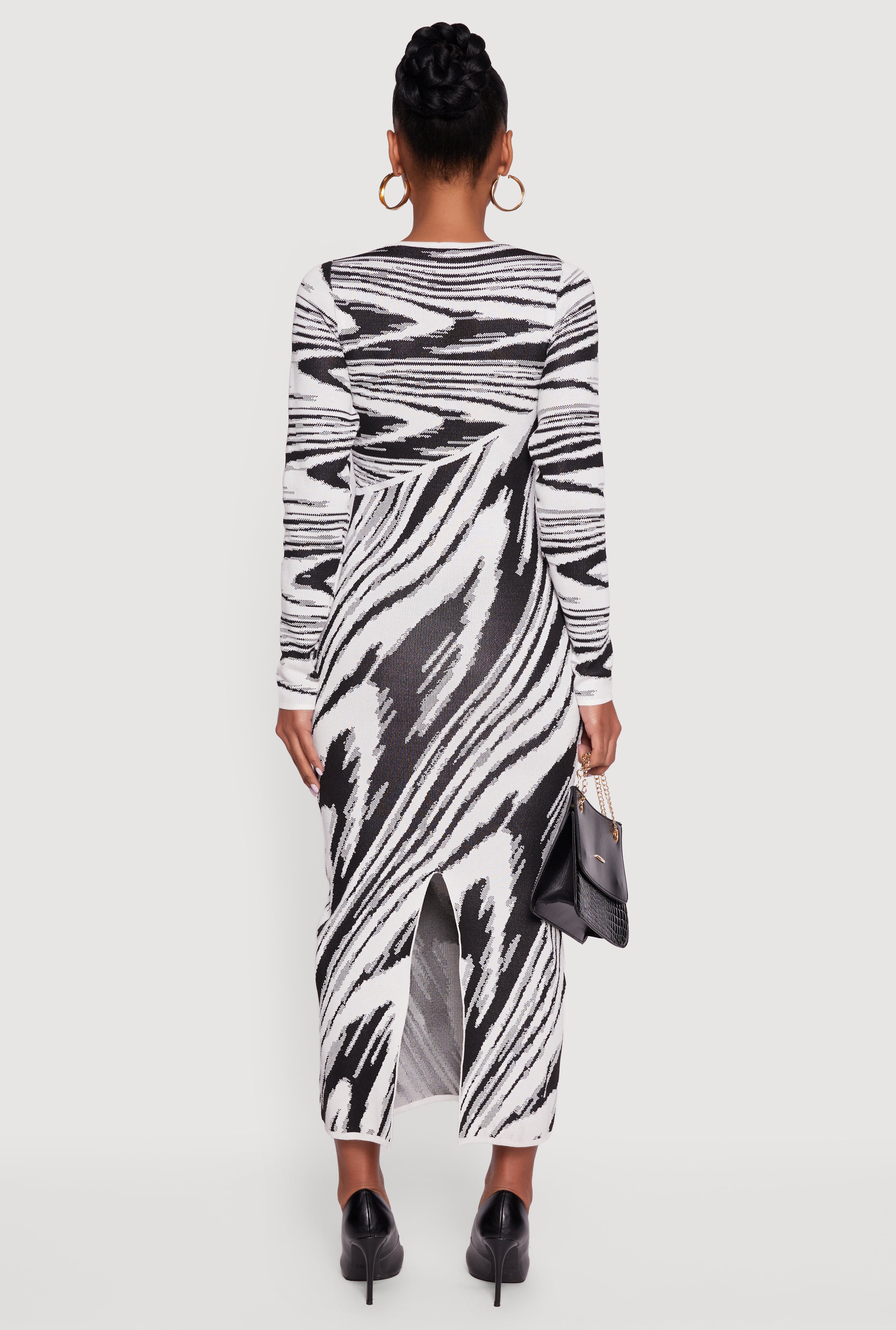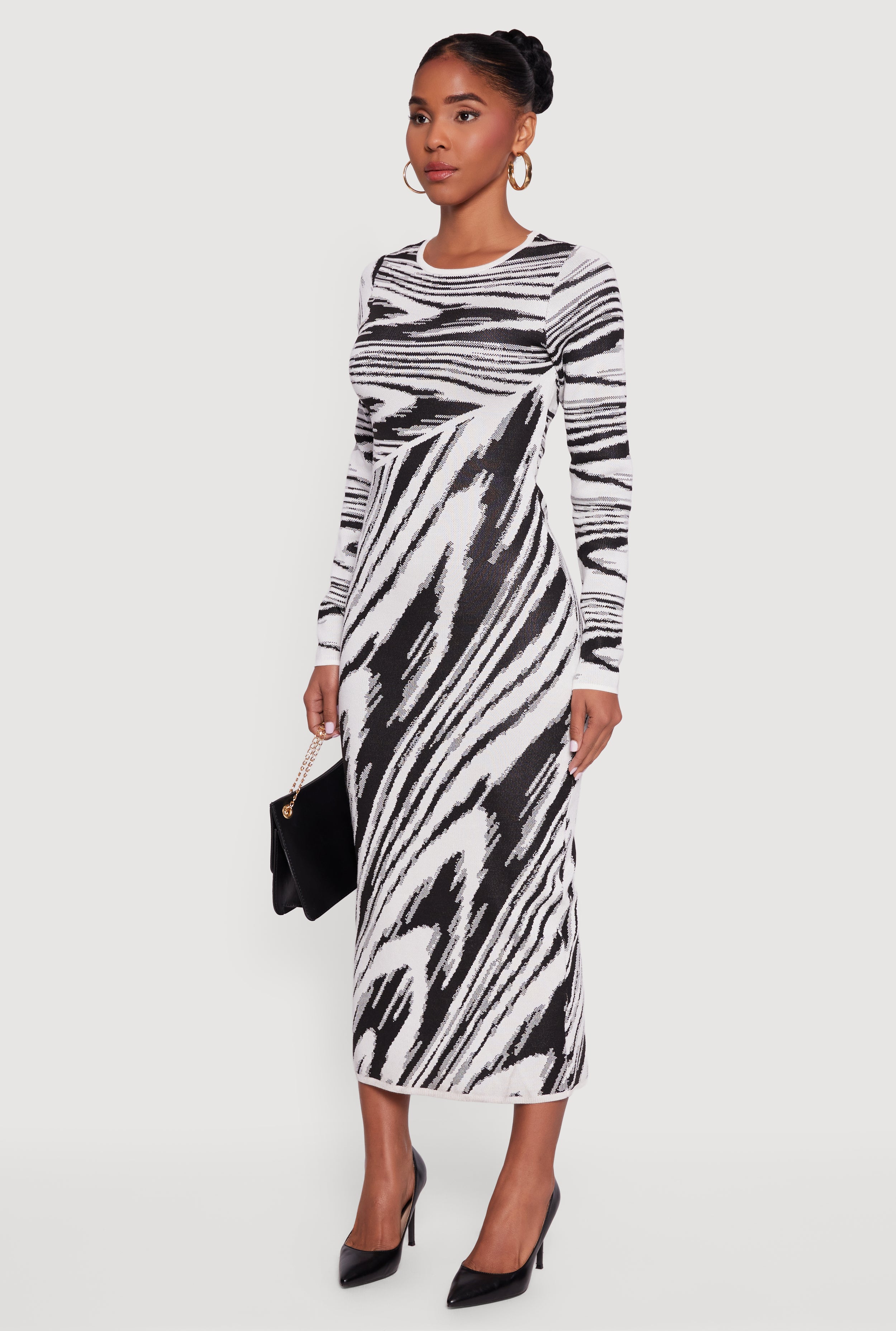 Step out in style with the Abstract Print Long Sleeve Sweater Dress, your new go-to for casual cool vibes. This curve-hugging bodycon dress features a cozy sweater fabric and a trendy printed pattern that keeps your look fresh and fun. The crew neck and long sleeves add just the right amount of coverage for those chillier days, while the long length dress silhouette flatters your figure effortlessly. Perfect for brunch dates, coffee runs, or just lounging in style.