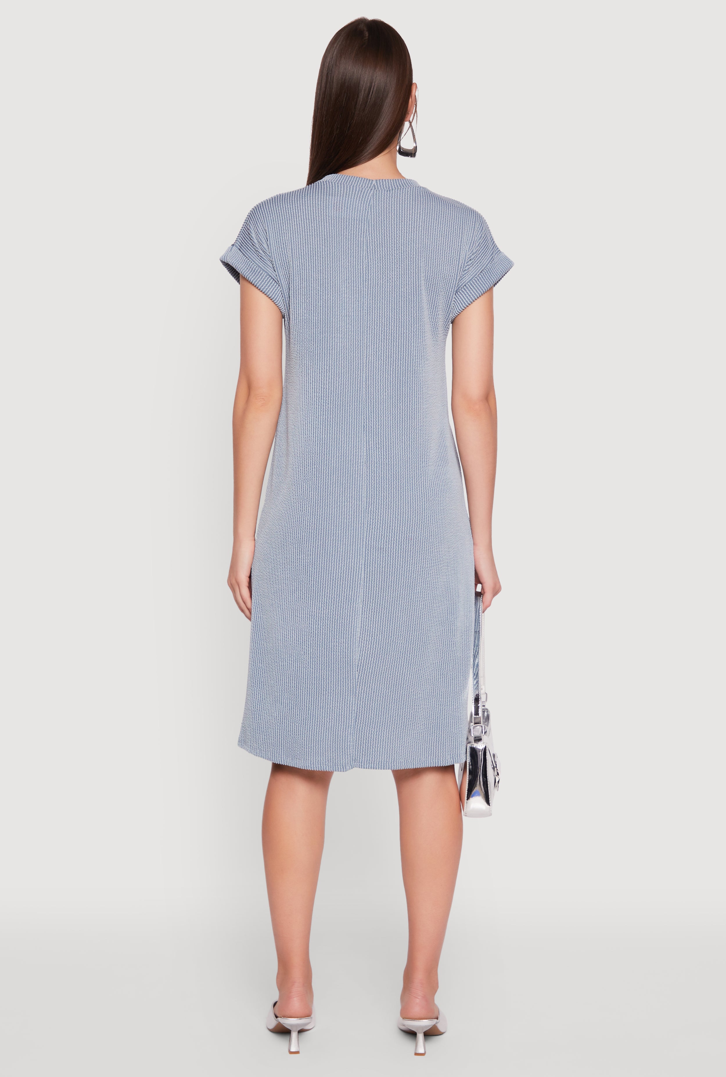 Slip into effortless style with the Rib Knit Shadow Stripe Fixed Cuff Midi T-Shirt Dress. This classic fit dress features a flattering crew neck and trendy cap sleeves, making it your go-to for casual days or vacation vibes. The ribbed knit fabric hugs you just right, while the subtle shadow stripe adds a cool, modern twist. Whether you're out with friends or chilling at home, this midi dress keeps you comfy and cute all day long.