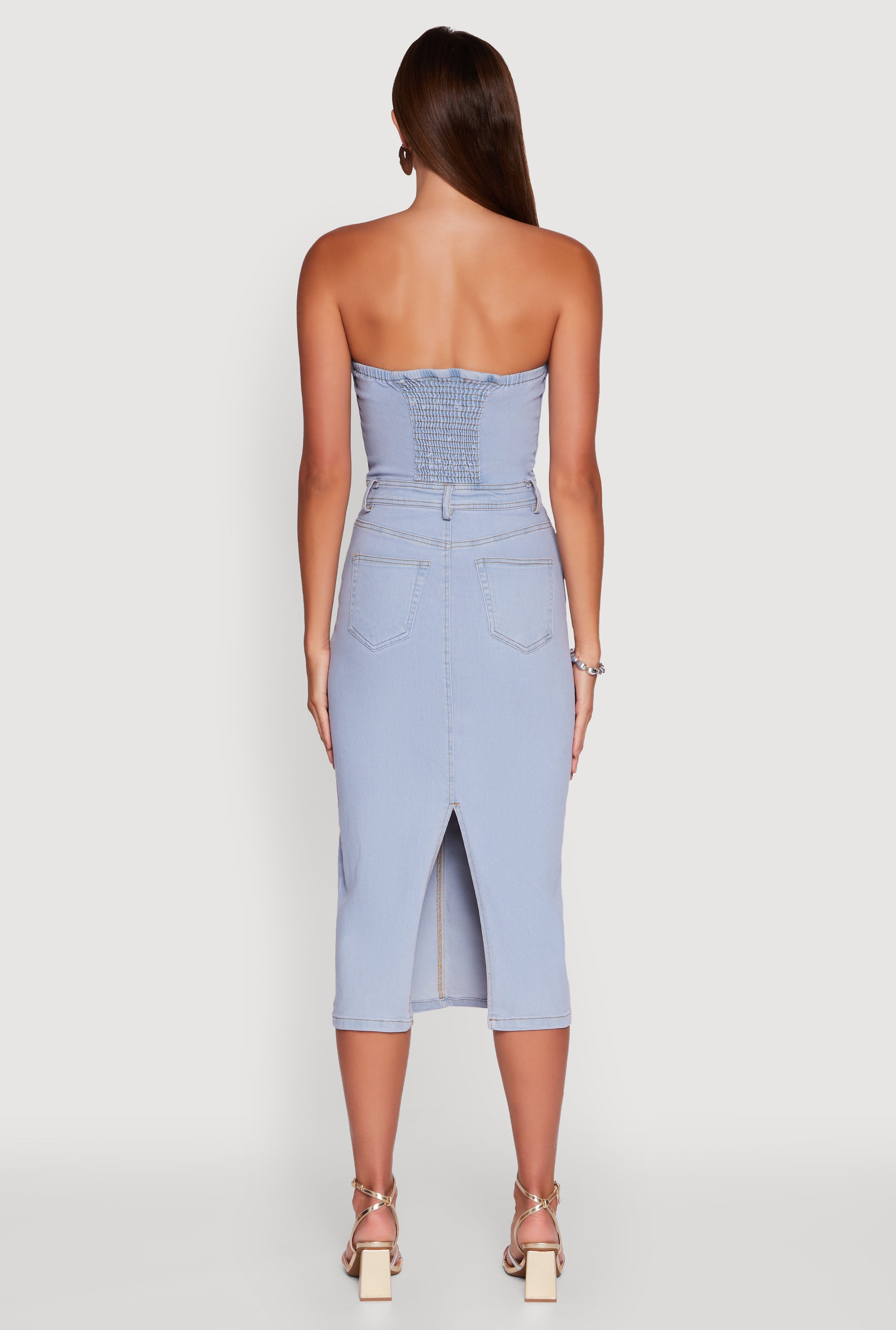 Step into the spotlight with the Haute Monde Denim Zip Front Corset Tube Dress, your new go-to for unforgettable nights out. This strapless, curve-hugging tube dress is designed to show off your silhouette while keeping things effortlessly cool with its denim fabric. The front zipper adds a bold touch and makes it easy to slip on, while the slit back and smocked details bring just the right amount of edge and comfort. Ready to turn heads? This mid-length dress has your name on it.