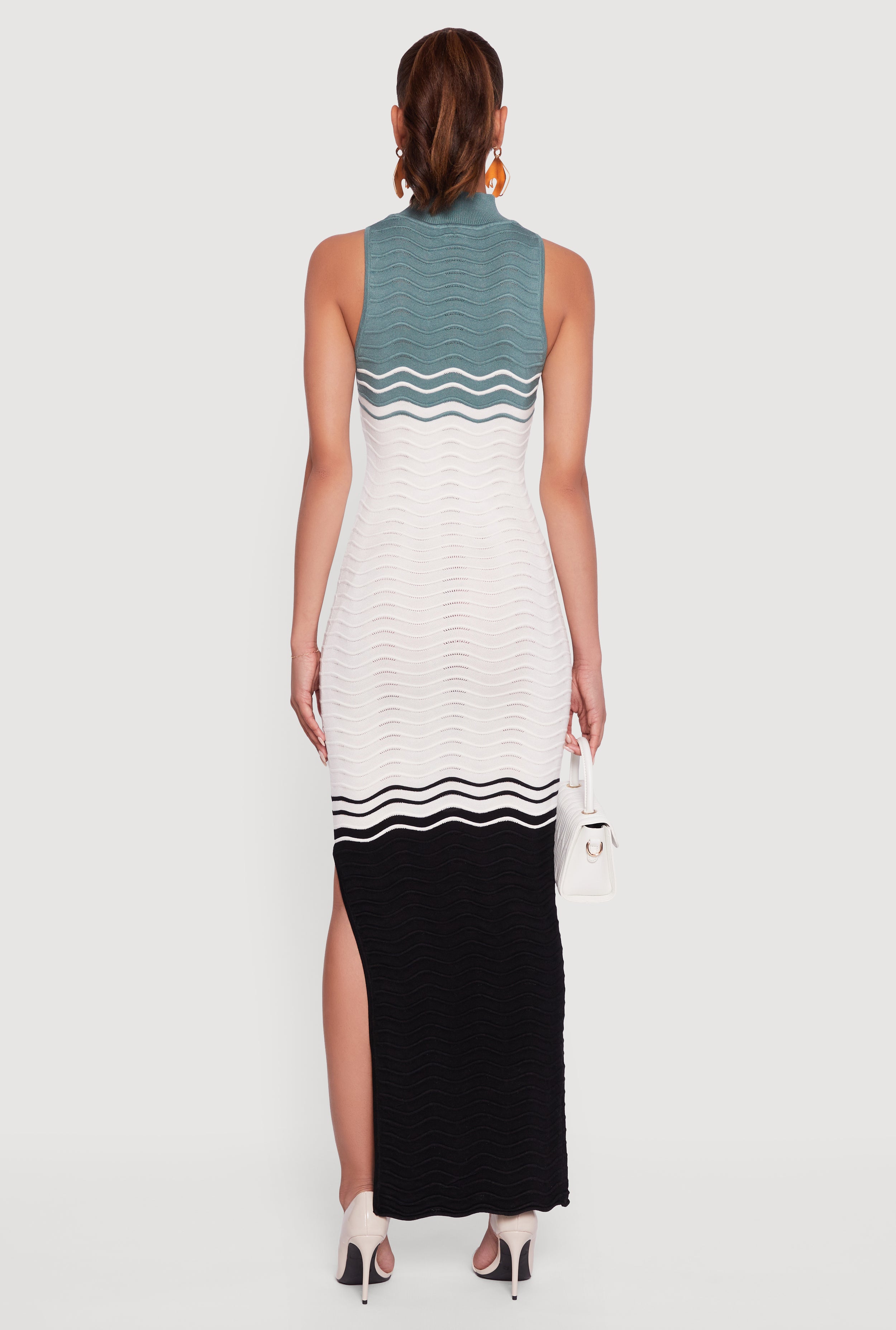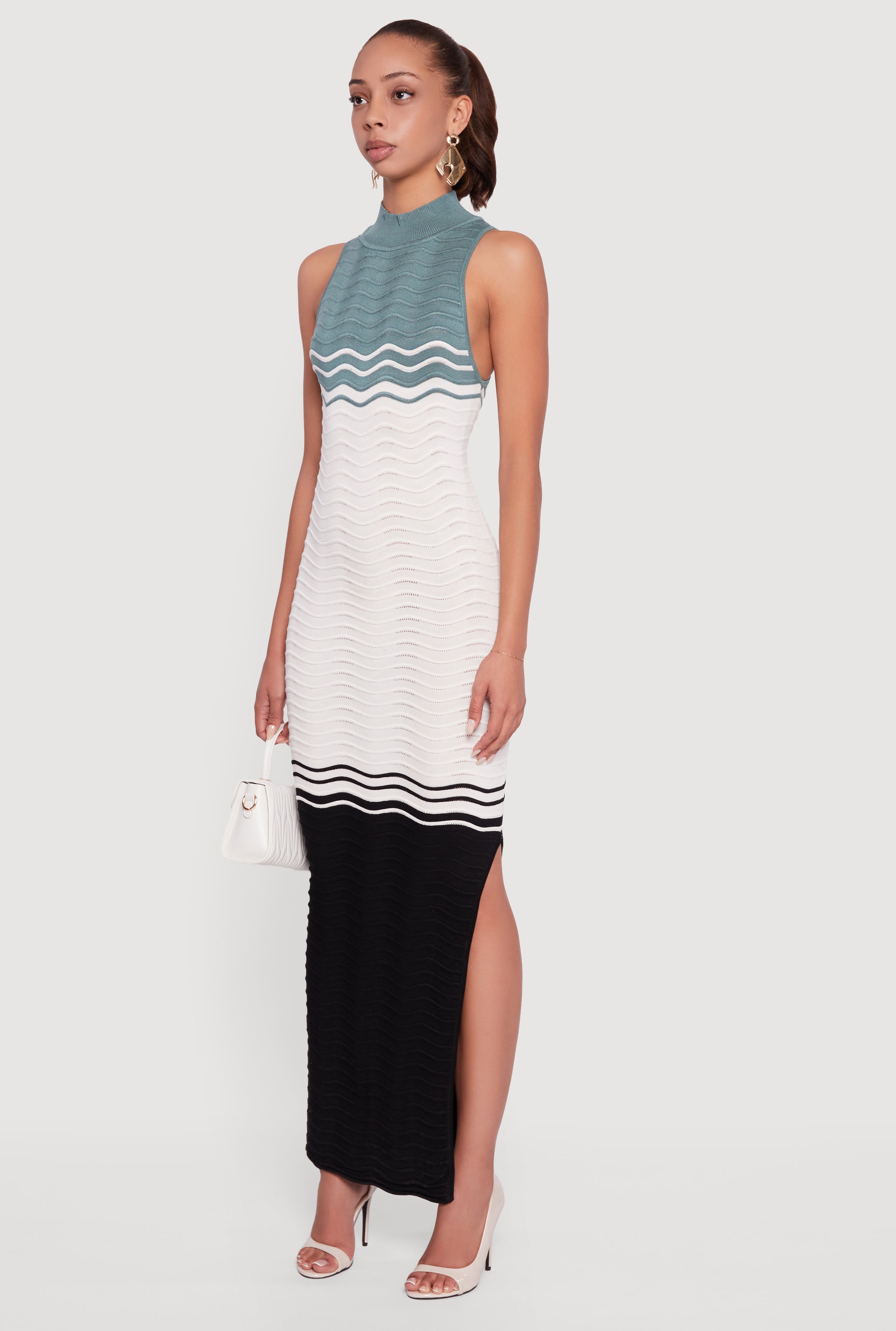 Step out in style with the Color Blocked Wavy Stripe Side Slit Maxi Dress, your new go-to for casual vibes that hug every curve. This sleeveless, ribbed knit beauty features a sleek mock neck and a daring side slit to keep things effortlessly cool and comfortable. Perfect for those days when you want to look put-together without trying too hard, this maxi dress blends bodycon fit with sweater-like coziness. Make every moment a statement with a splash of color and a silhouette that moves with you.