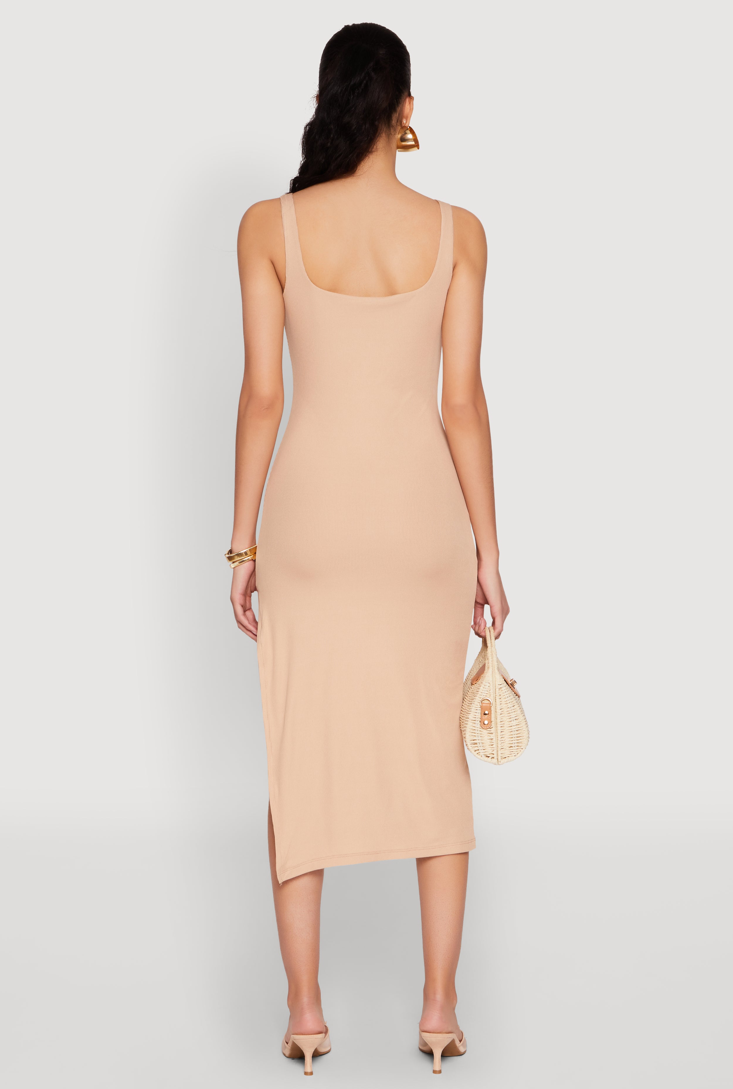 Get ready to turn heads with the Square Neck Side Slit Tank Dress, the perfect blend of flirty and fabulous. Crafted from comfy ribbed knit, this curve-hugging mid-length dress features a stylish square neckline and a daring side slit that adds just the right amount of sass. Whether you're headed to a cocktail party or just want to feel effortlessly chic, this tank dress is your new go-to for a look that's both trendy and totally you.