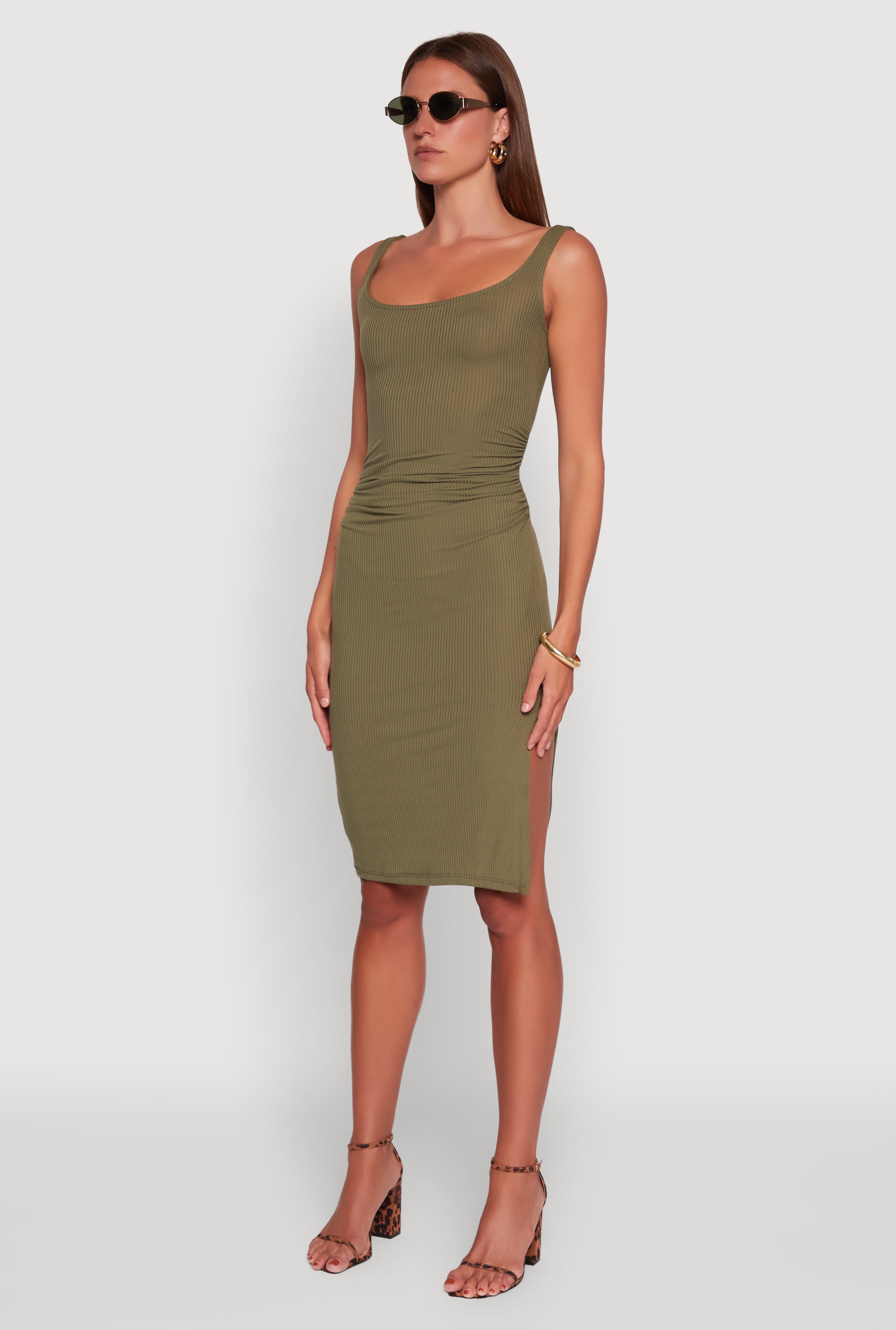 Slip into the Rib Knit Side Slit Ruched Side Midi Dress and instantly turn heads wherever you go. This curve-hugging, sleeveless bodycon dress is designed to celebrate your shape with flattering ruching and a daring side slit that adds just the right amount of sass. Perfect for a night out or any occasion where you want to feel confident and effortlessly stylish. The ribbed knit fabric keeps things comfy while the scoop neckline adds a touch of classic charm. Ready to own the night? This dress has your back.