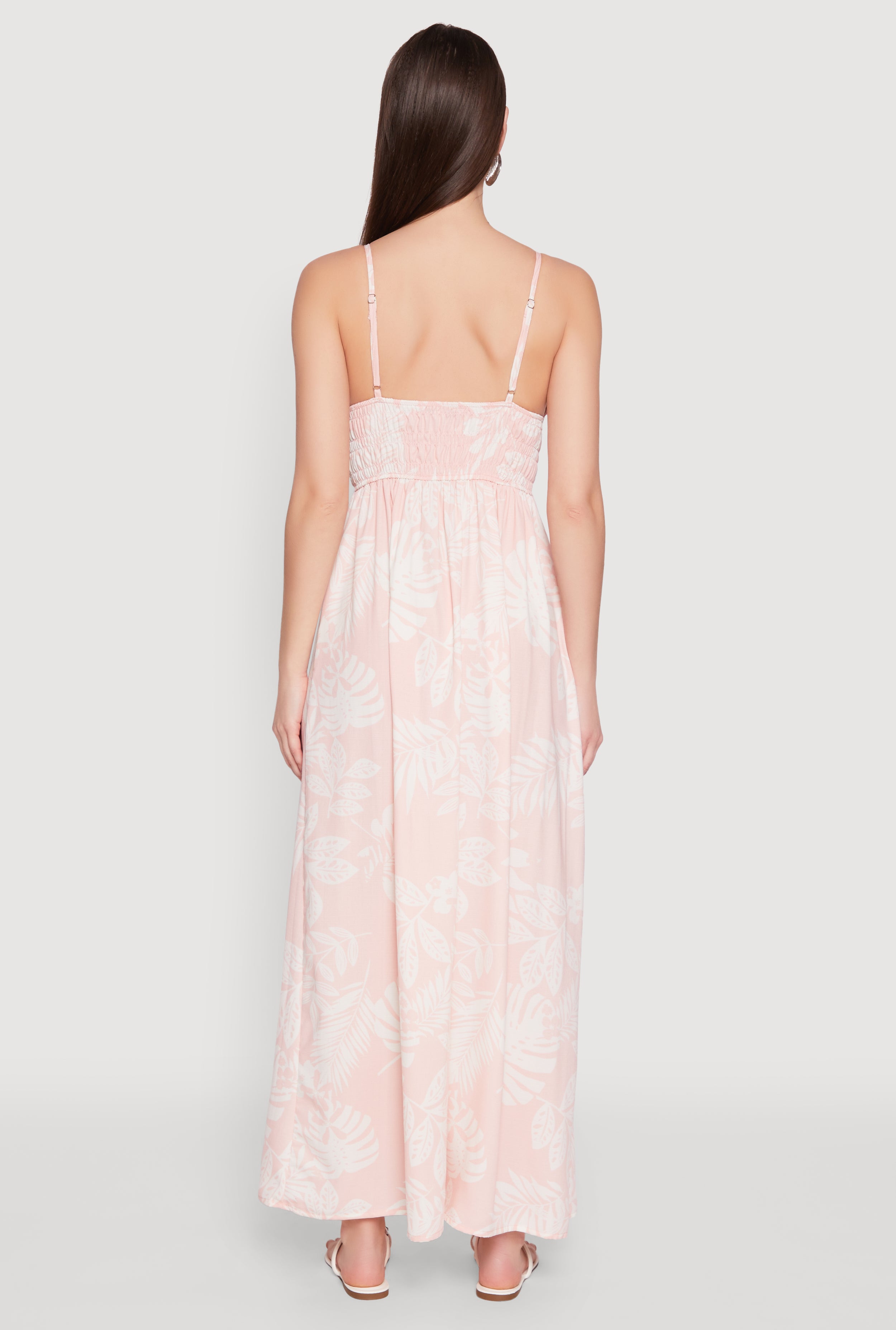 Step into effortless style with the Haute Monde Leaf Print Smocked Maxi Dress. Perfect for casual days out, this dress combines a classic fit with a timeless silhouette that flatters every body type. The sleeveless design and V-neck add a touch of femininity, while the long length and empire waist create a flowy, elegant look. Whether you're brunching with friends or enjoying a weekend getaway, this dress is your new go-to for chic comfort and easy elegance.