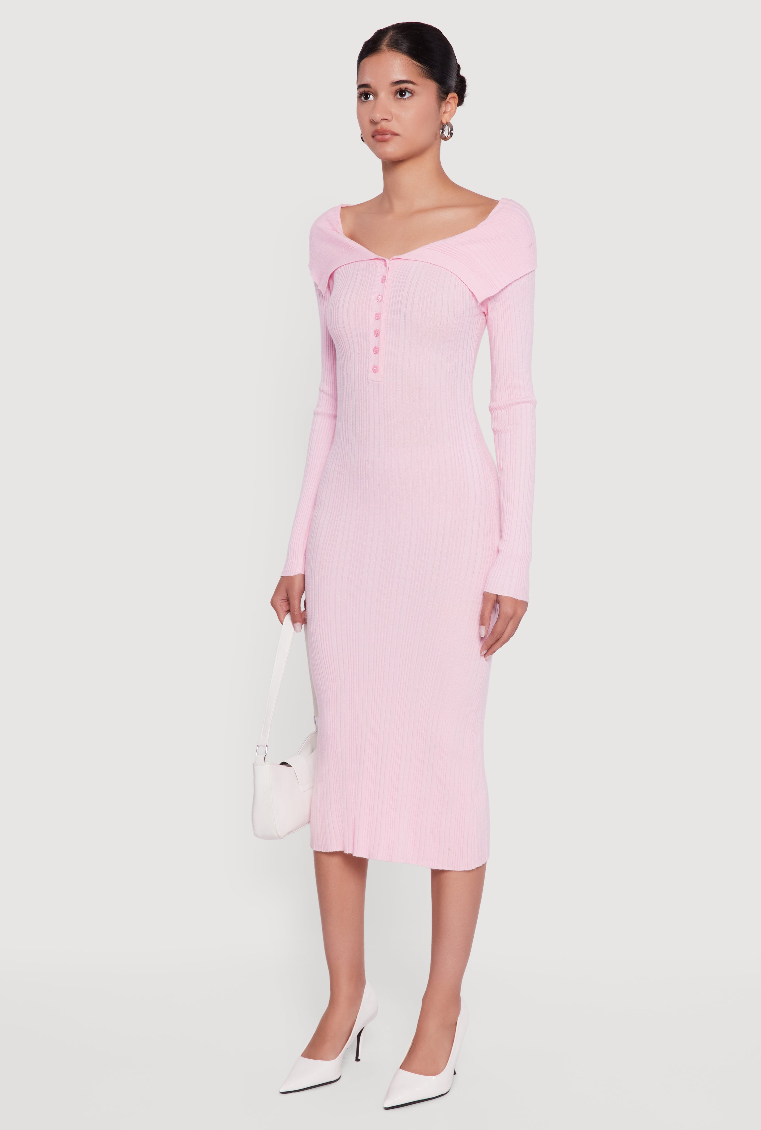 Step out in style with the Rib Knit Fold Over Quarter Button Front Sweater Dress, designed to hug your curves and keep you cozy during your night out or party. This mid-length dress features a flattering V-neck and long sleeves, crafted from soft ribbed knit fabric that stretches with you. The quarter button front adds a playful touch, making it easy to dress up or down for any occasion.