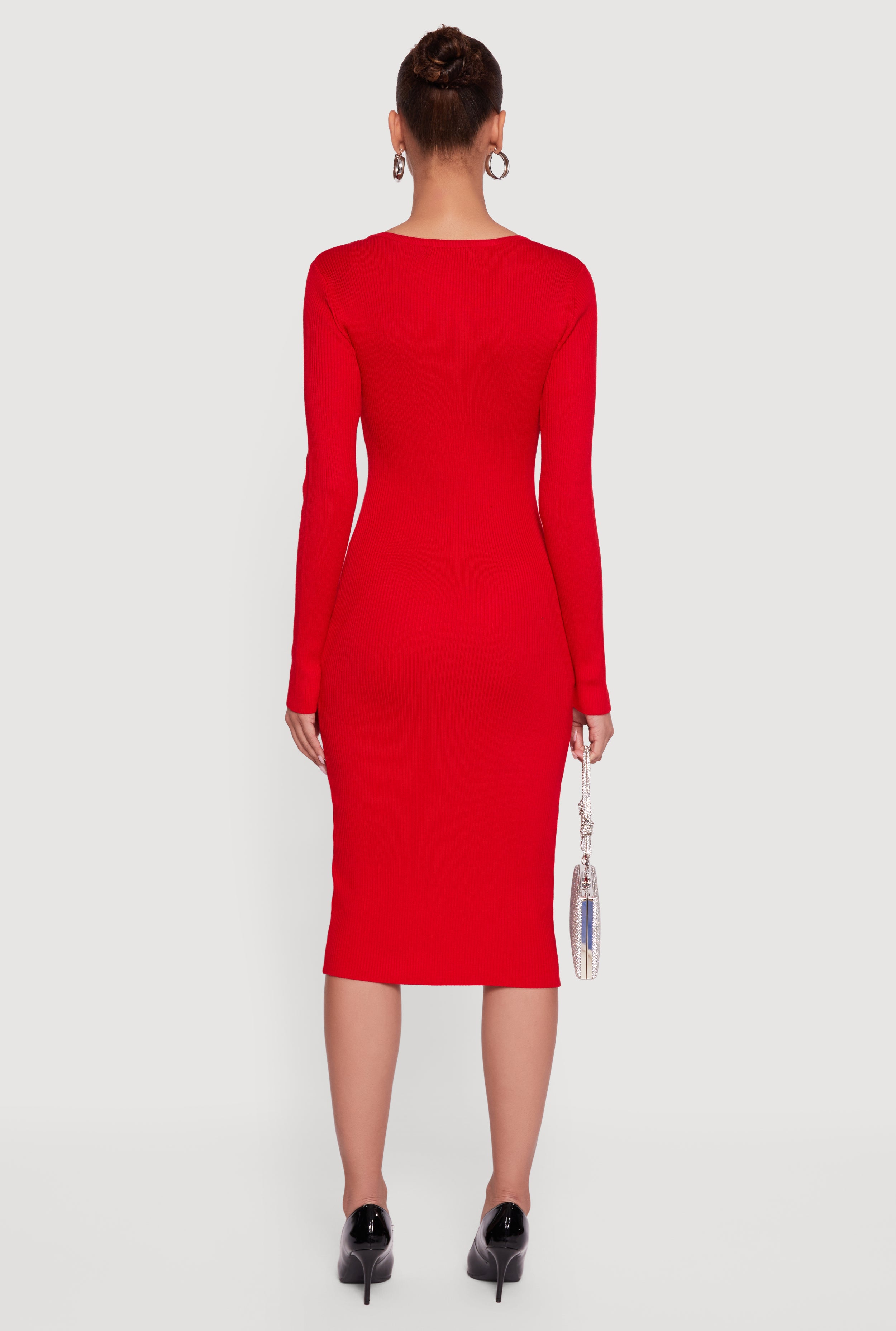 Step out in style with the Almost Famous Double Rhinestone Bow Keyhole Sweater Dress. This curve-hugging mid-length dress features a chic scoop neck and long sleeves, crafted from soft ribbed knit for all-day comfort. The standout double rhinestone bow and keyhole details add just the right amount of sparkle and playful charm, making it perfect for your next night out or party. Get ready to turn heads and feel fabulous without breaking the bank.