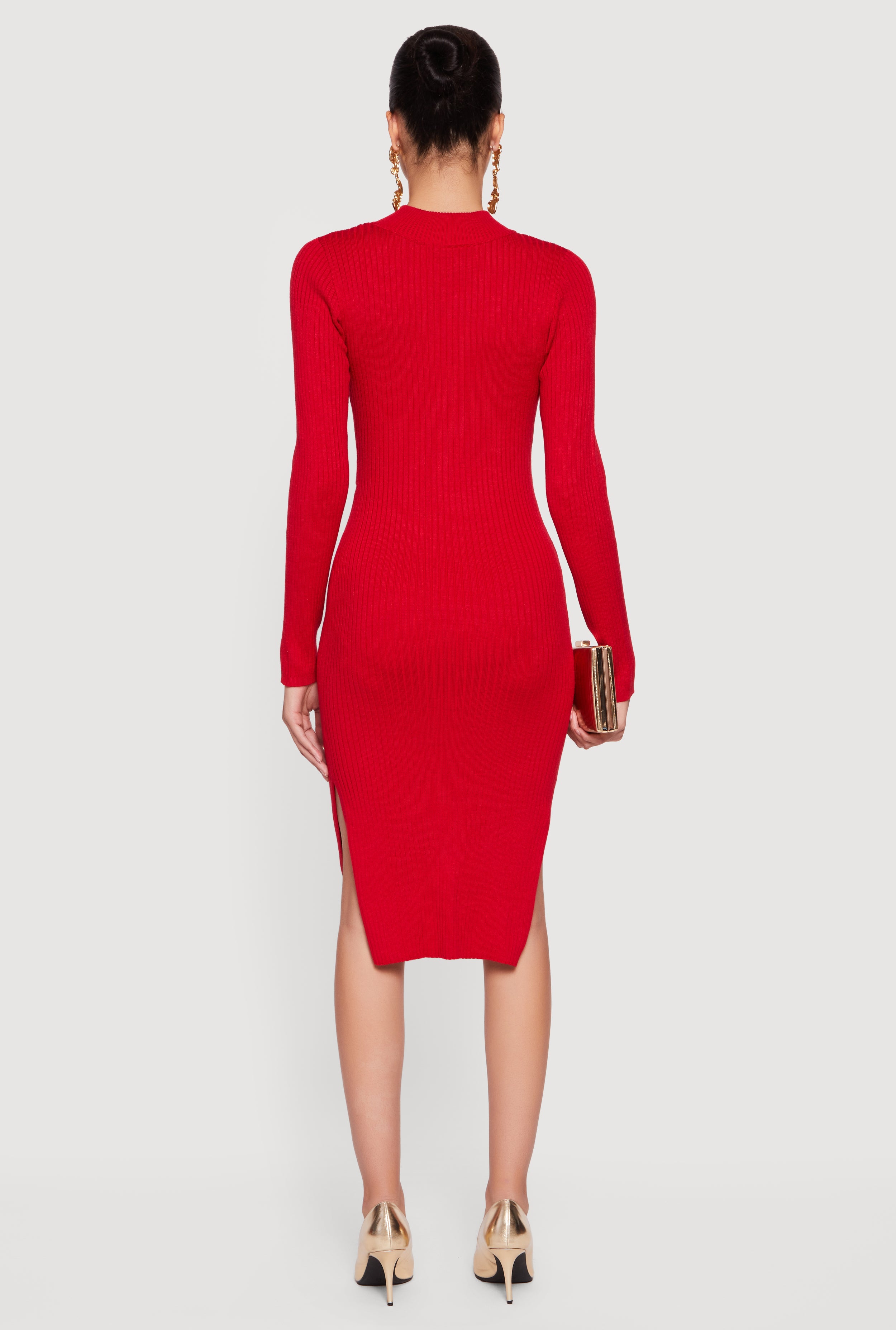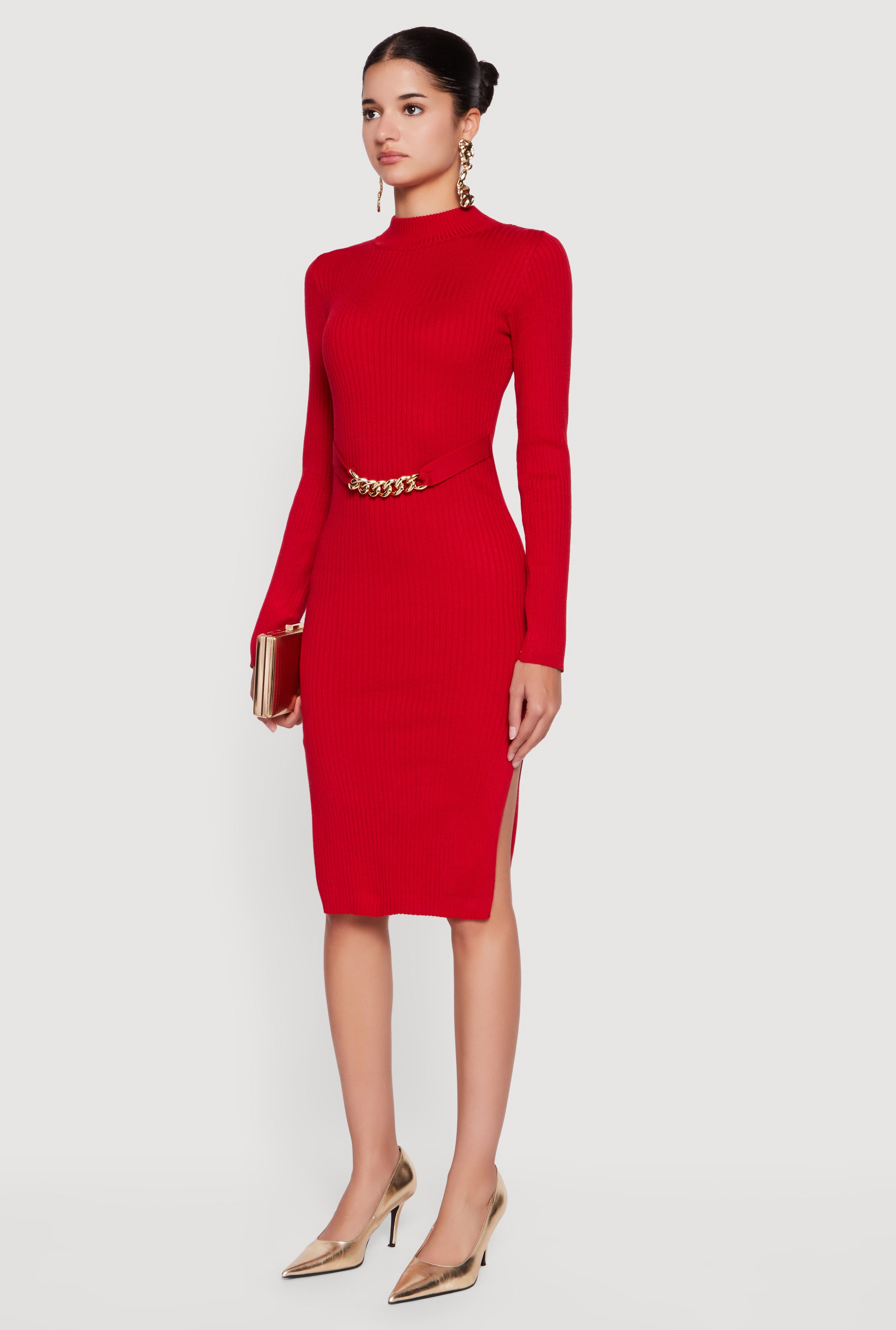 Step into effortless style with this Chain Belted Front Side Slit Sweater Dress. Designed to hug your curves in all the right places, its ribbed knit fabric and mock neck create a cozy yet chic look perfect for casual days or office vibes. The ornamental chain belt adds a trendy edge, while the side slit brings a flirty touch to your mid length silhouette. Elevate your wardrobe with this must-have dress that blends comfort and fashion seamlessly.