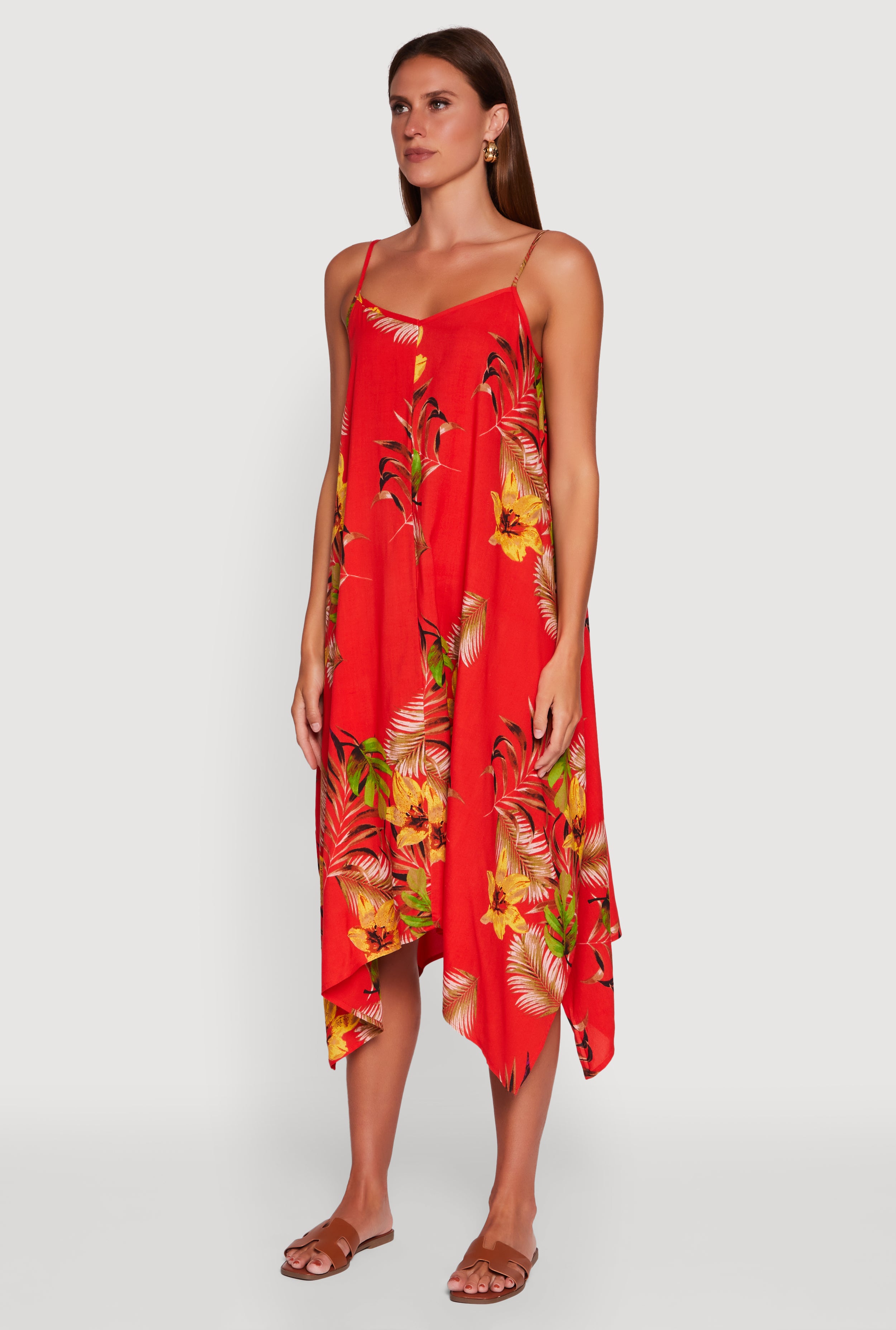 Step into effortless style with the Floral Print Sharkbite Hem Shift Dress. This long, sleeveless dress features a timeless classic fit and playful sharkbite hem that adds a flirty twist to your everyday look. The adjustable spaghetti straps and vibrant floral pattern make it perfect for casual hangouts or your next vacation escape. Easy to wear and impossible to ignore, this dress is your new go-to for sunny days and good vibes.