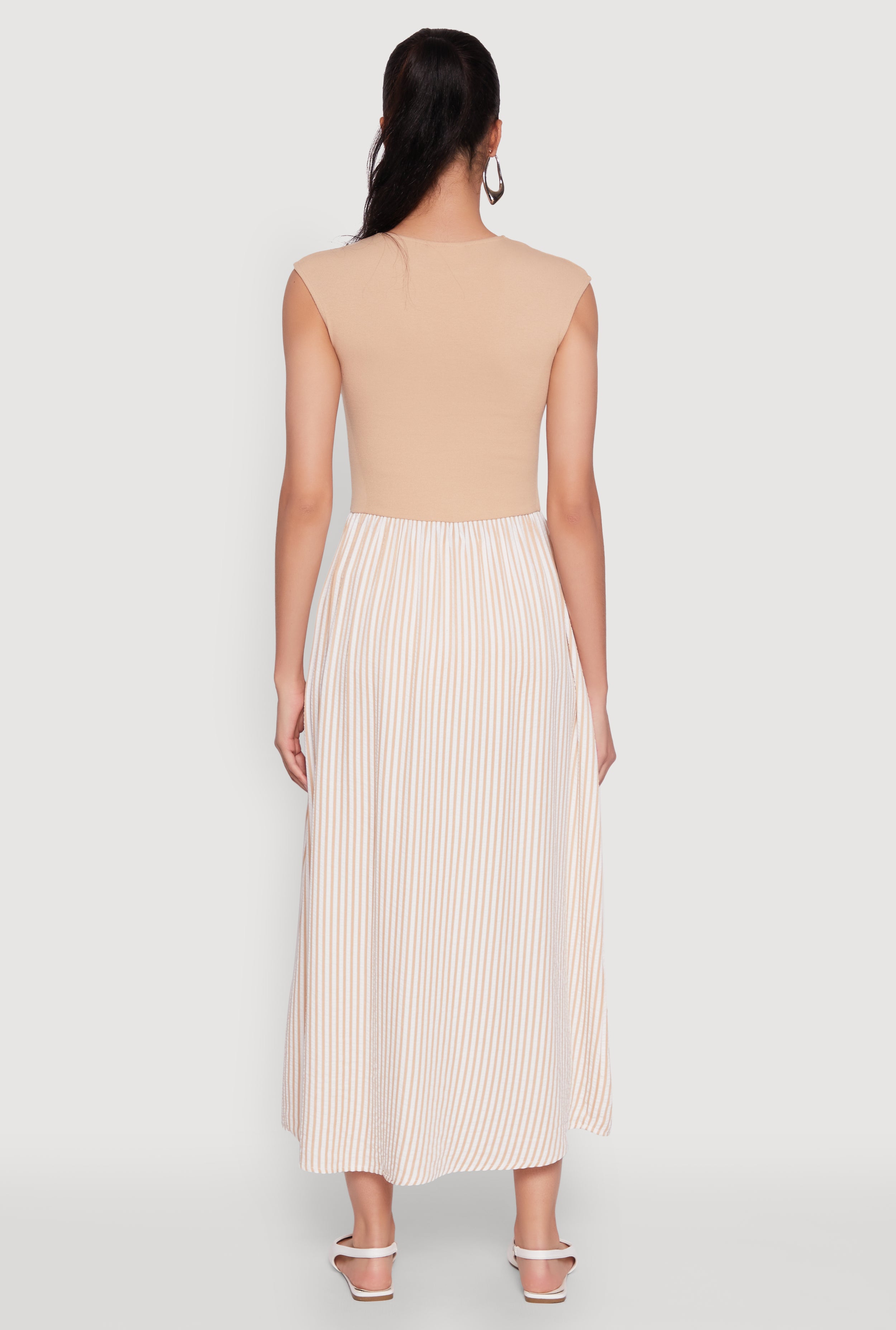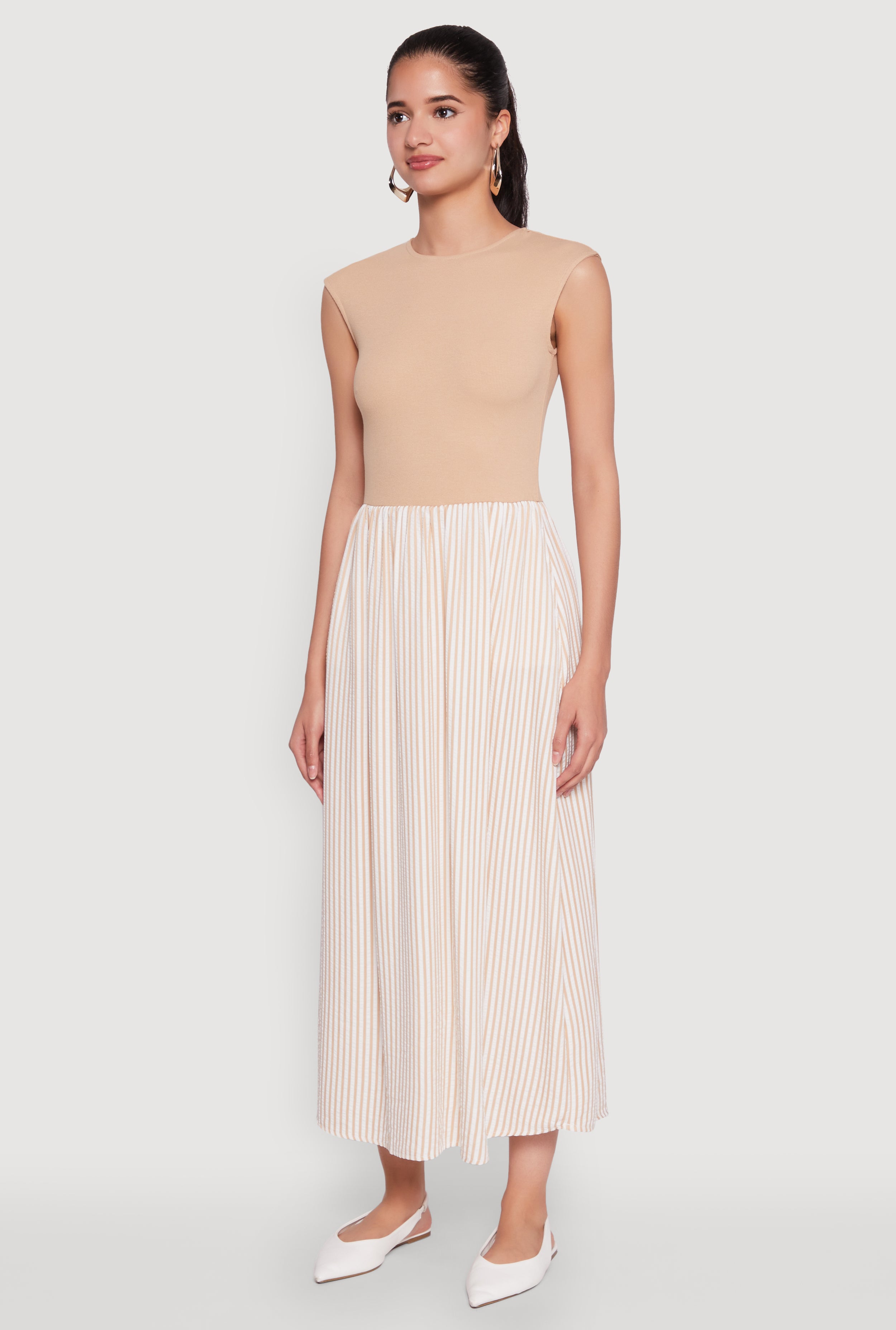 Step into effortless style with our Cap Sleeve Pinstripe Maxi Dress, perfect for turning heads at your next cocktail party. Its timeless silhouette and classic fit make it a versatile wardrobe staple that combines sophistication with a touch of fun. The high neckline and long length add an elegant vibe, while the ribbed knit material ensures all-day comfort. Whether you're dancing the night away or enjoying a stylish brunch, this dress is your new go-to for looking fabulous without breaking the bank.