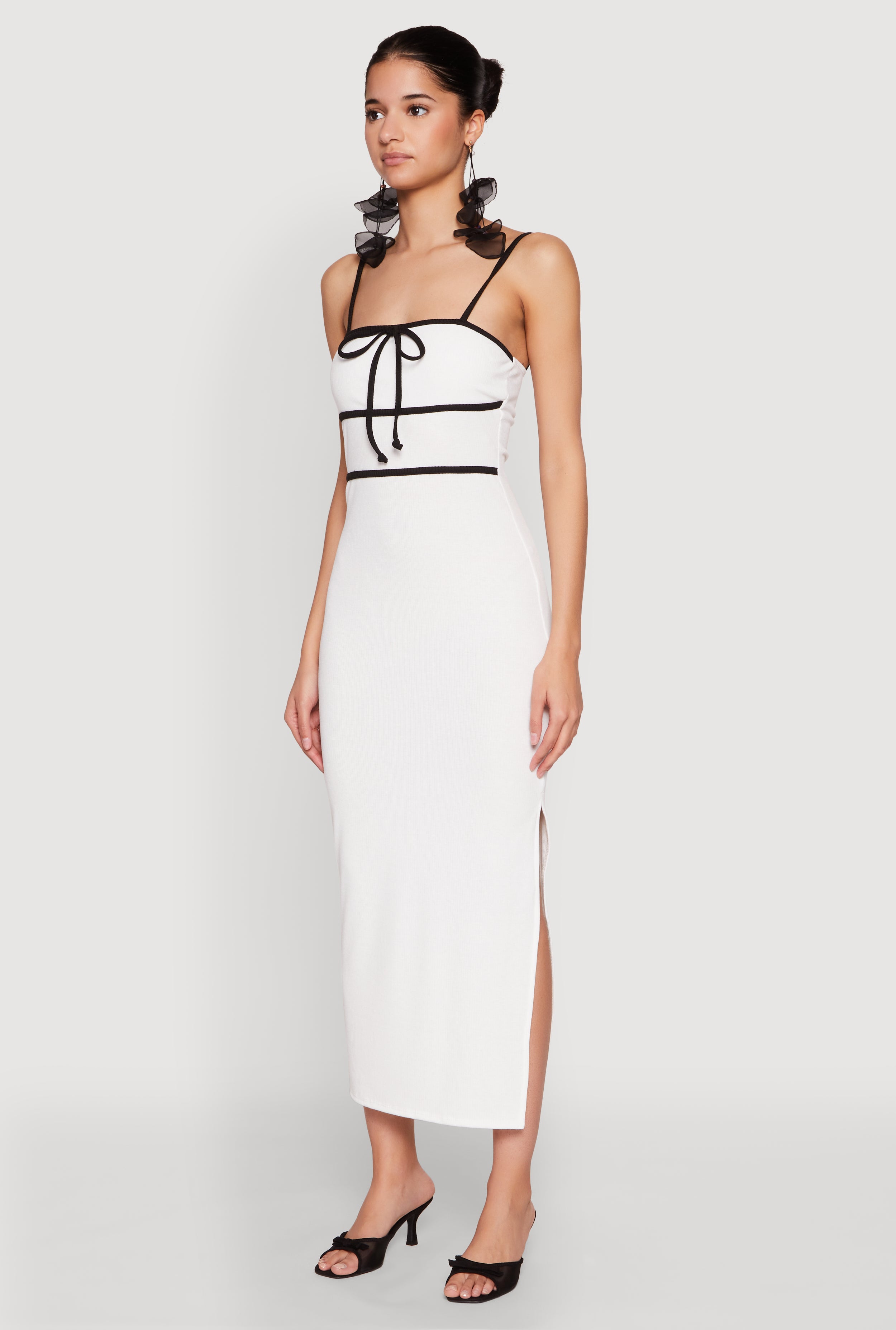 Step up your style game with the Contrast Trim Tie Front Side Slit Dress, the perfect blend of flirty and fun for your casual days. This long-length, ribbed knit dress features a flattering curve-hugging fit and a chic square neckline that highlights your best features. The side slit adds just the right touch of sass, making it a must-have for effortless, everyday glam. Whether you're out brunching or hanging with friends, this dress keeps you looking cute and feeling confident all day long.