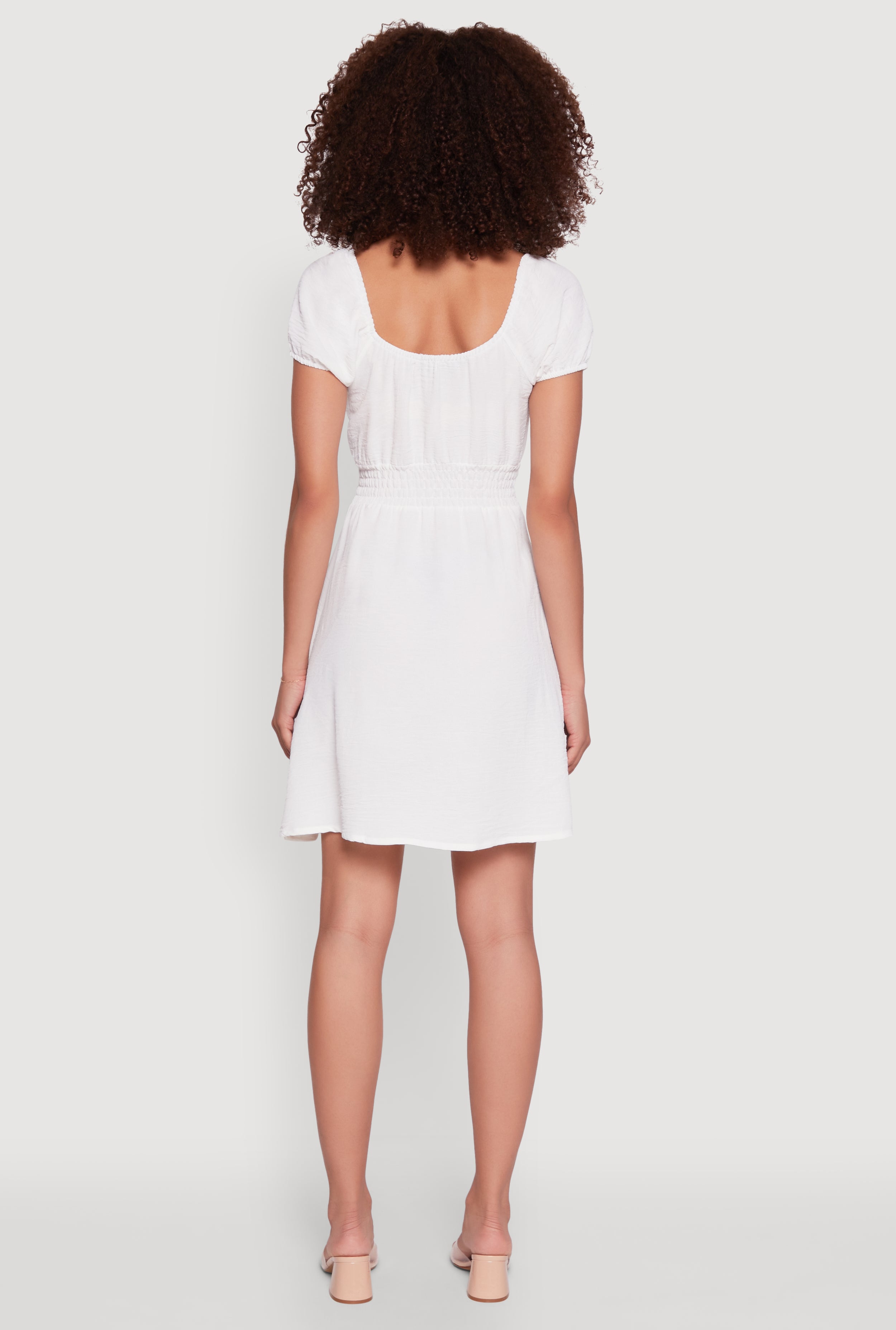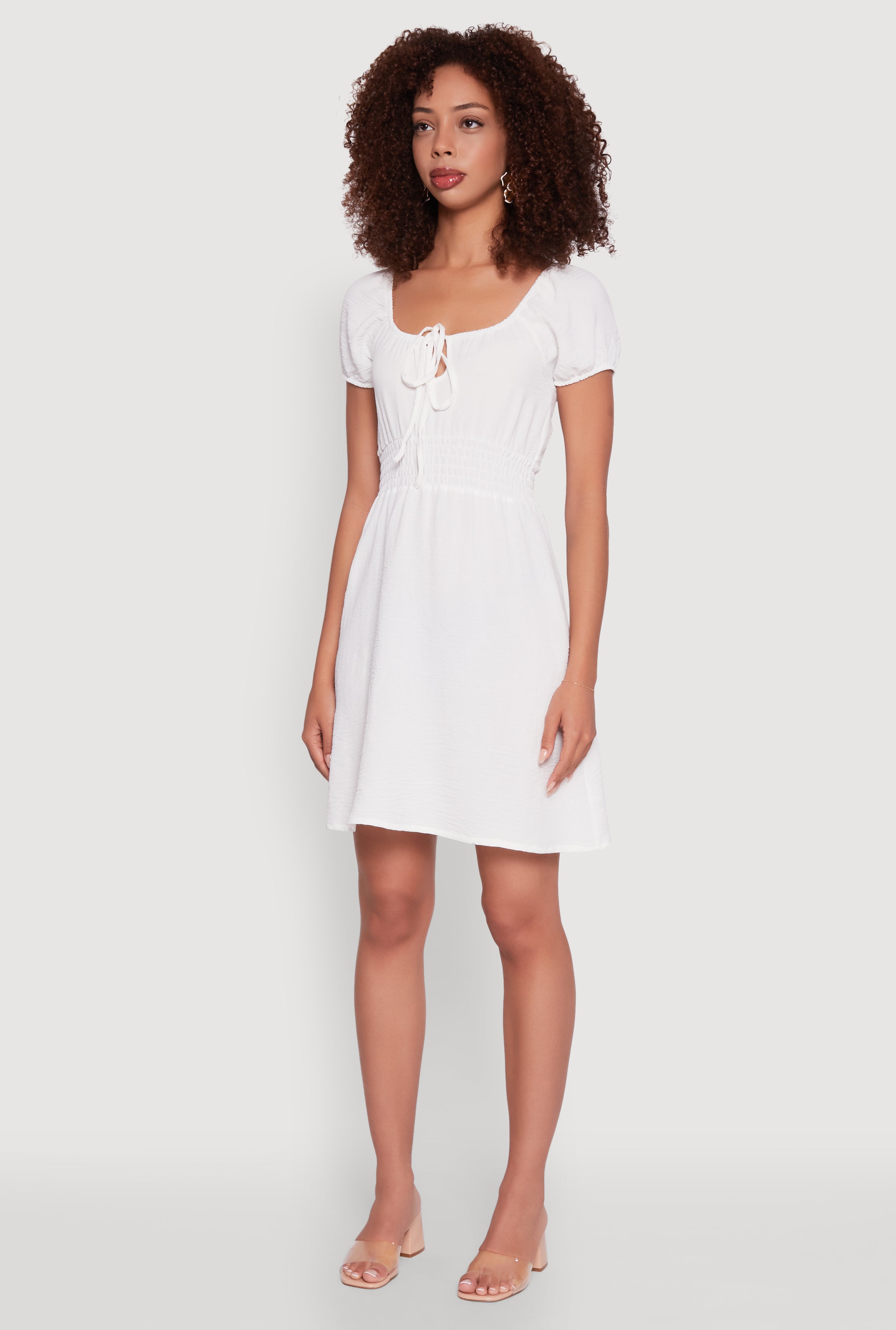 Step into effortless charm with the Crepe Knit Puff Sleeve Peasant Dress. This short length dress brings a fresh twist to your casual wardrobe with its classic fit and timeless silhouette. The square neckline and puff sleeves add a playful vibe, while the smocked keyhole detail and tie closure keep things flirty and fun. Perfect for sunny days or casual hangouts, this dress is your new go-to for easy style that feels as good as it looks.