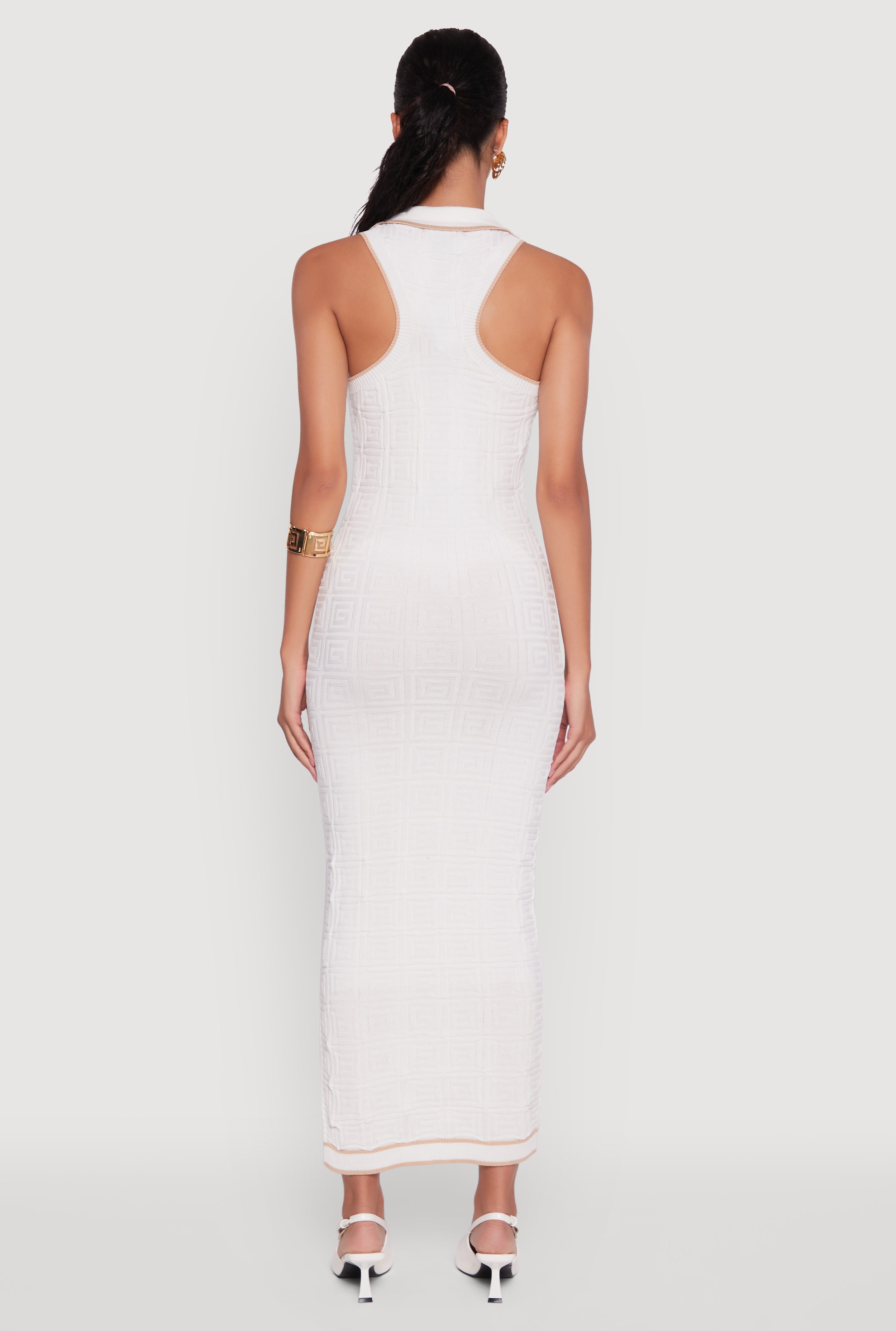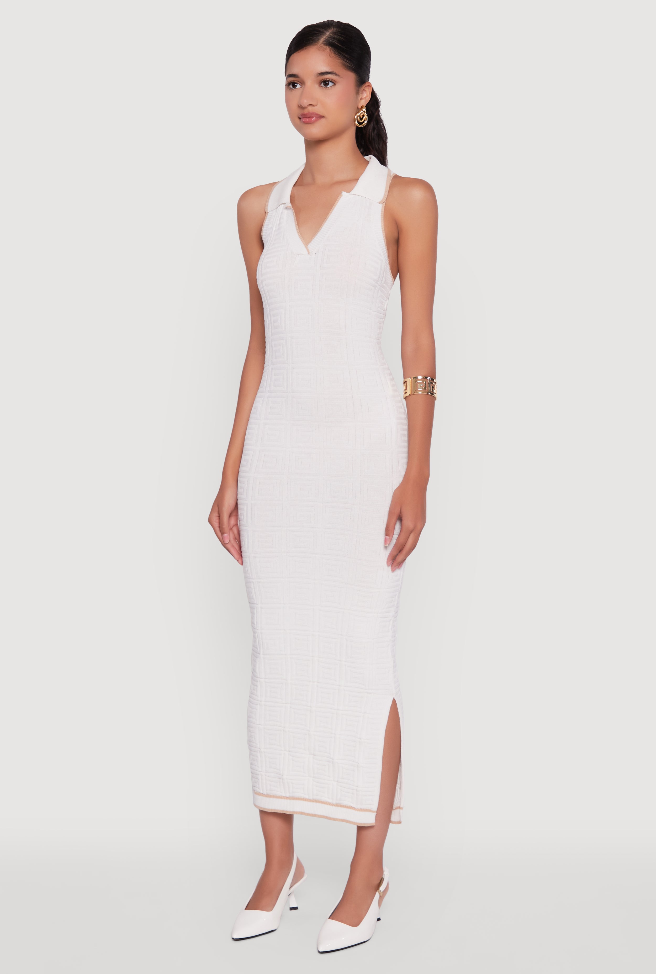Step up your style game with this Textured Knit Greek Key Patterned Midi Dress. Designed to hug your curves and show off your silhouette, this sleeveless bodycon dress features a chic polo collar and a subtle side slit for just the right amount of sass. The classic Greek key pattern adds a touch of timeless elegance, while the textured knit fabric keeps things comfy and cool. Perfect for days when you want to look effortlessly put together without trying too hard.