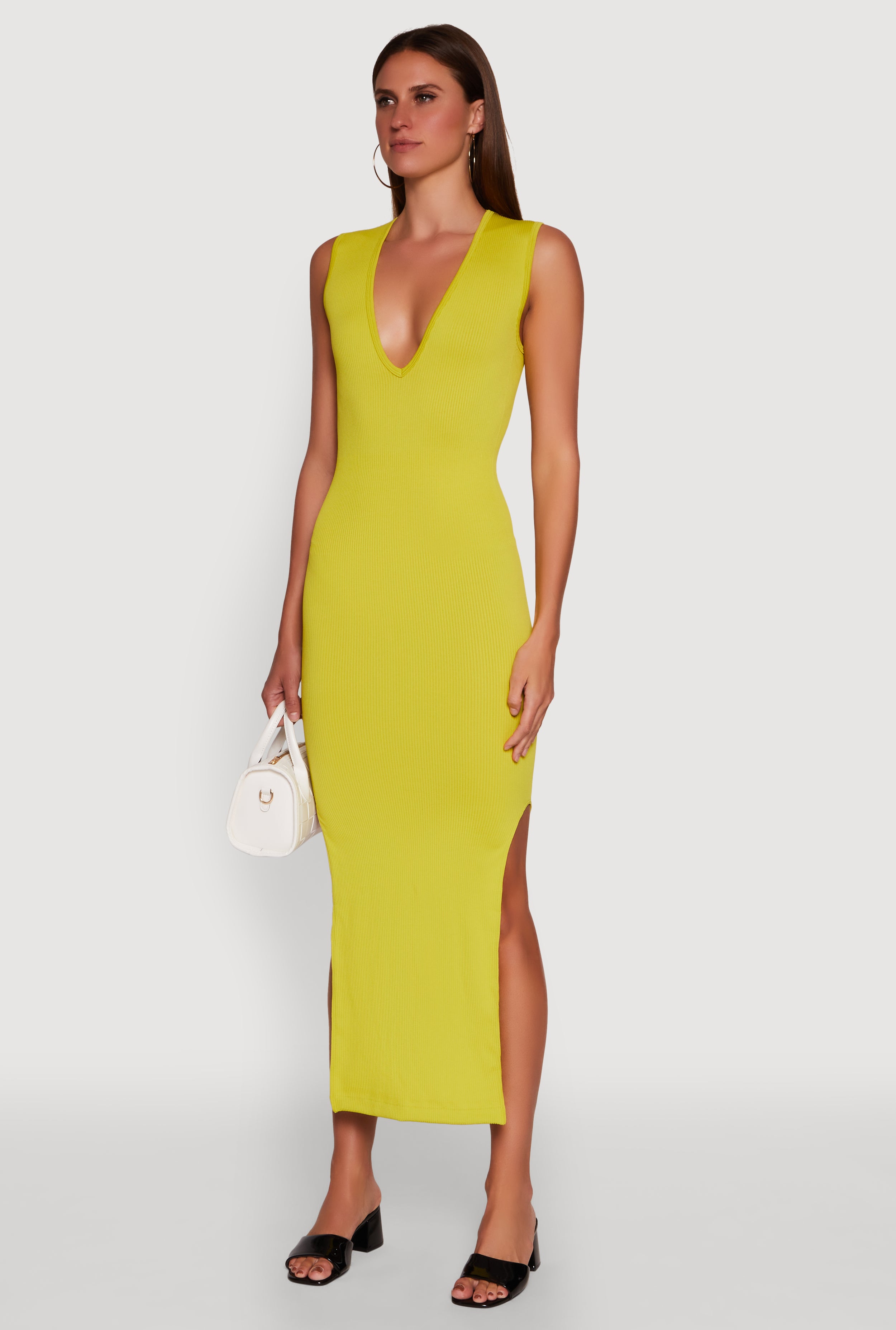 Trendy Rib Knit Plunge Neck Side Slit Maxi Dress