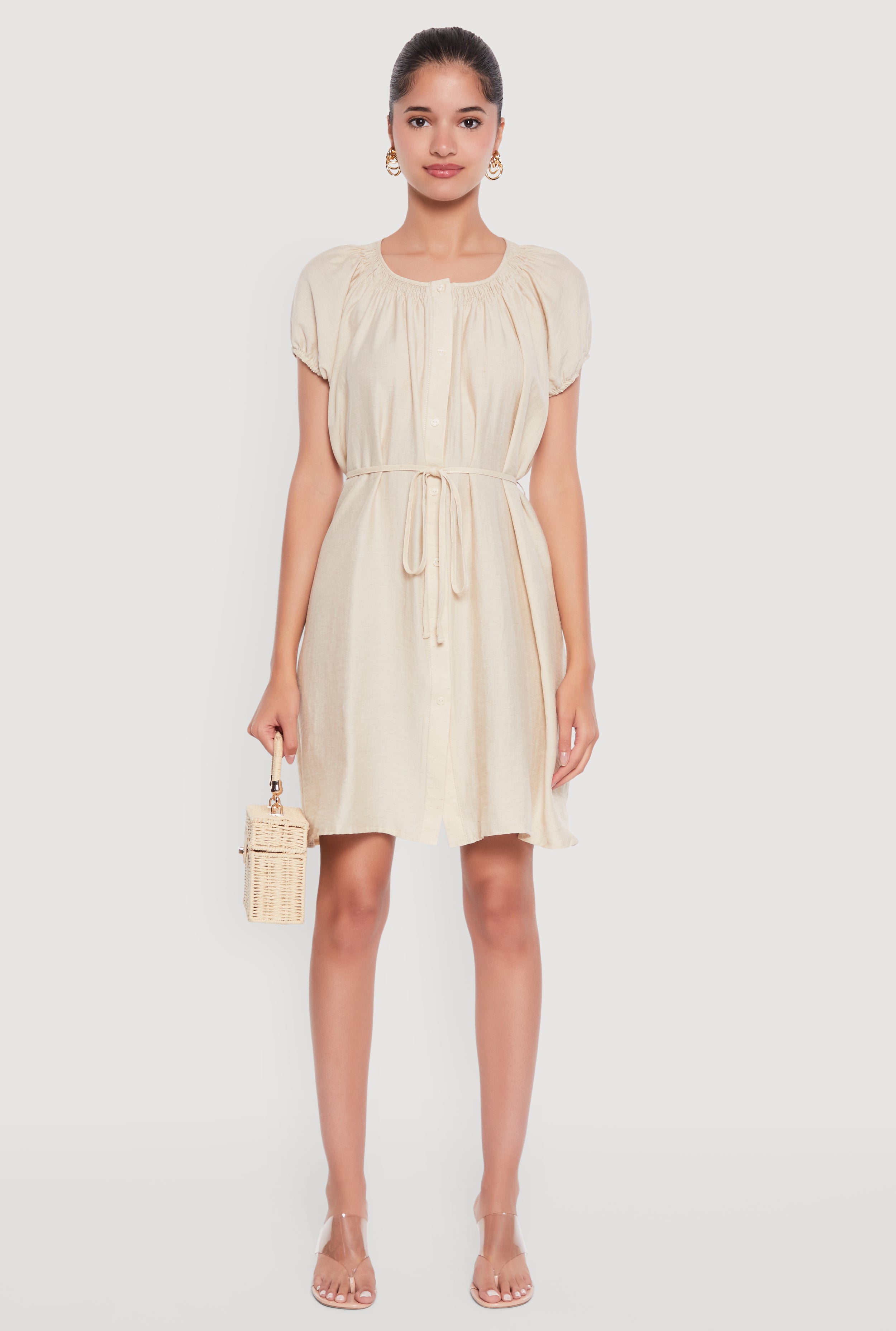 Chic Linen Peasant Dress with Pockets and Tie Waist Belt