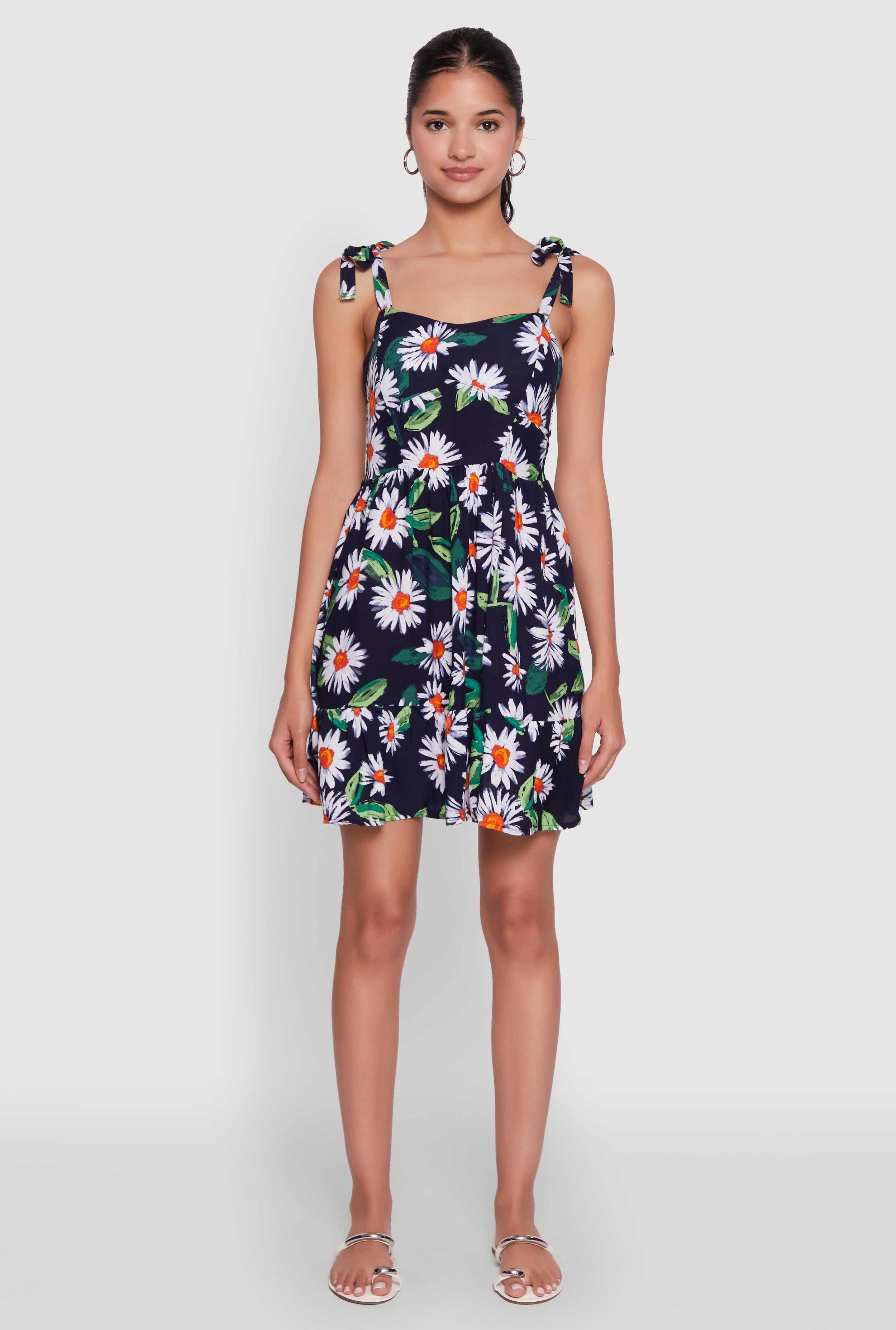 Floral Daisy Print Sleeveless Sundress with Tie Straps