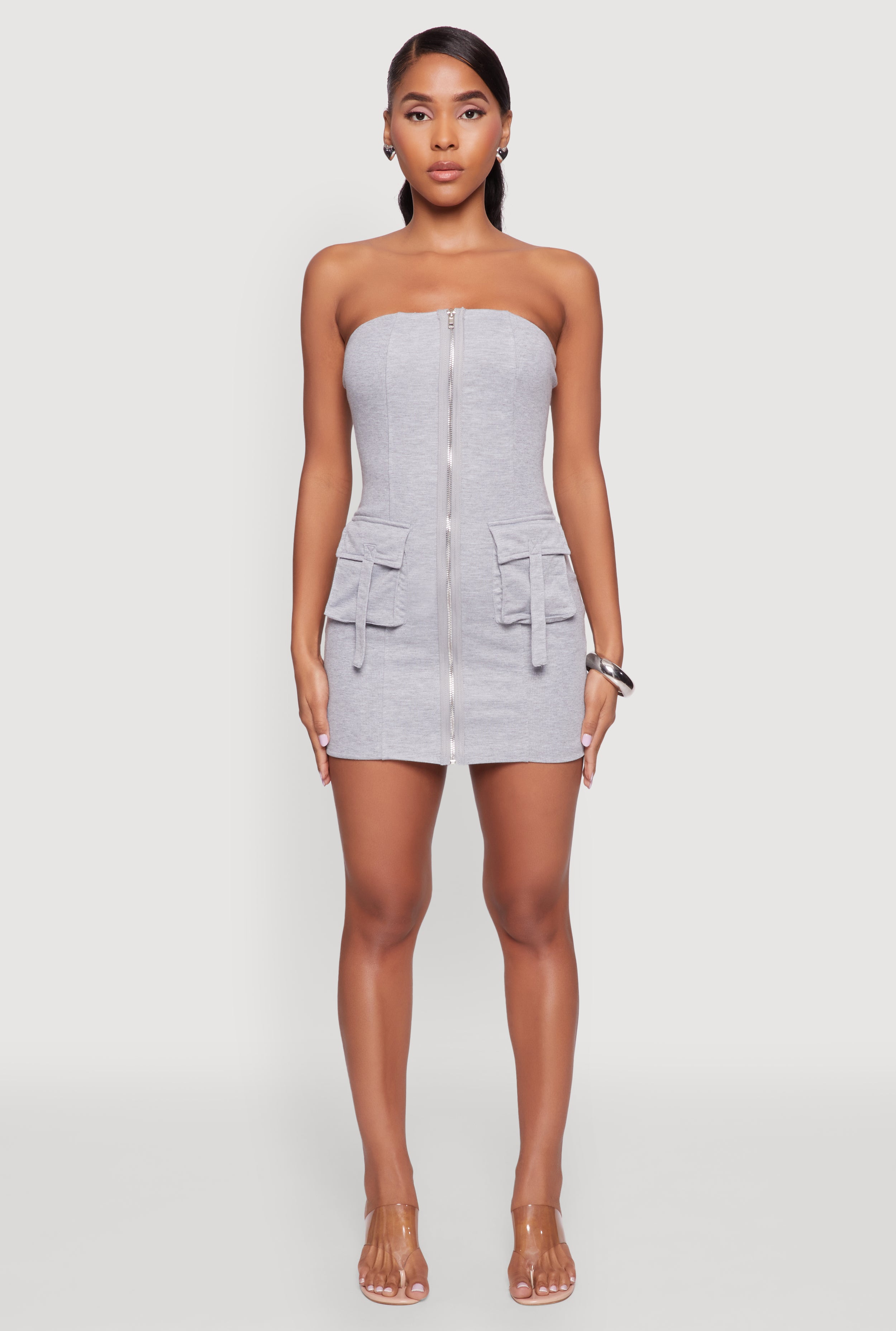 Ribbed Knit Zip Front Cargo Pocket Tube Dress