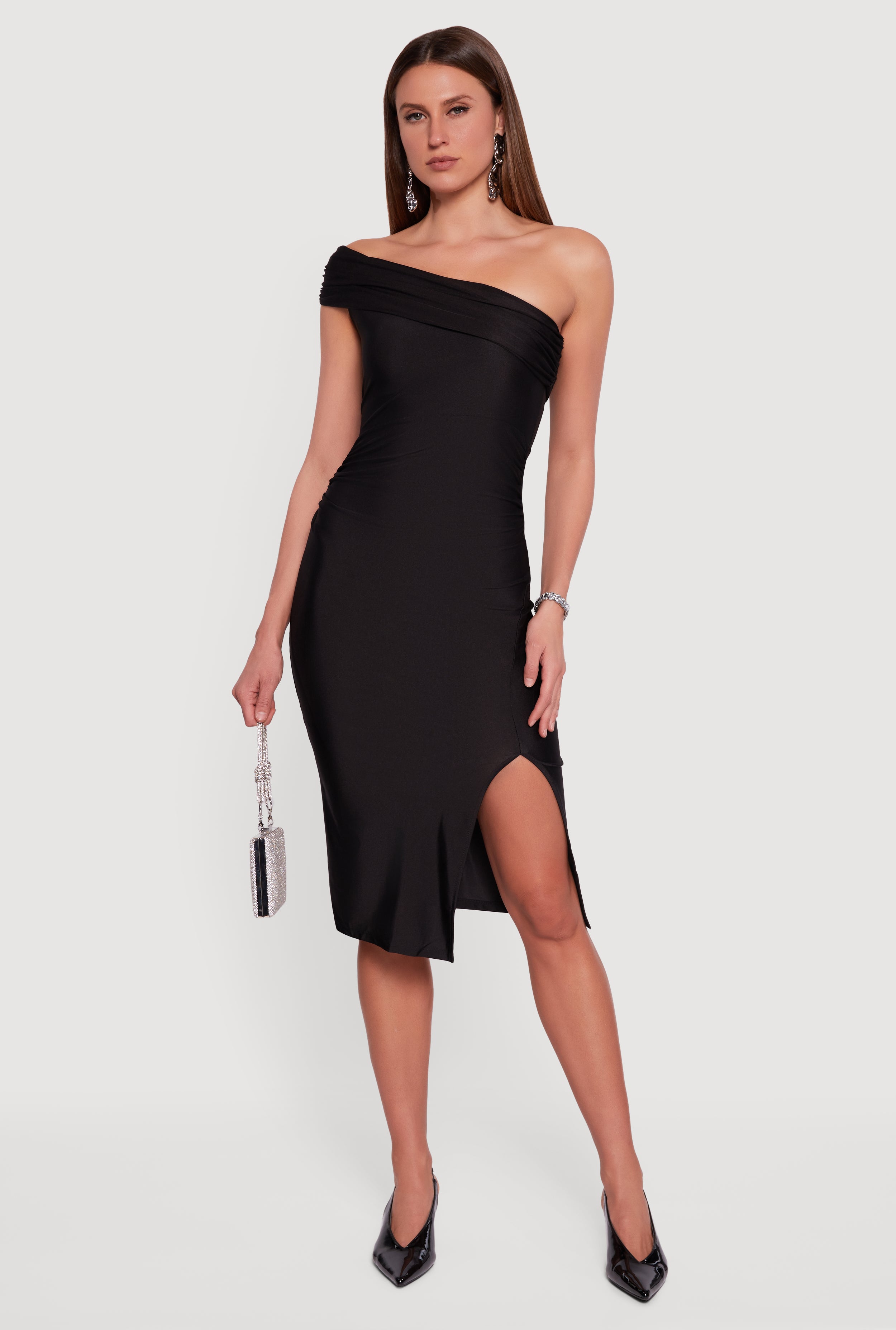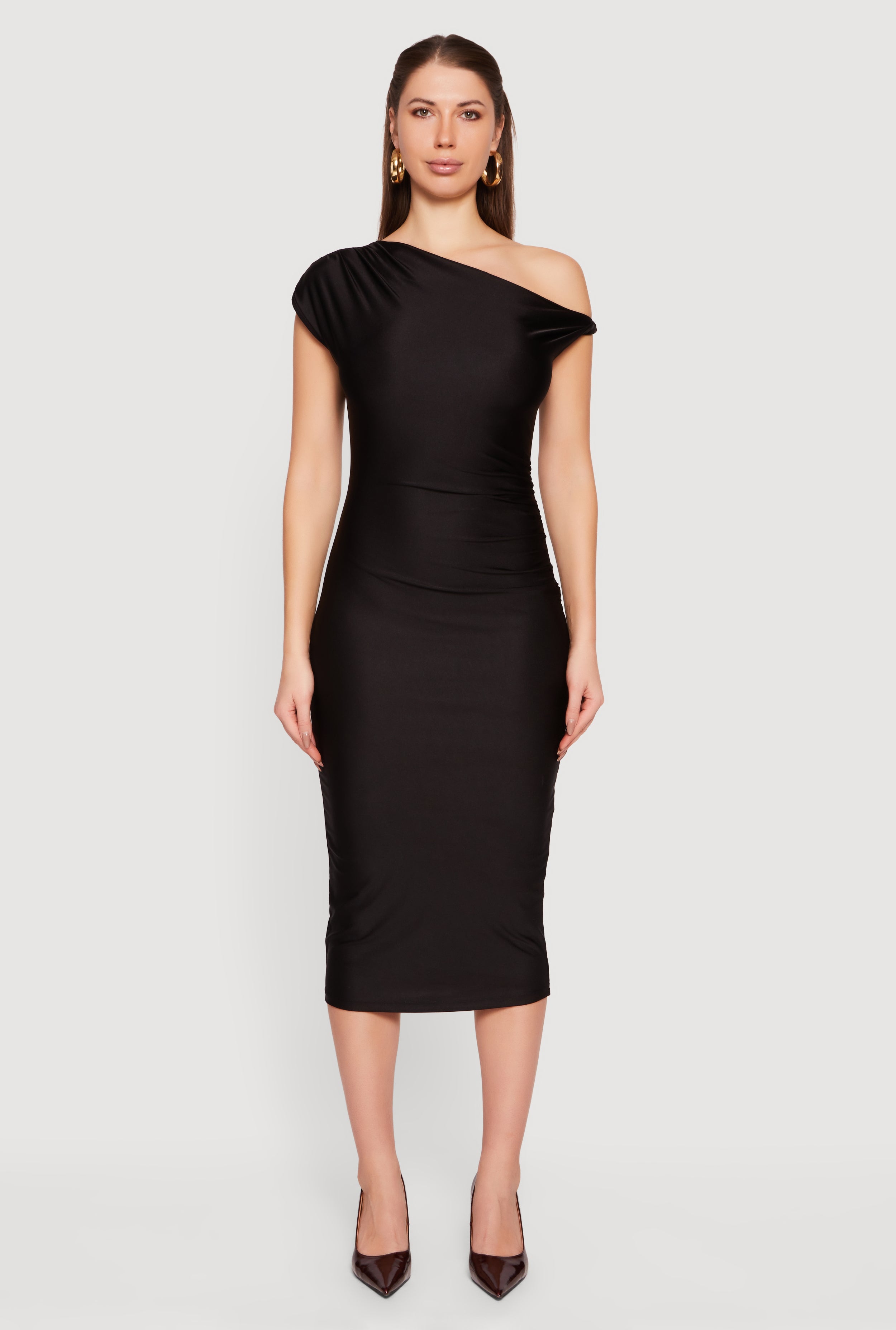 One Shoulder Cap Sleeve Ruched Midi Dress