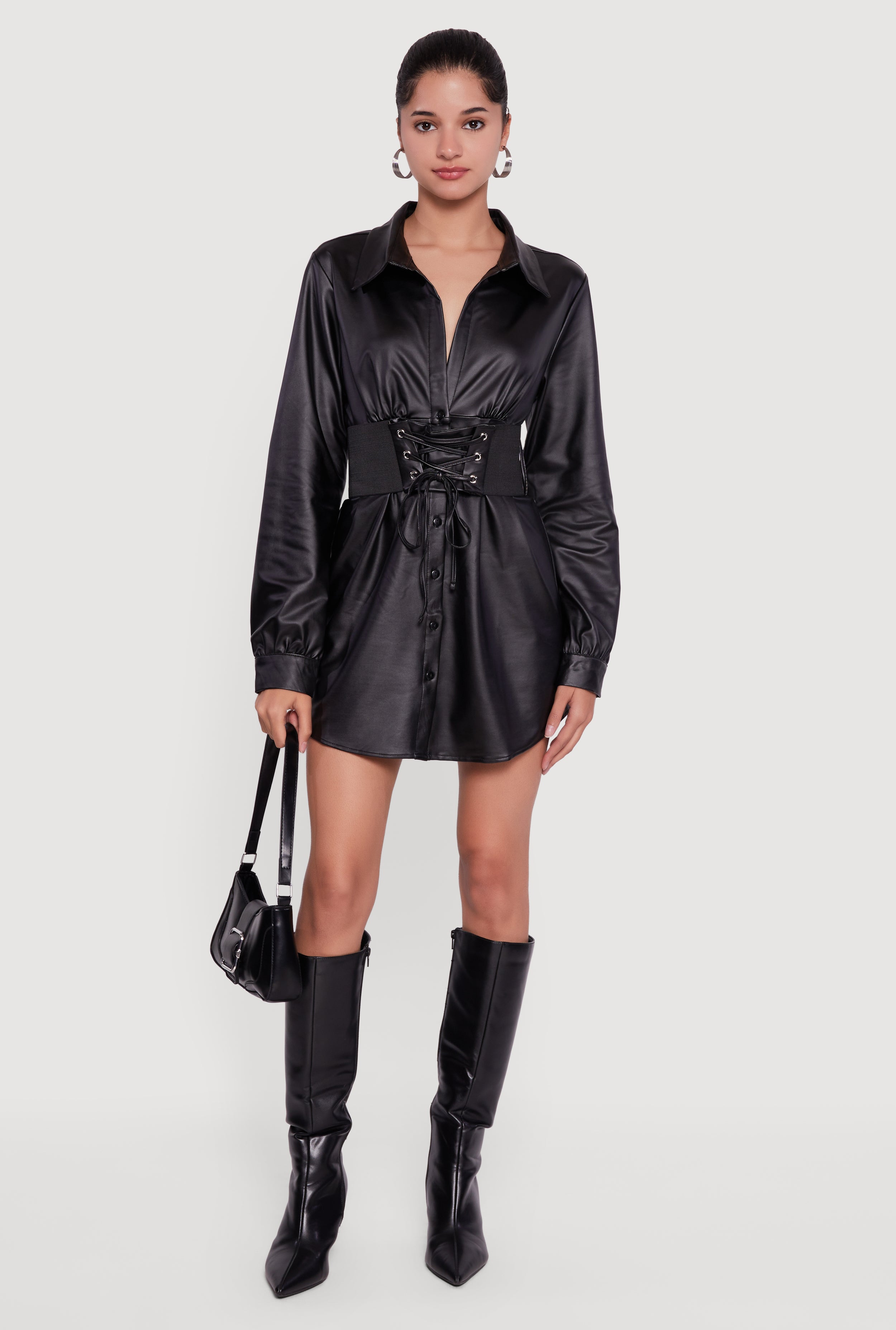 Faux Leather Tie Waist Belted Snap Button Front Dress