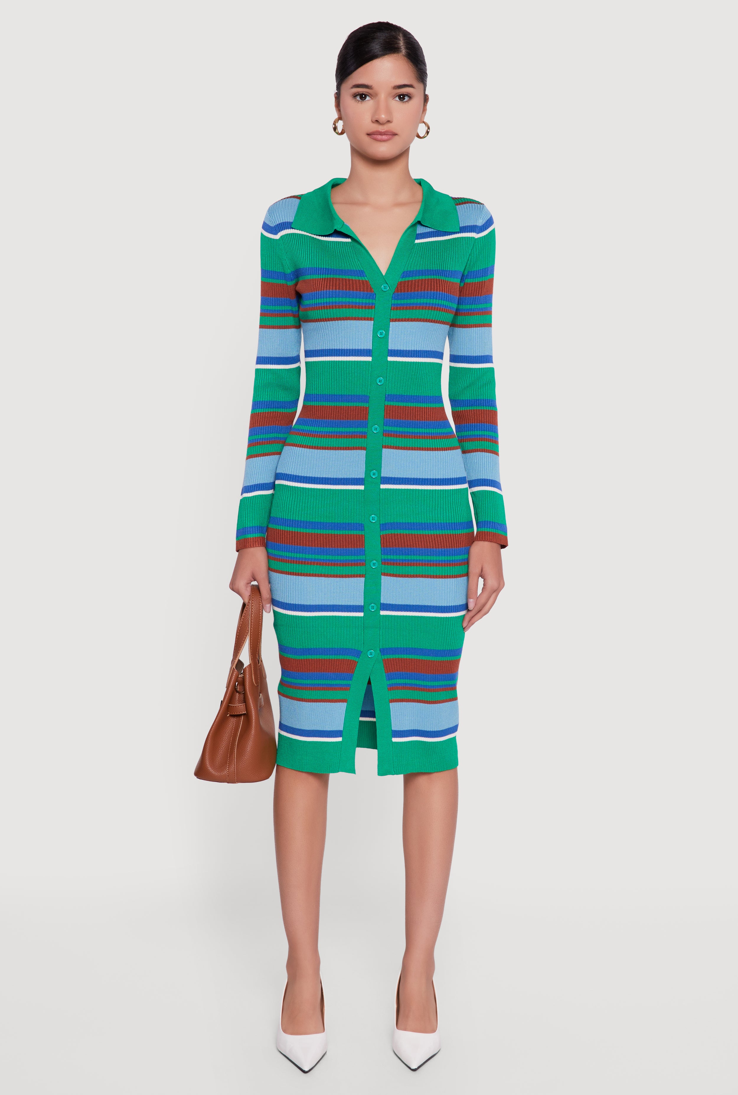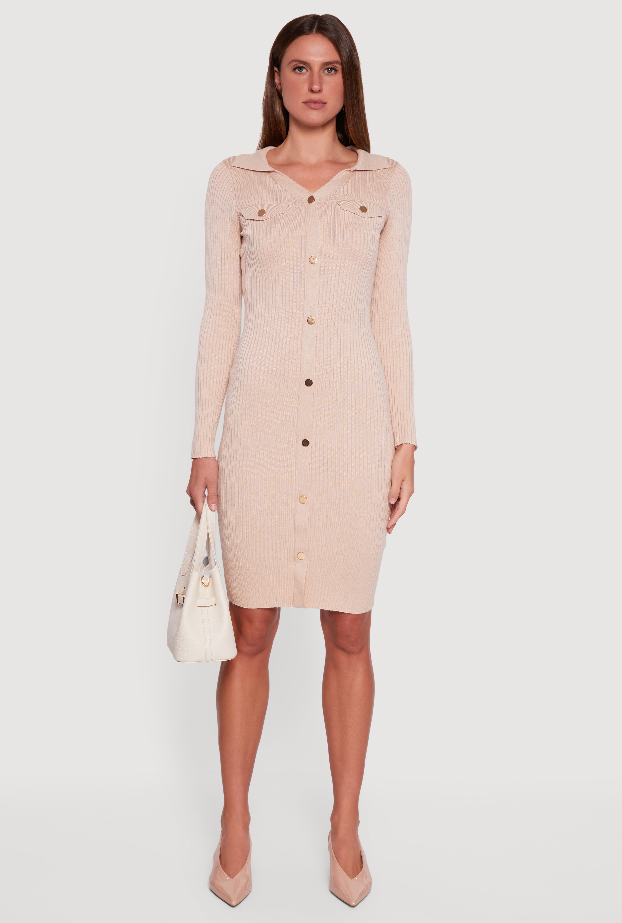 Collared Rib Knit Button Detail Midi Sweater Dress