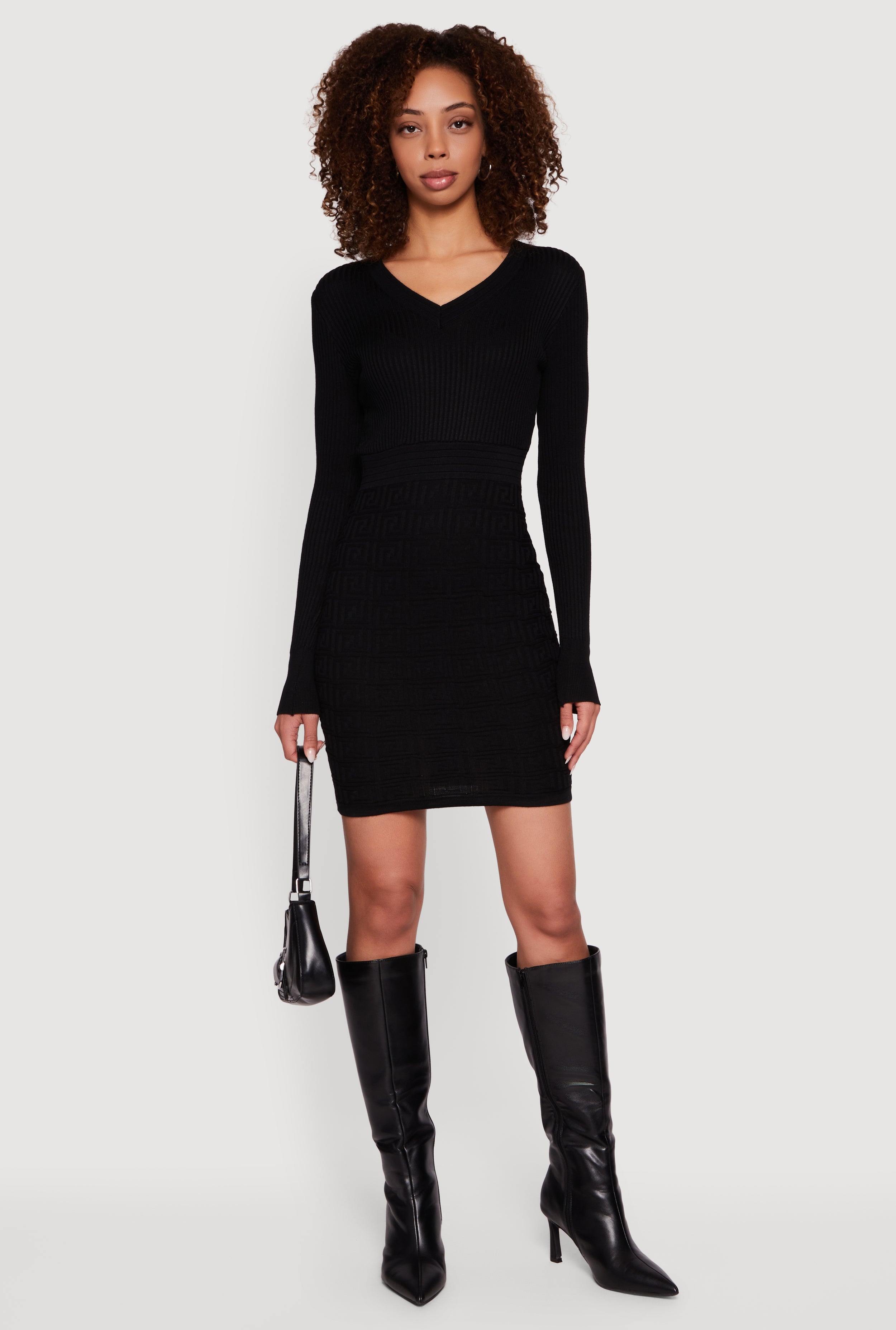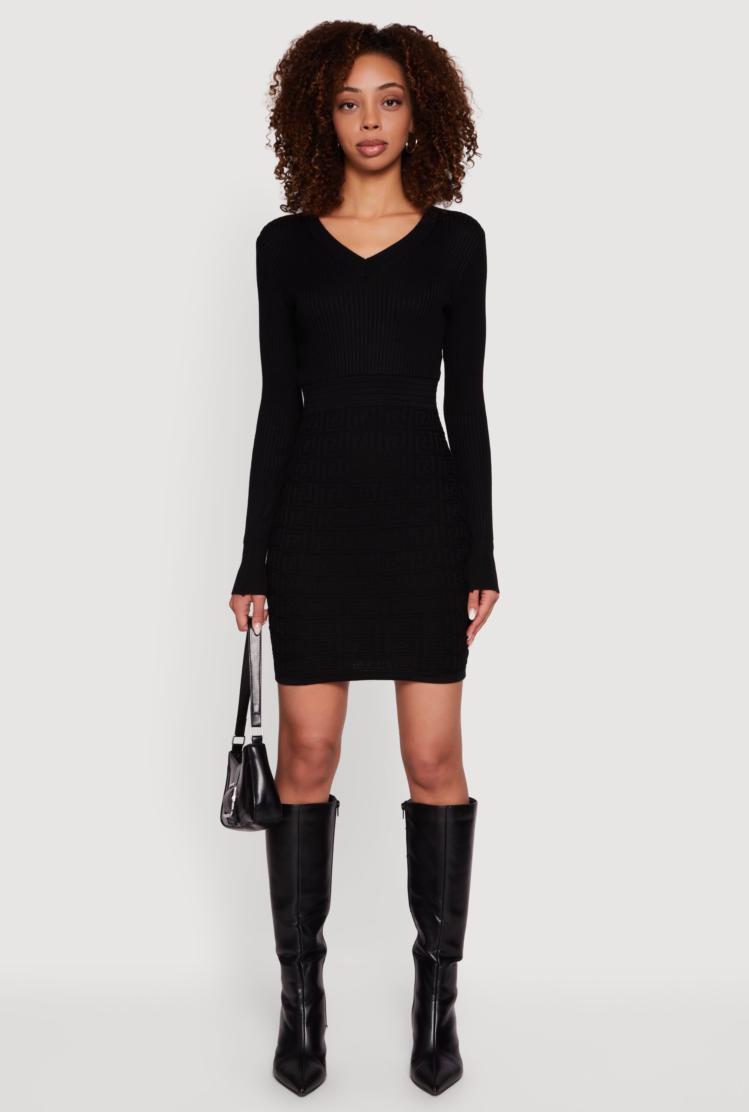 Greek Key Rib Knit Long Sleeve V-Neck Sweater Dress