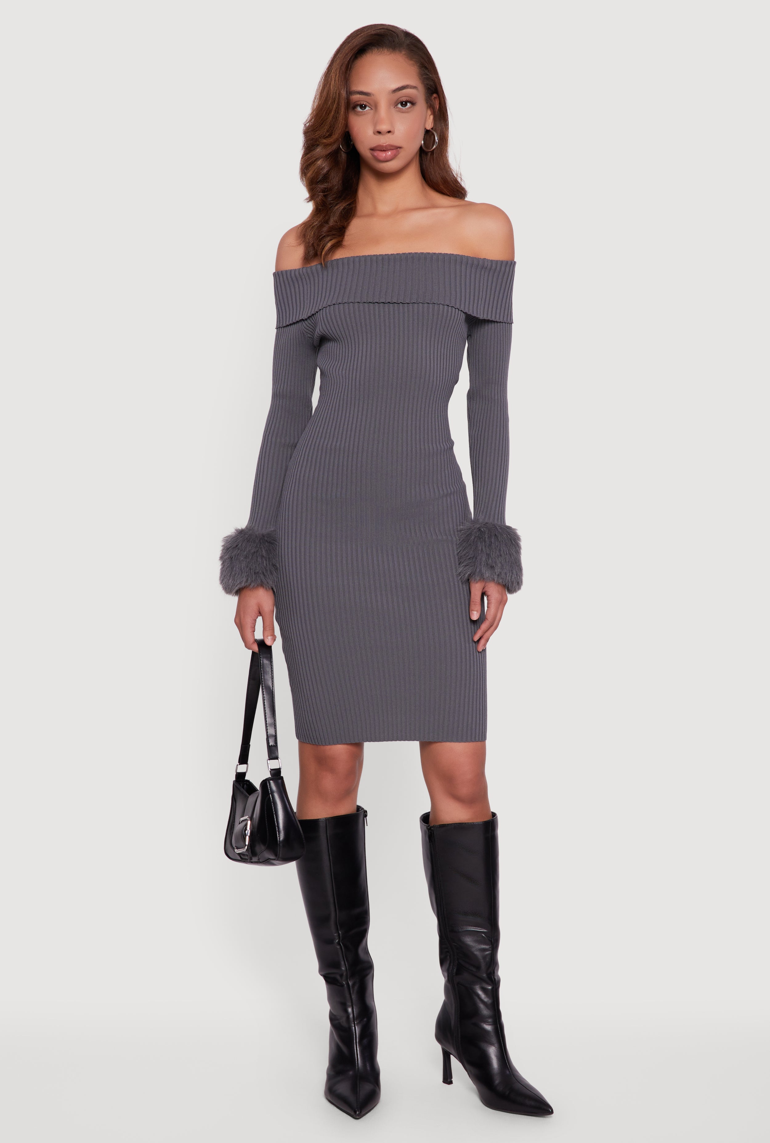 Faux Fur Cuff Fold Over Off the Shoulder Sweater Dress