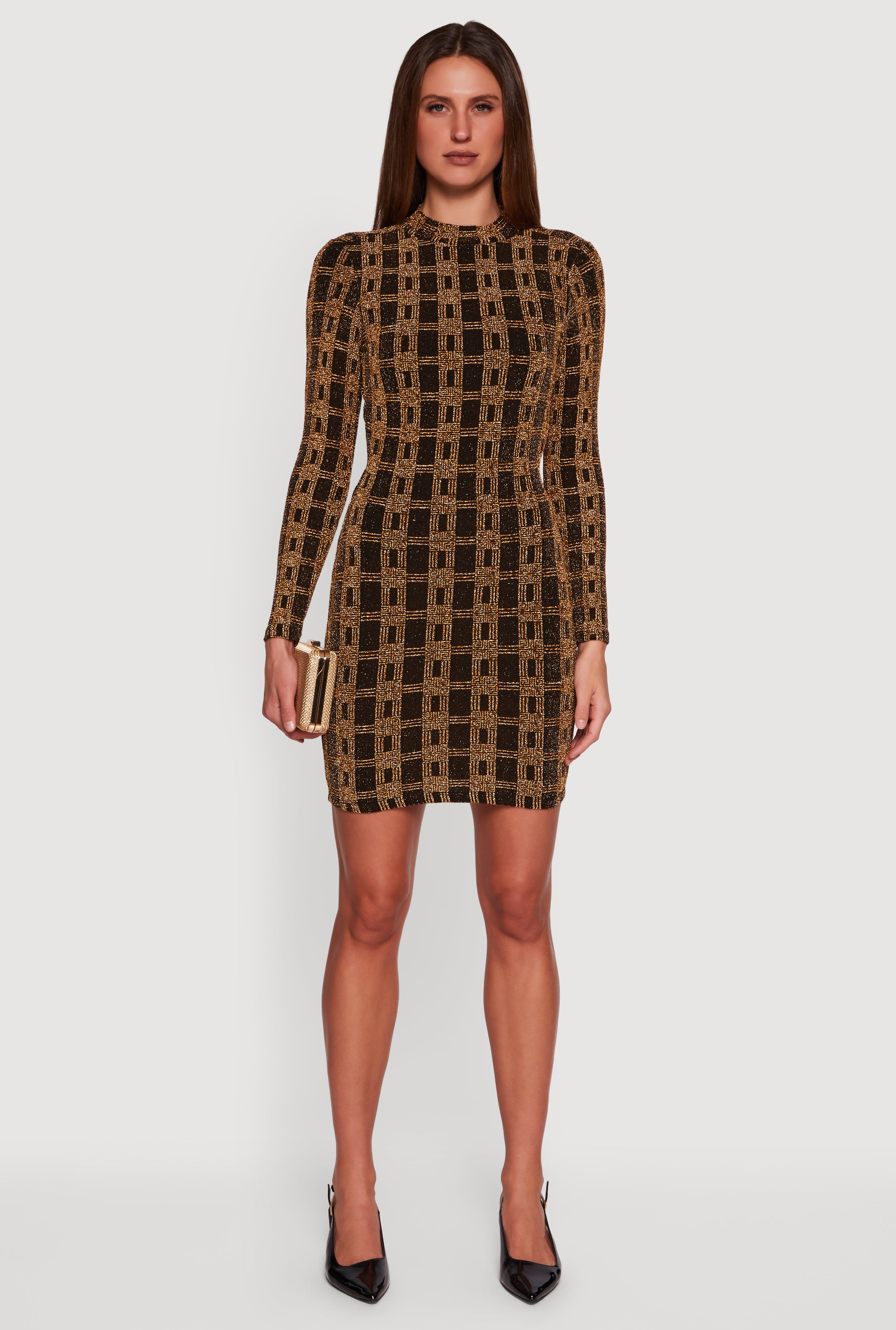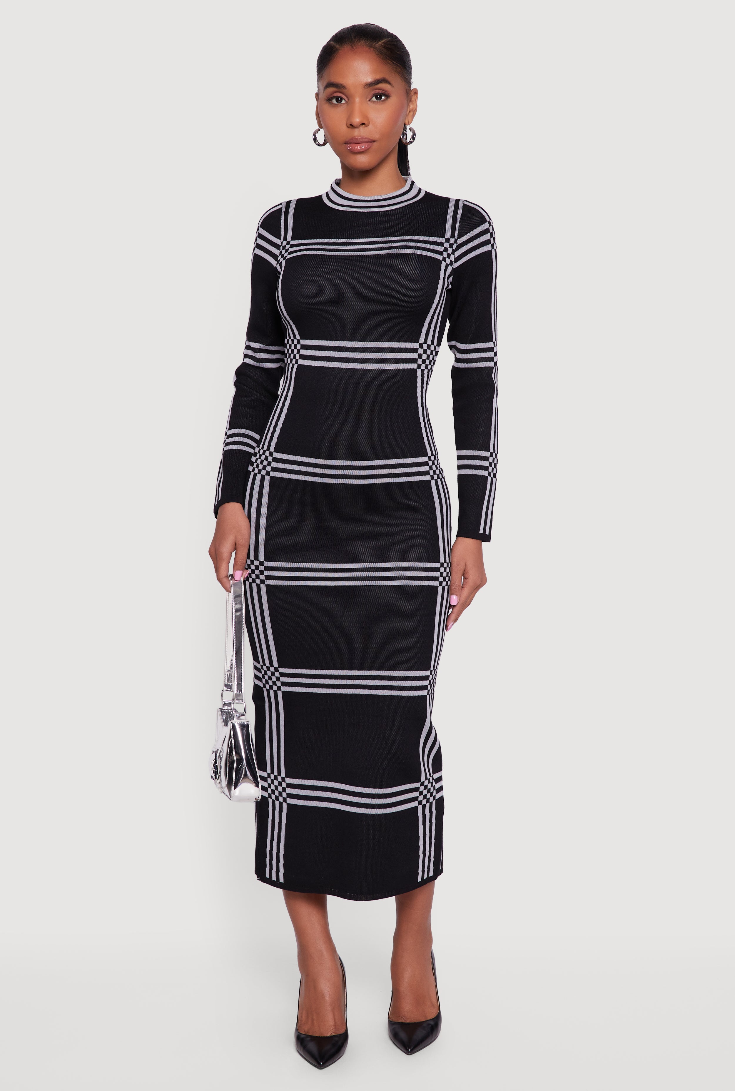 Long Sleeve Windowpane Plaid Back Slit Sweater Dress
