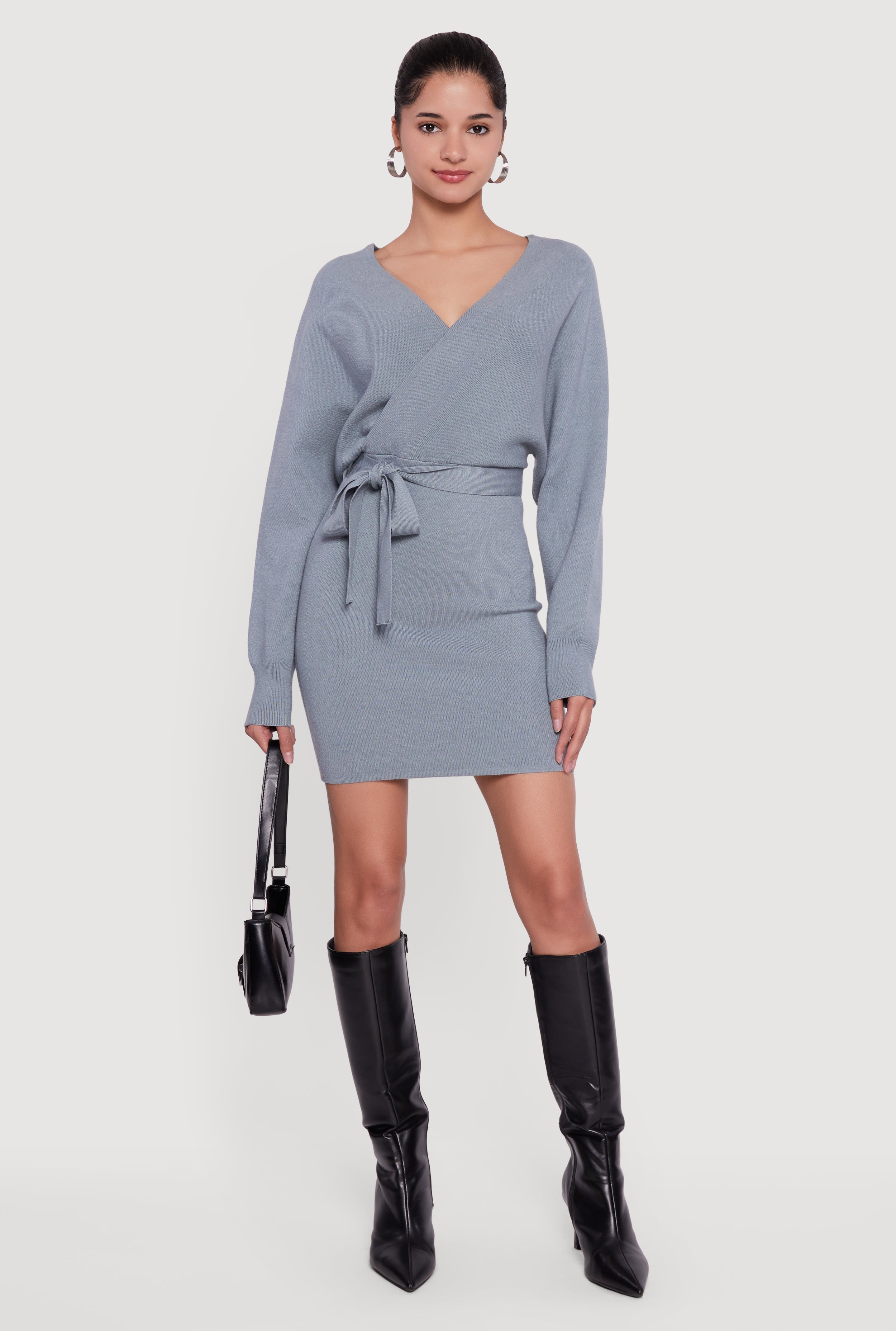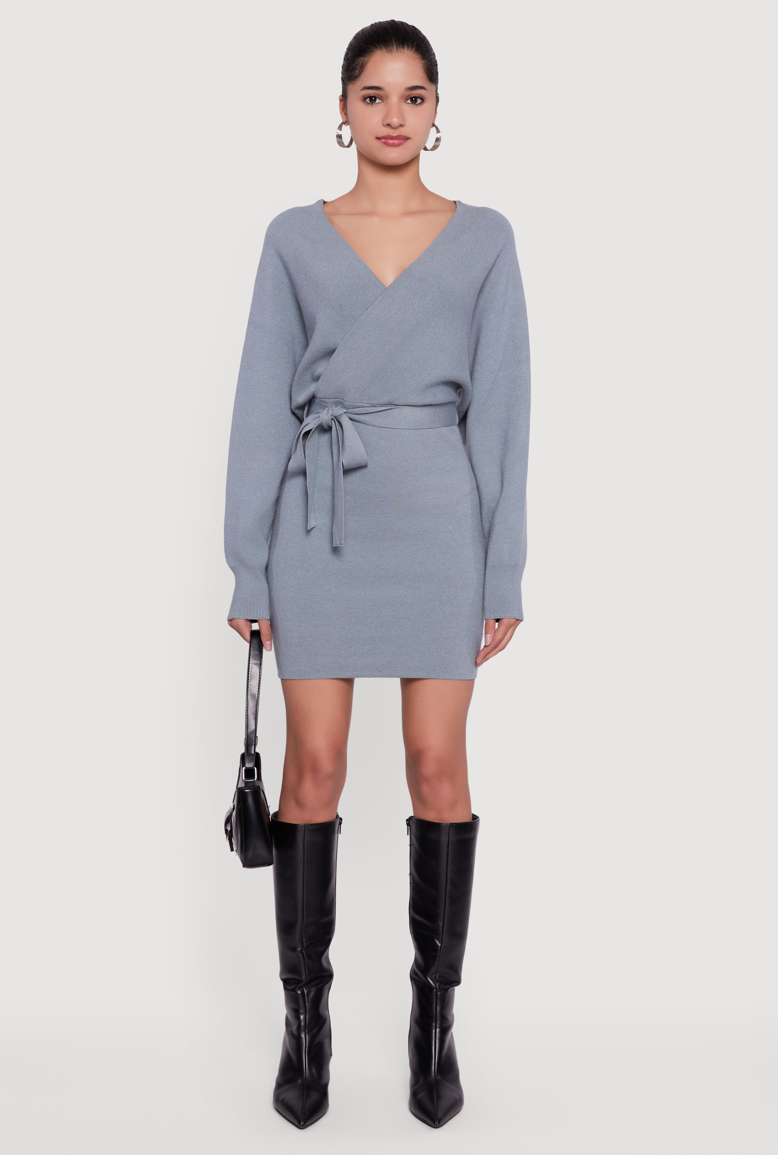 Tie Waist Belted Long Sleeve Faux Wrap Sweater Dress