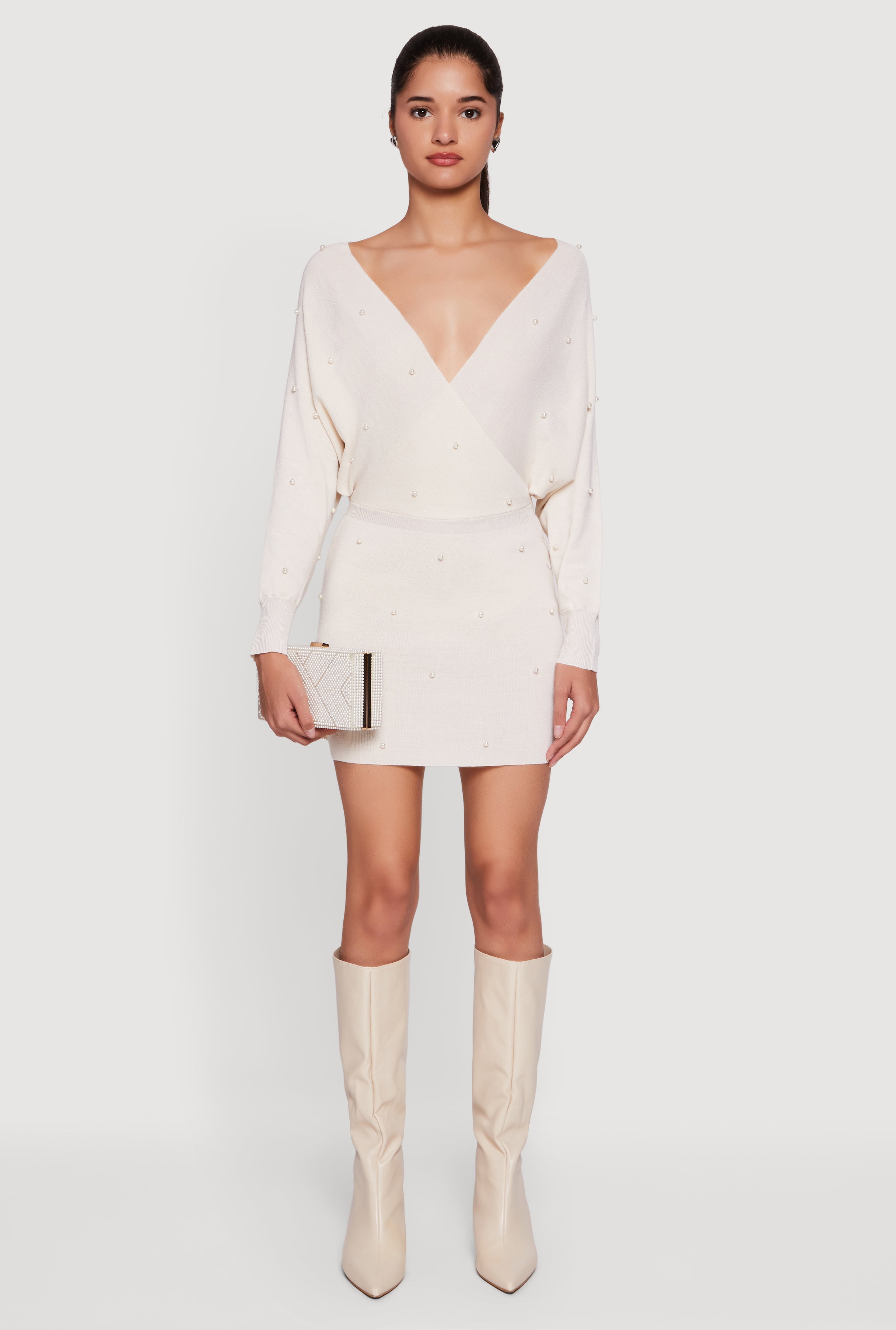 Faux Pearl Studded Faux Wrap Sweater Dress