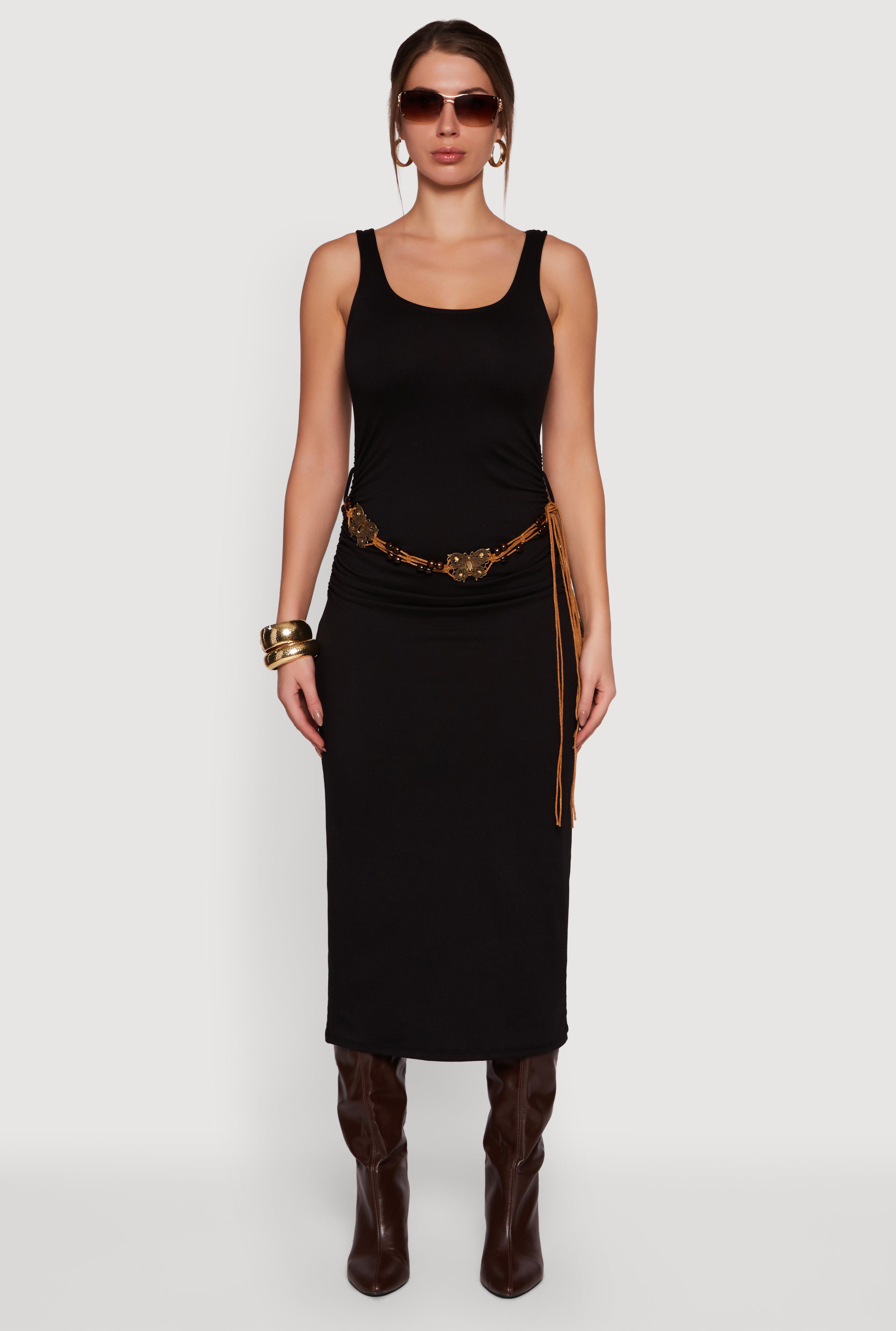 Sleeveless Ruched Maxi Dress with Beaded Boho Belt