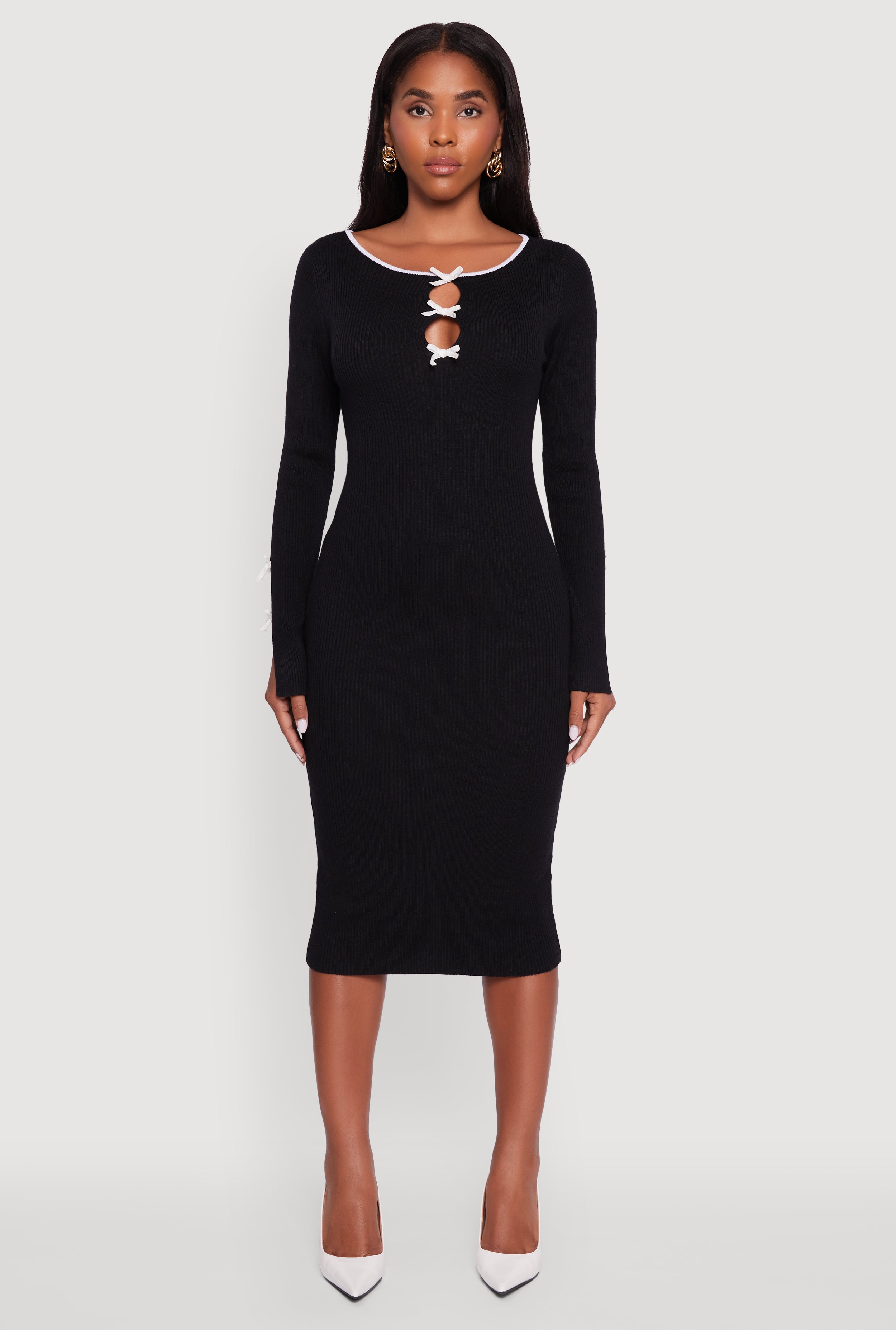 Ribbed Knit Bow Detail Sweater Midi Dress