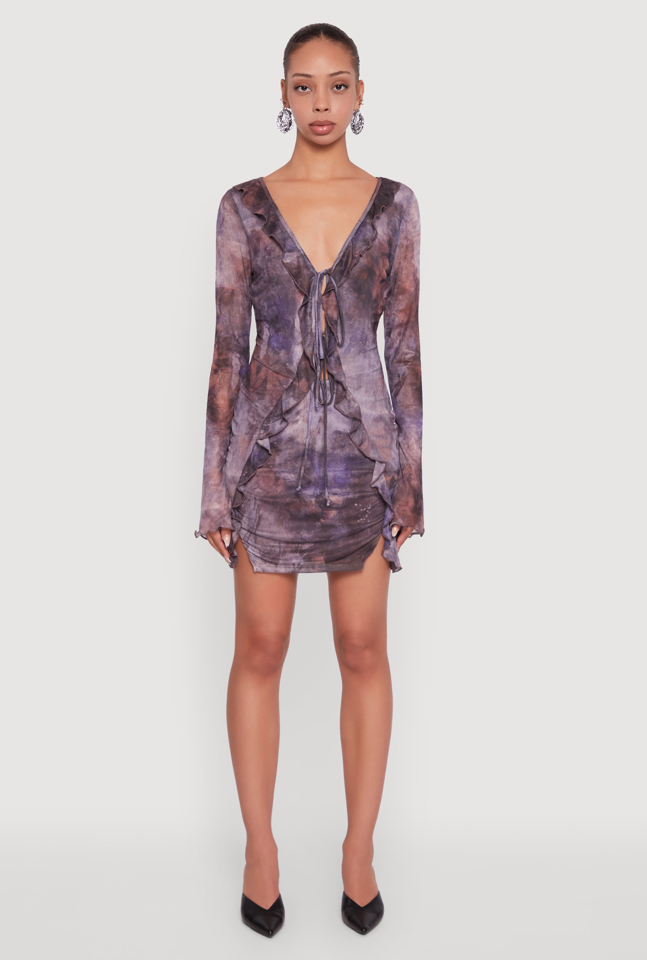 Ruffle Mesh Tie Front Bodycon Dress