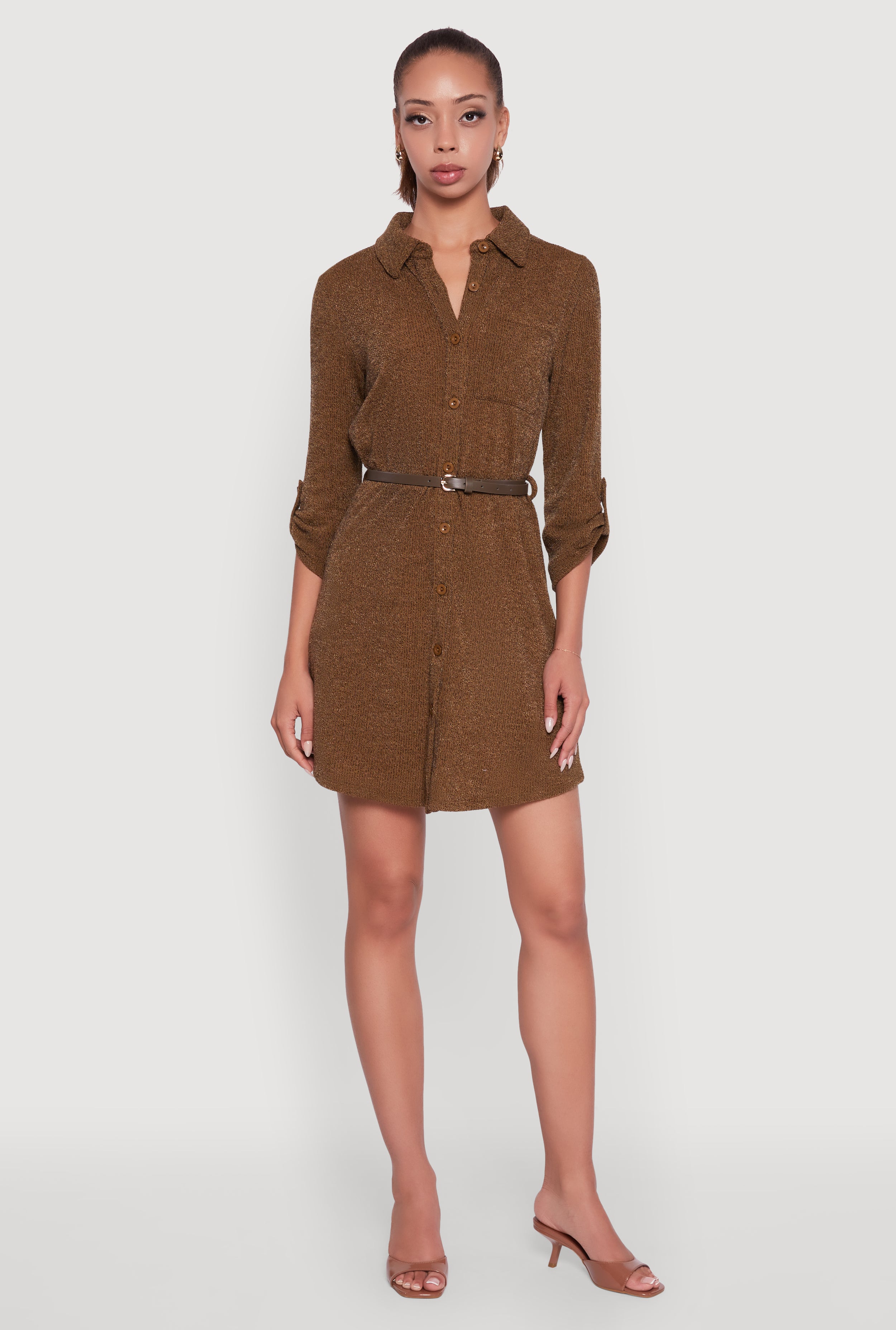 Marled Brushed Rib Knit Shirt Dress with Belt
