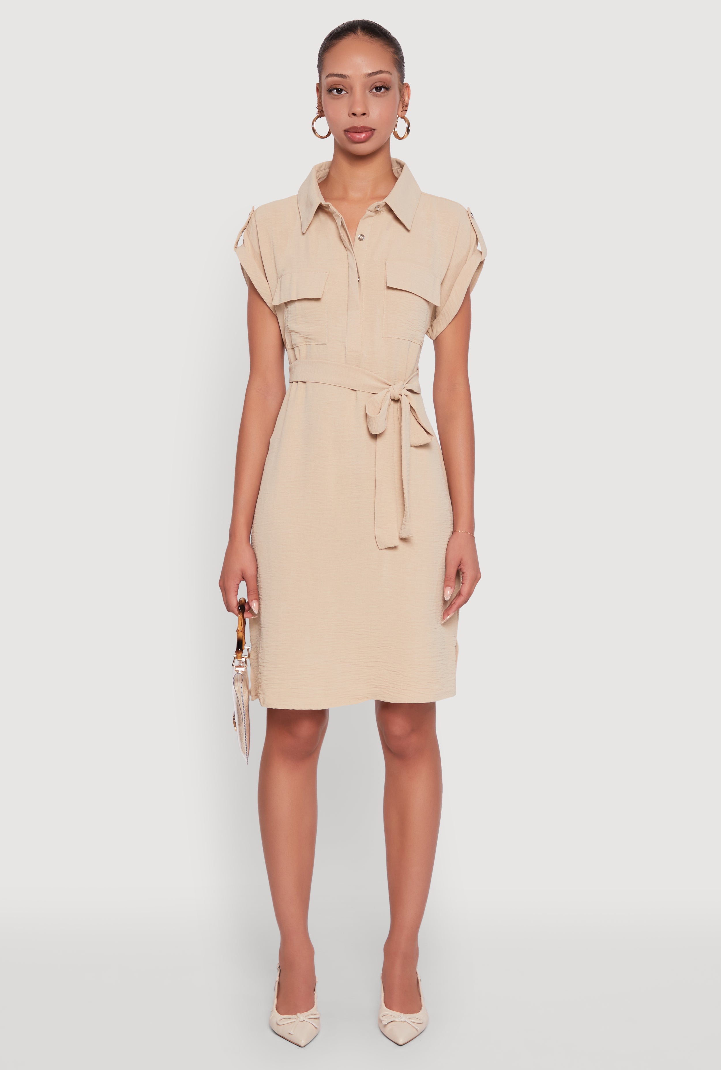 Tabbed Sleeve Belted Button Front Shirt Dress