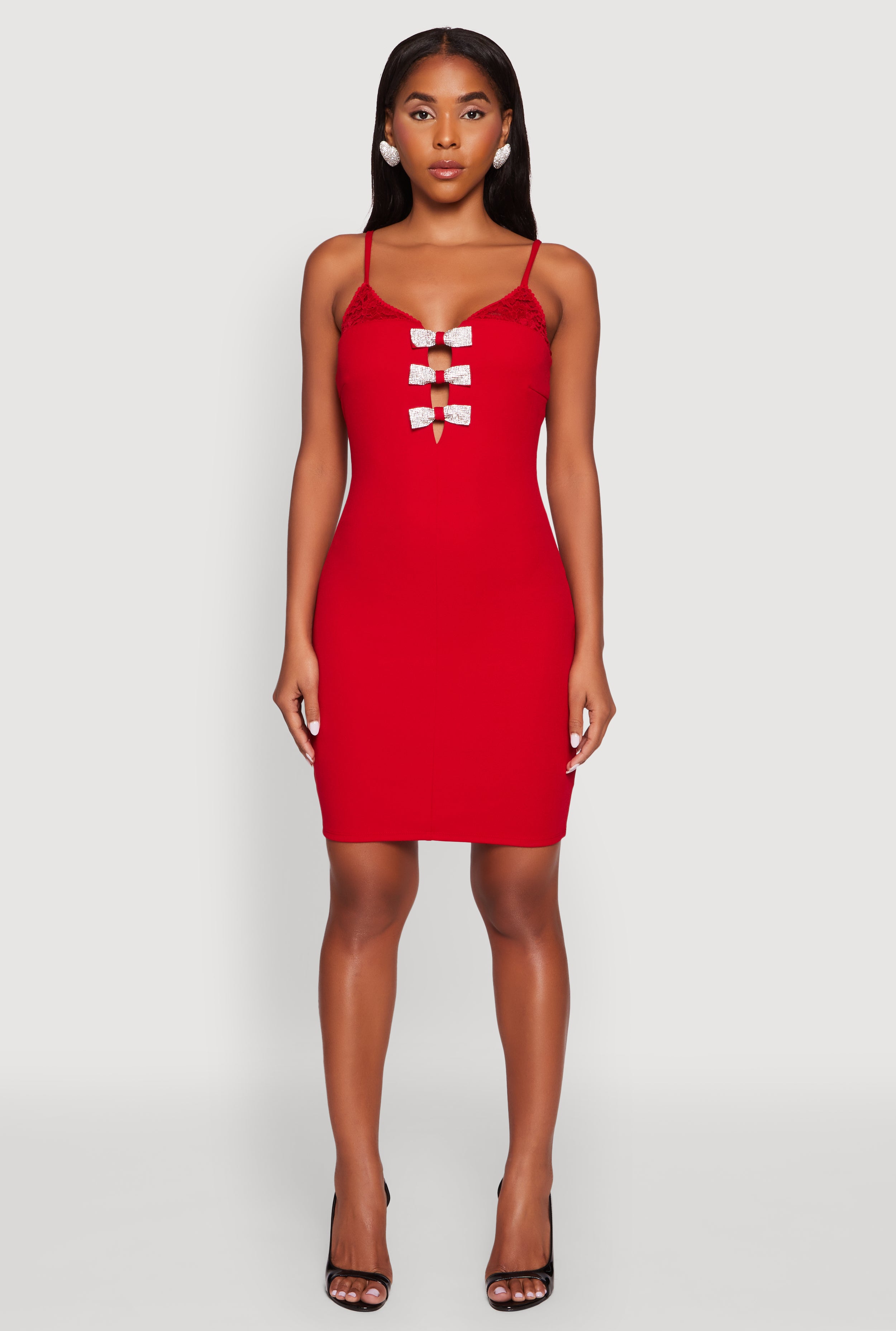 Sleeveless Crepe Knit Mini Dress with Rhinestone Bows