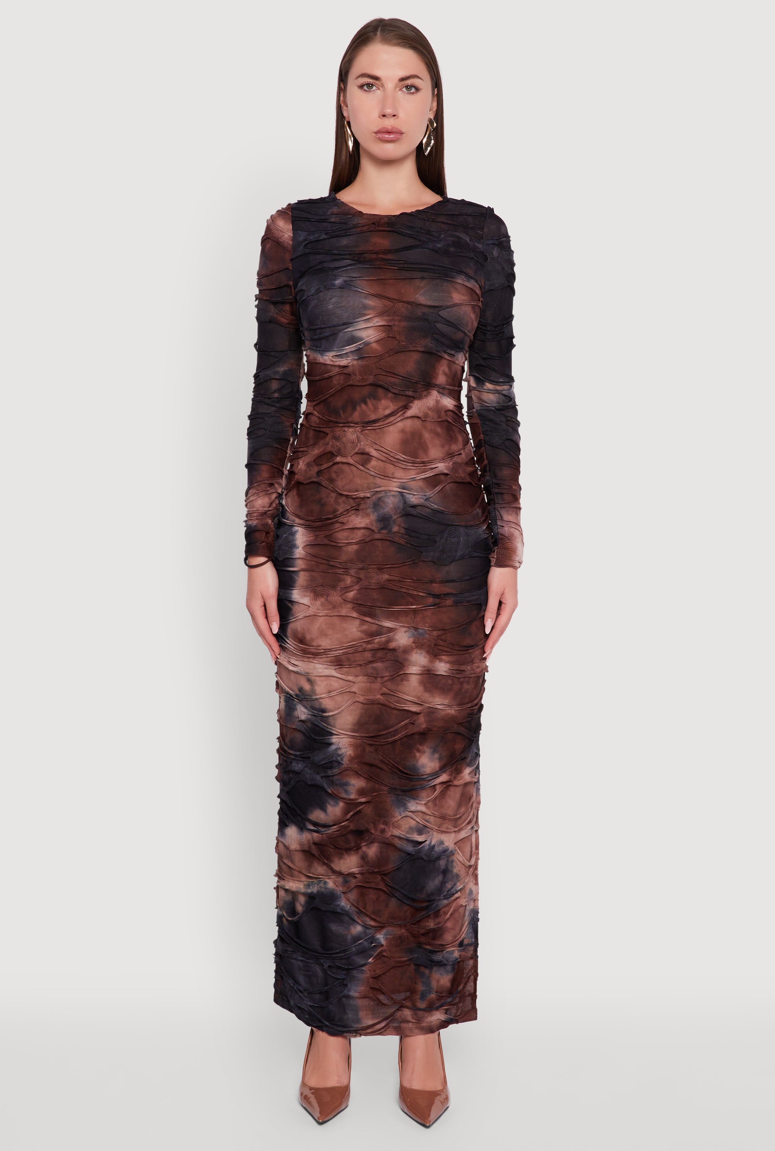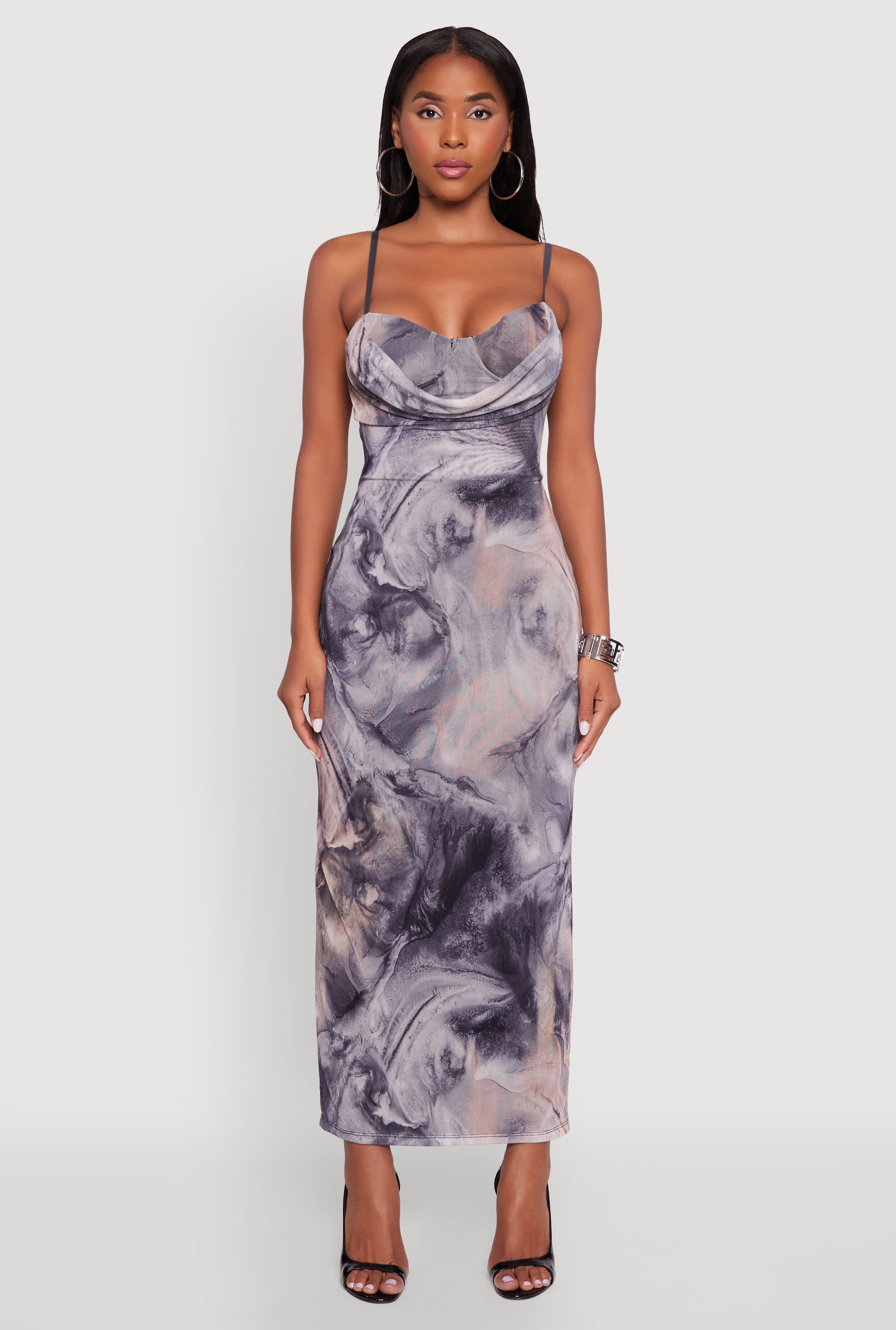 Printed Pattern Open Back Cowl Neck Mesh Maxi Dress