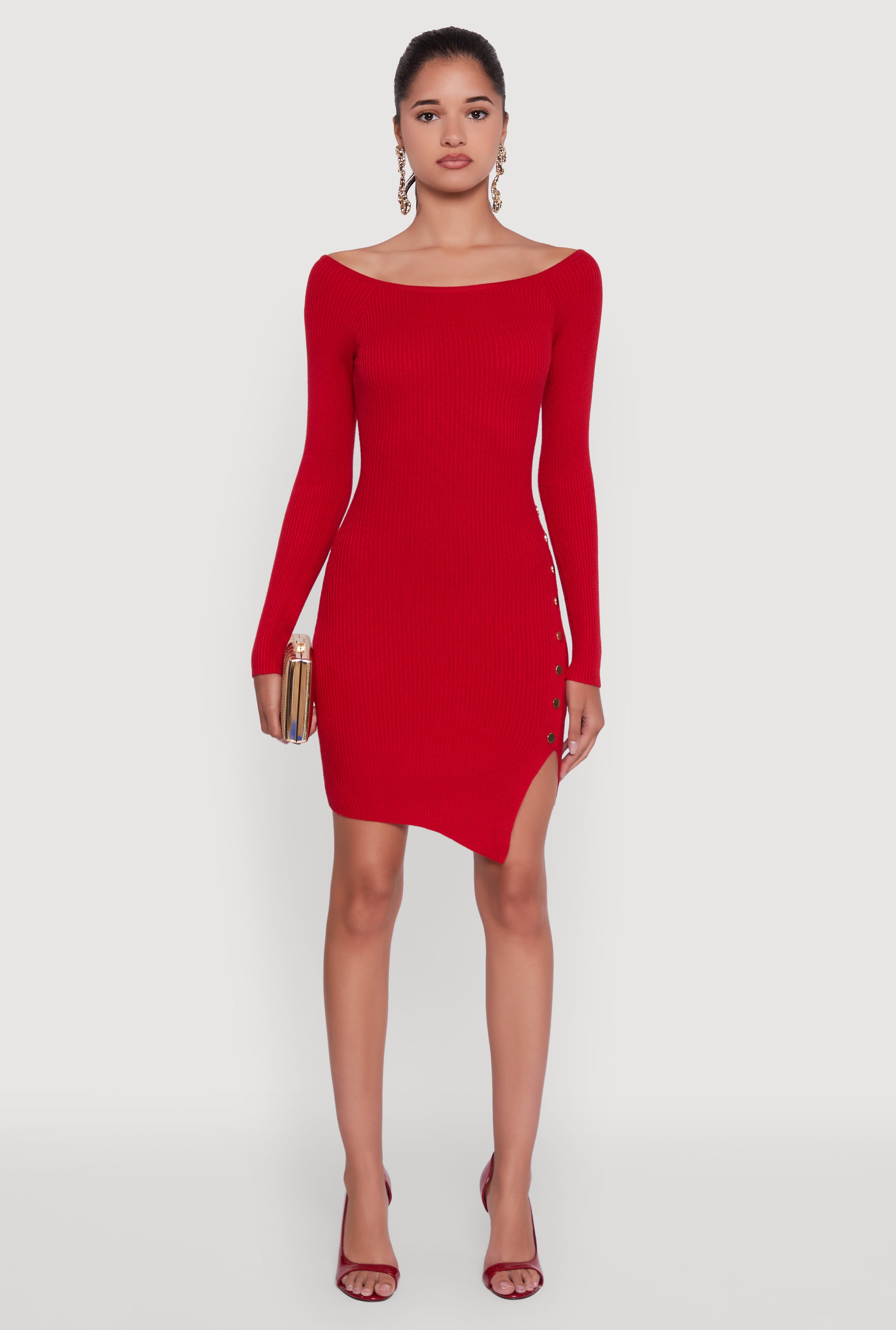 Metallic Button Detail Side Slit Boat Neck Sweater Dress