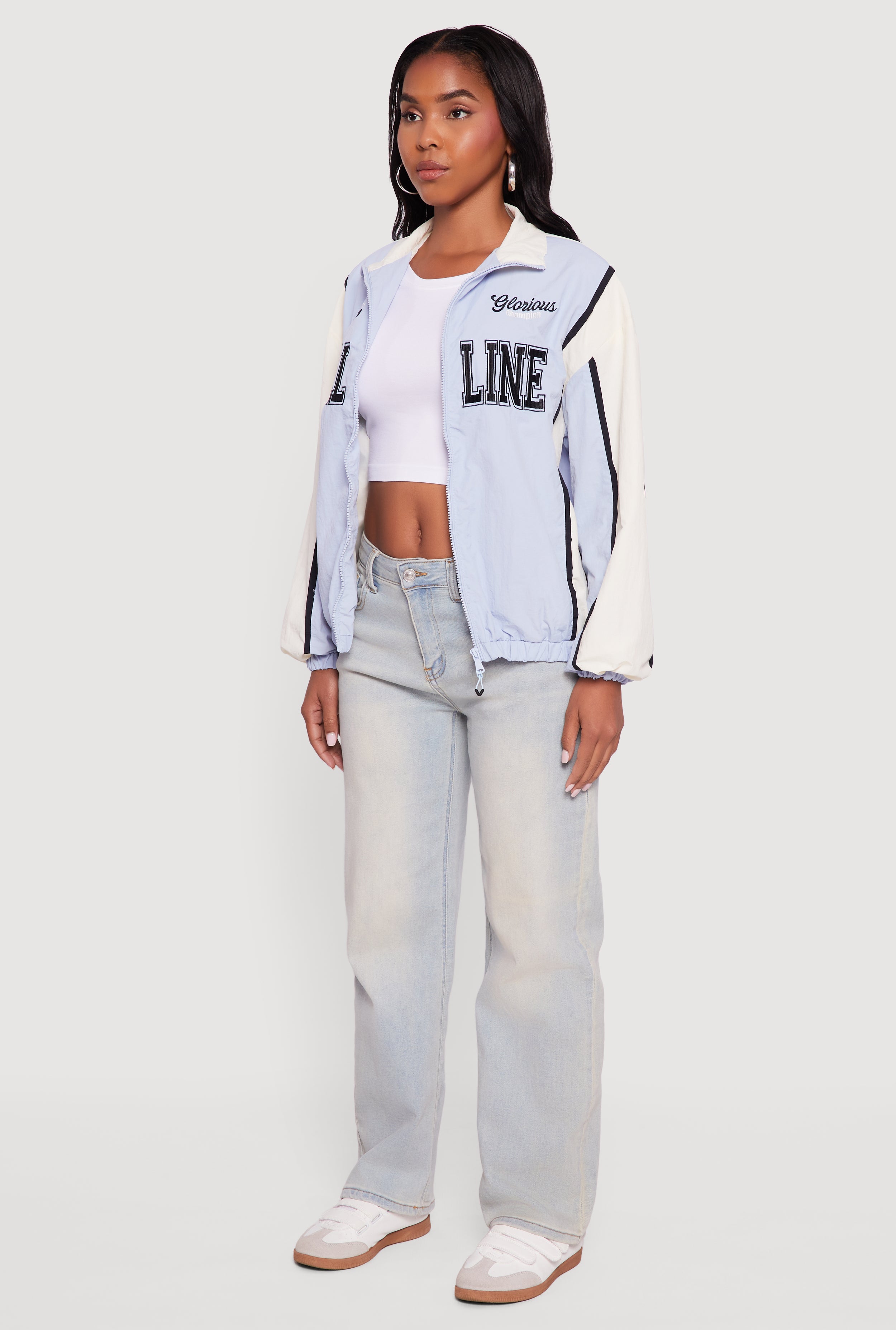 Step up your casual game with the Color Blocked Goal Line Graphic Windbreaker Jacket. This lightweight nylon jacket is your new go-to for athleisure vibes that effortlessly blend sporty and street style. Featuring bold color blocking and a standout "Glorious Champion Goal Line Track Star" graphic, it’s designed to keep you looking fresh whether you’re hitting the track or the town. The mock neck and long sleeves add a sleek touch while the zipper closure makes it easy to layer on the move. Ready to turn heads without breaking the bank?