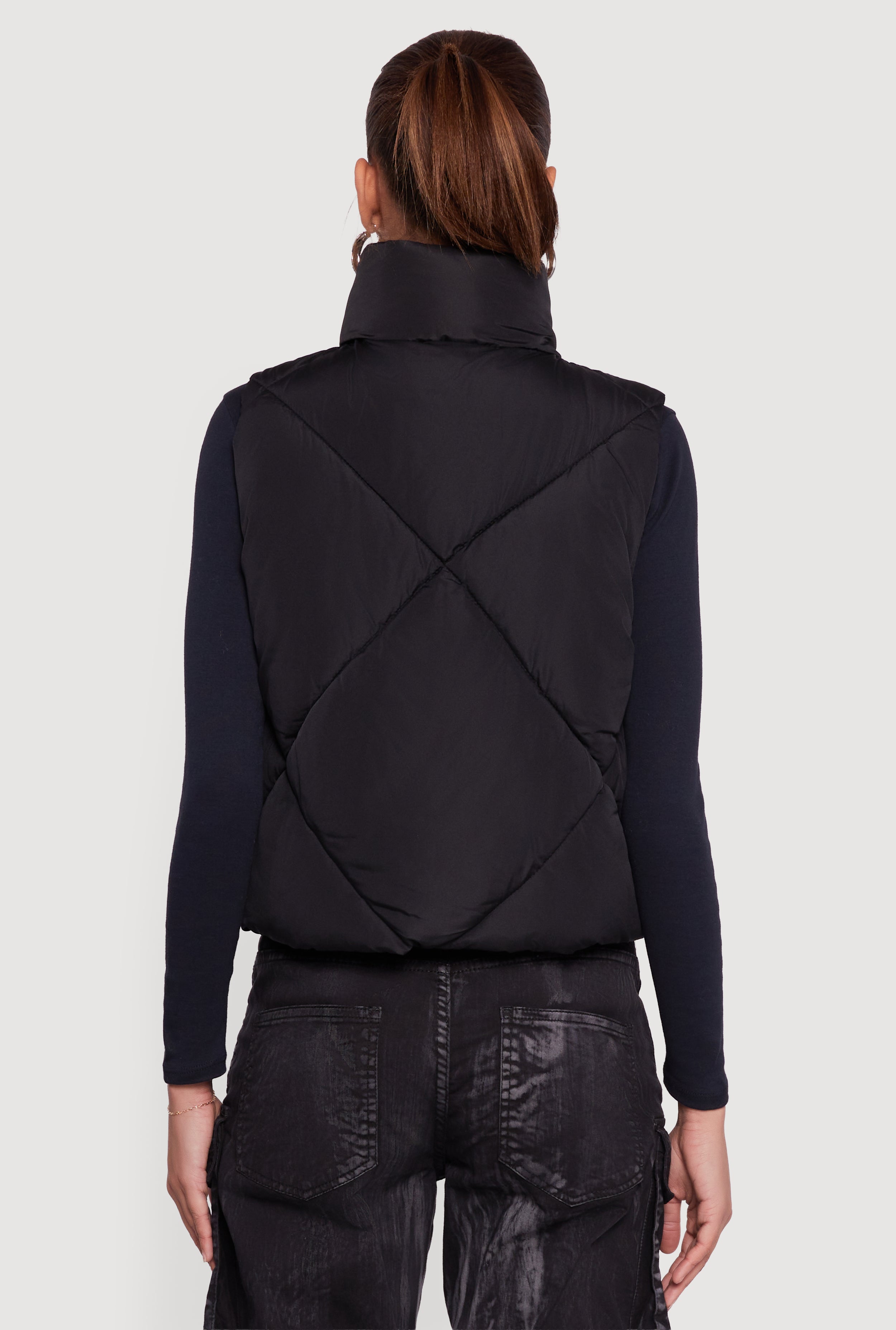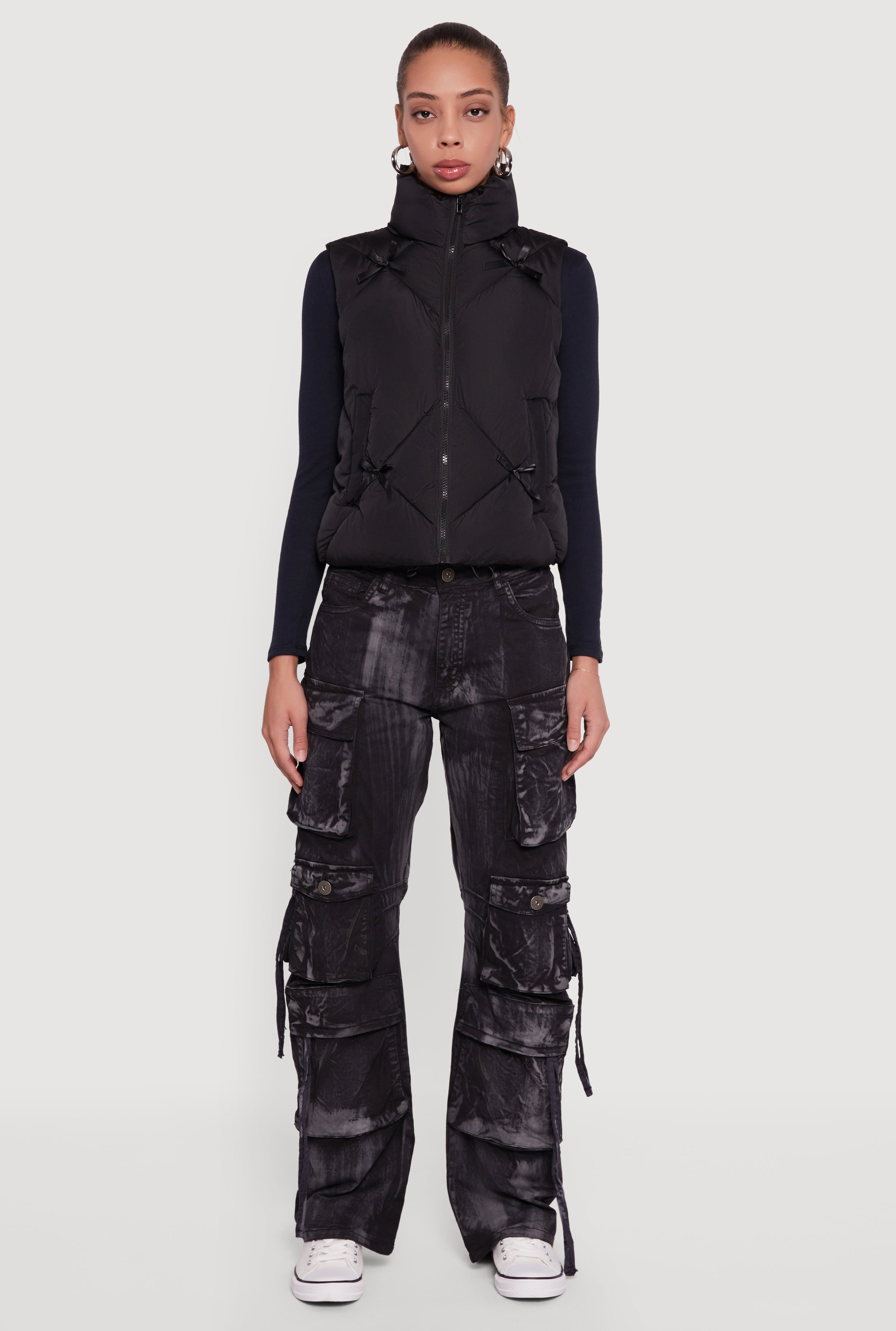 Stay cozy and cute in the Almost Famous Quilted Puffer Vest with Bows. This sleeveless vest features a trendy mock neck and charming bow details that add a playful touch to your outerwear game. Designed with a zip front and adjustable toggle drawstring hem, it lets you customize your fit while keeping the chill out. Perfect for layering over your favorite tops, this quilted puffer vest blends warmth and style effortlessly.